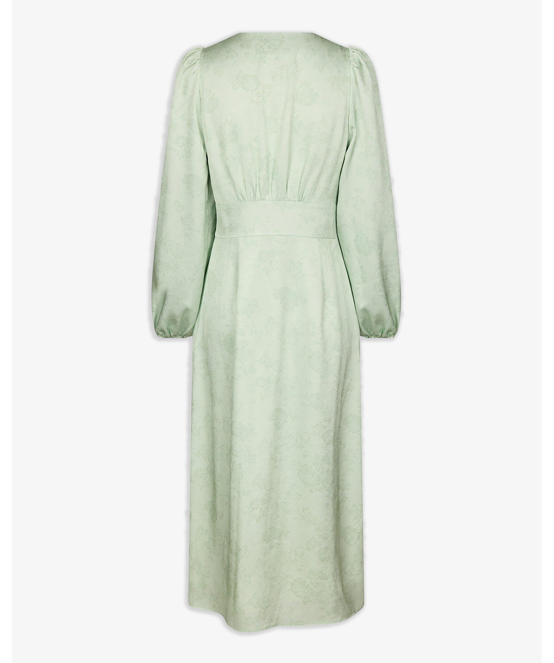 Ljusgrön klänning i en fin polyesterkvalitet. Klänningen har v-ringning, långa lösa ärmar och knappar längs framsidan. Modellen är 176 cm lång och bär storlek 36.