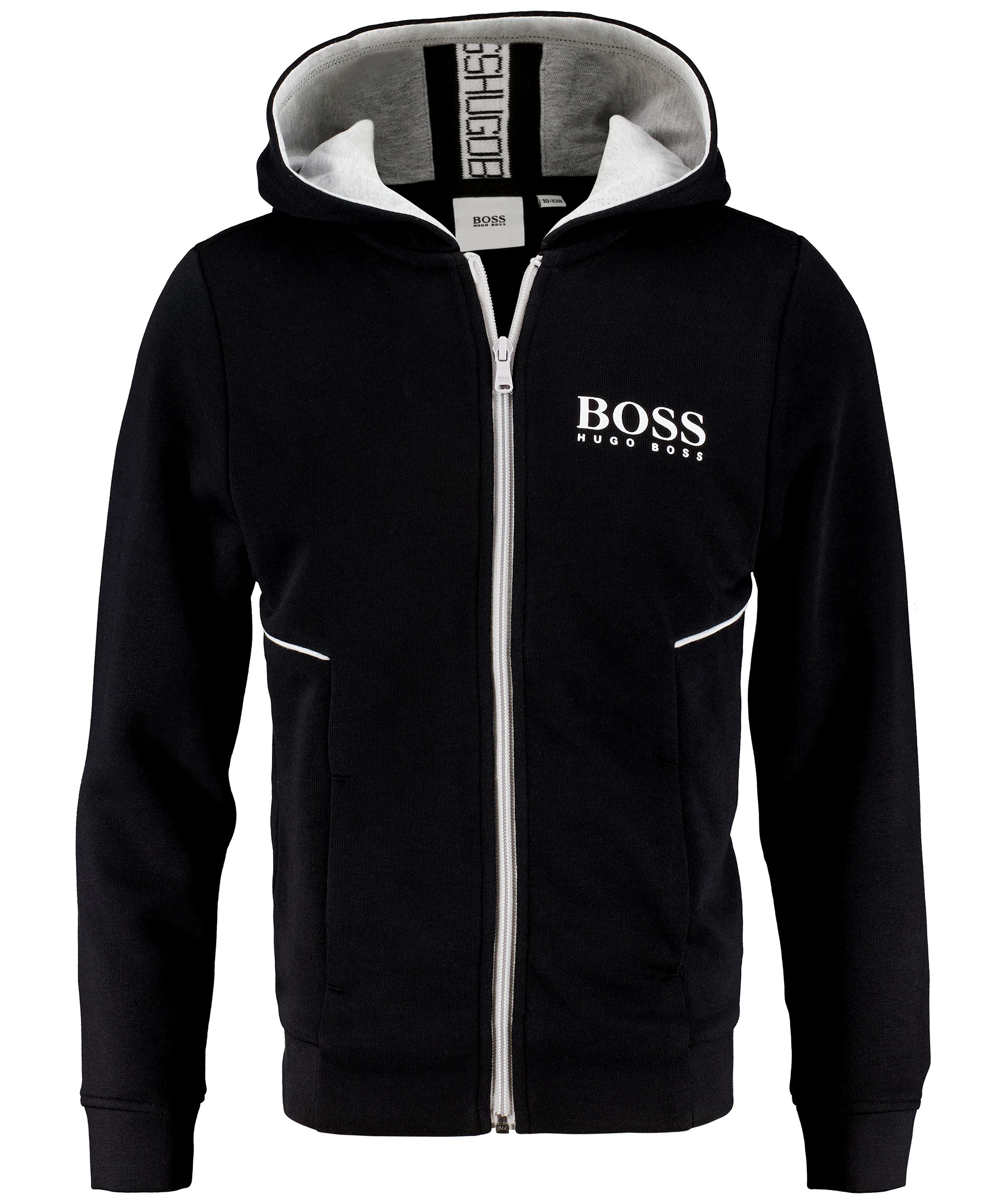 Svart hoodie med dragkedja från Hugo Boss kids. Vit logga tryckt på bröstet, fickor på magen, muddar i ärmslut och plaggslut. Ljusgrå dragkedja och ljusgrått tyg inuti luvan med en svart och vit randig revär i mitten av luvan med logotyper. Tillverkad i bomullsmix. OBS! Juniormodell. *Tryckt logga *Fickor på magen *Grått tyg och revär med logotyper i luvan