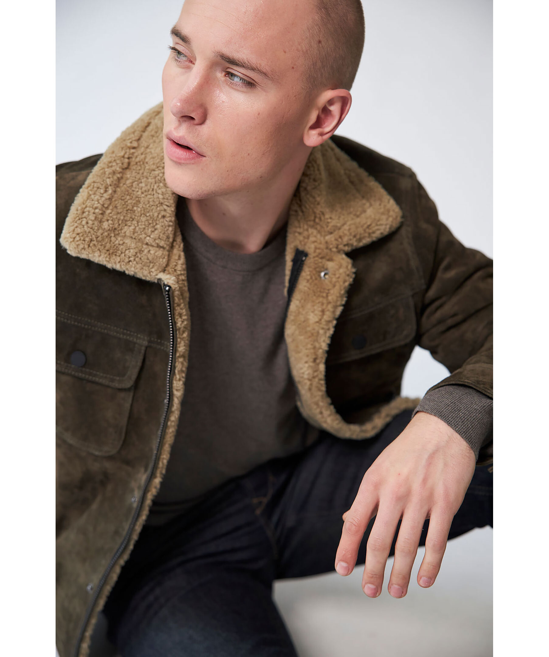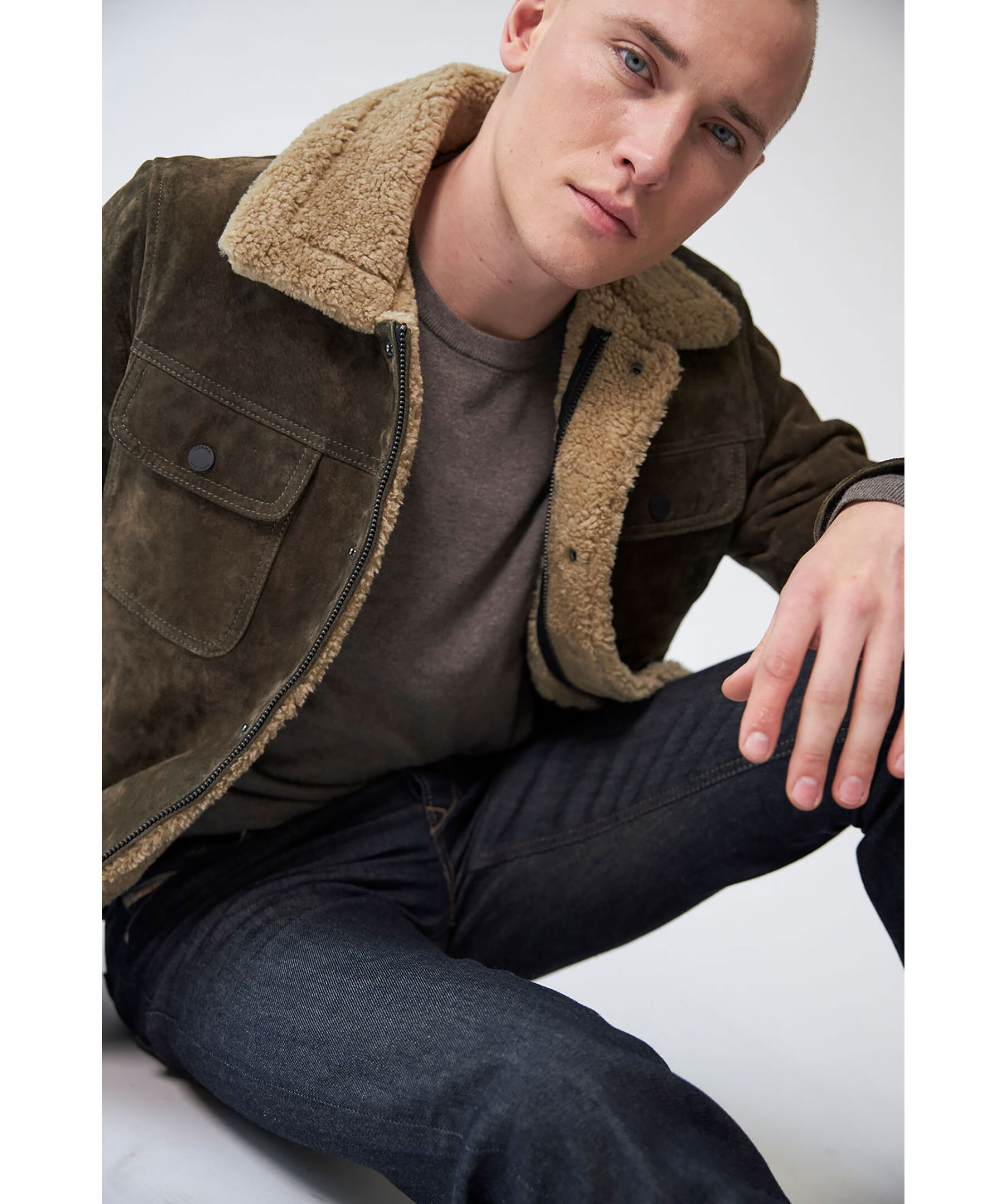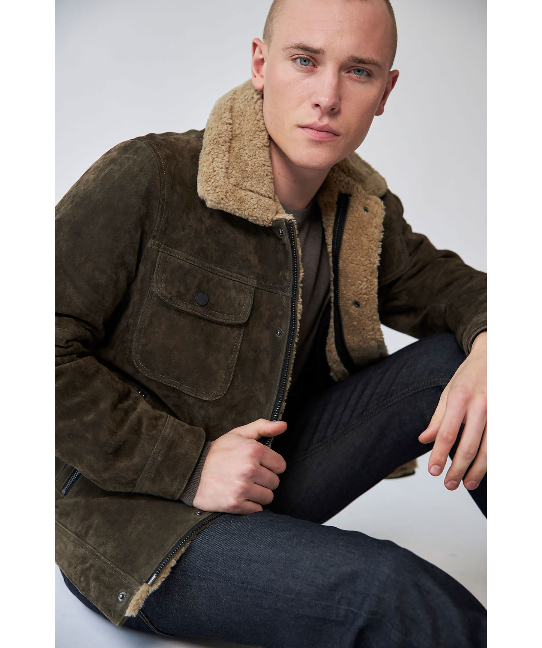Med fickor med flikar på bröstet och en modern retrokänsla, kombinerar denna åtsittande mockajacka designelement från både den klassiska jeansjackan och läderaviatorn. Tillverkad i mjukt mocka, varm vaddering och avslutad med sherpa-päls, är det den perfekta plagget för kyliga höstdagar.