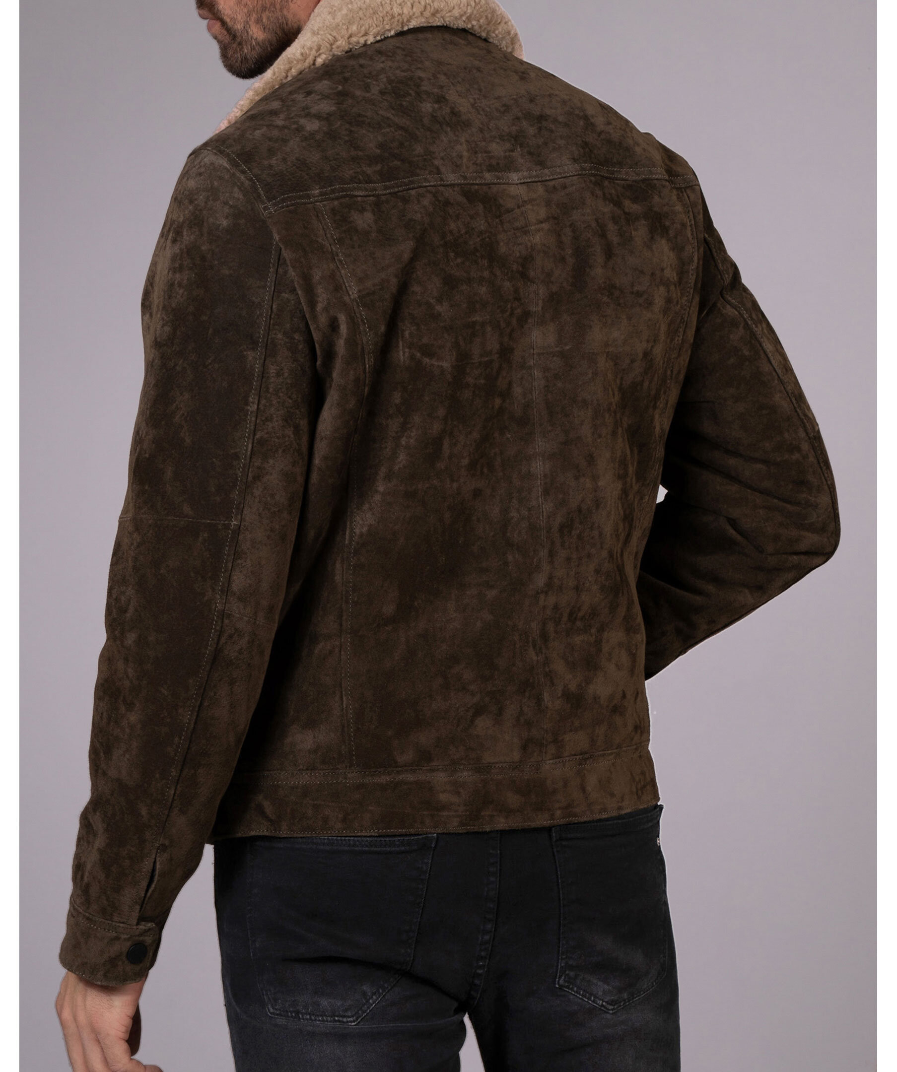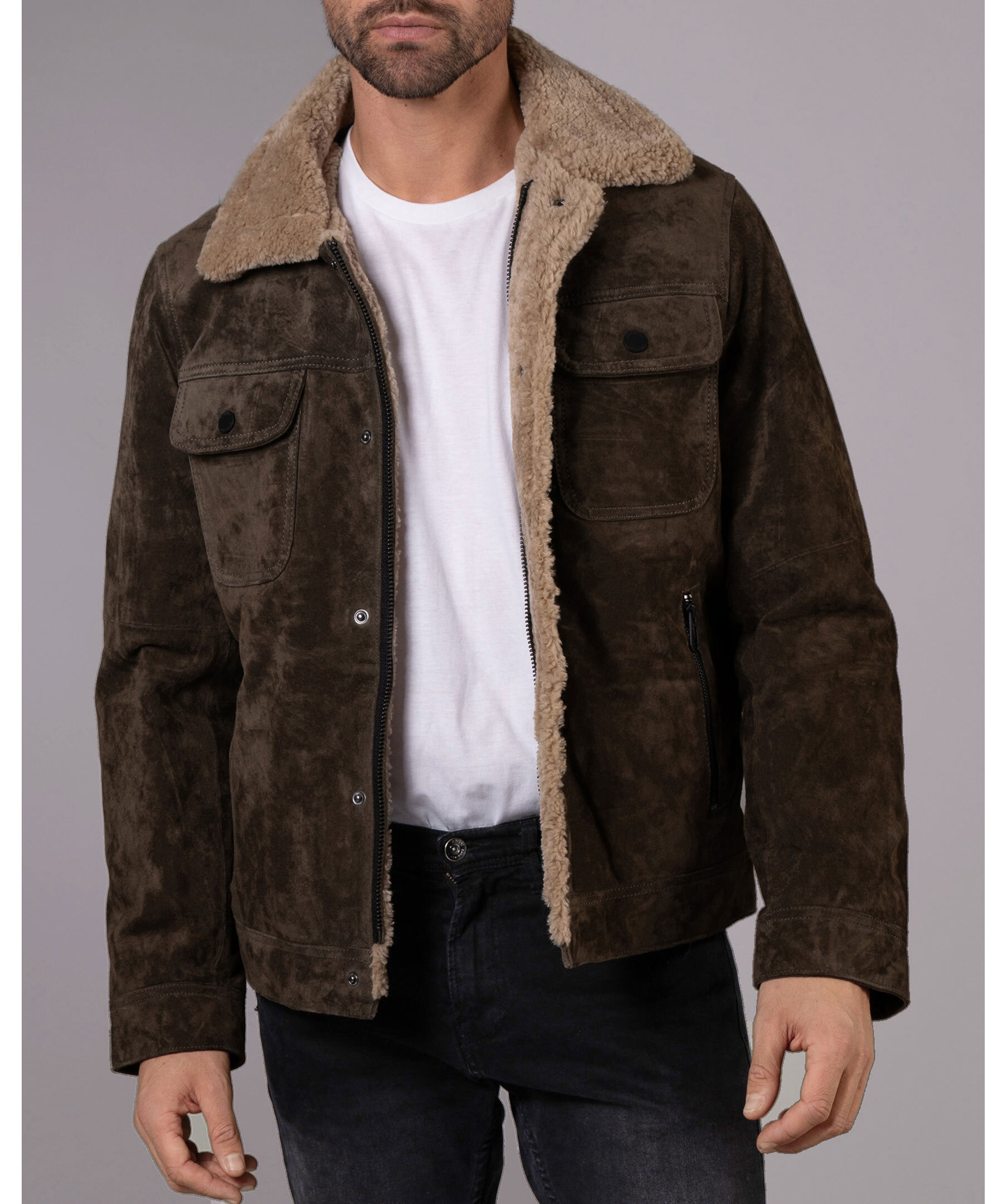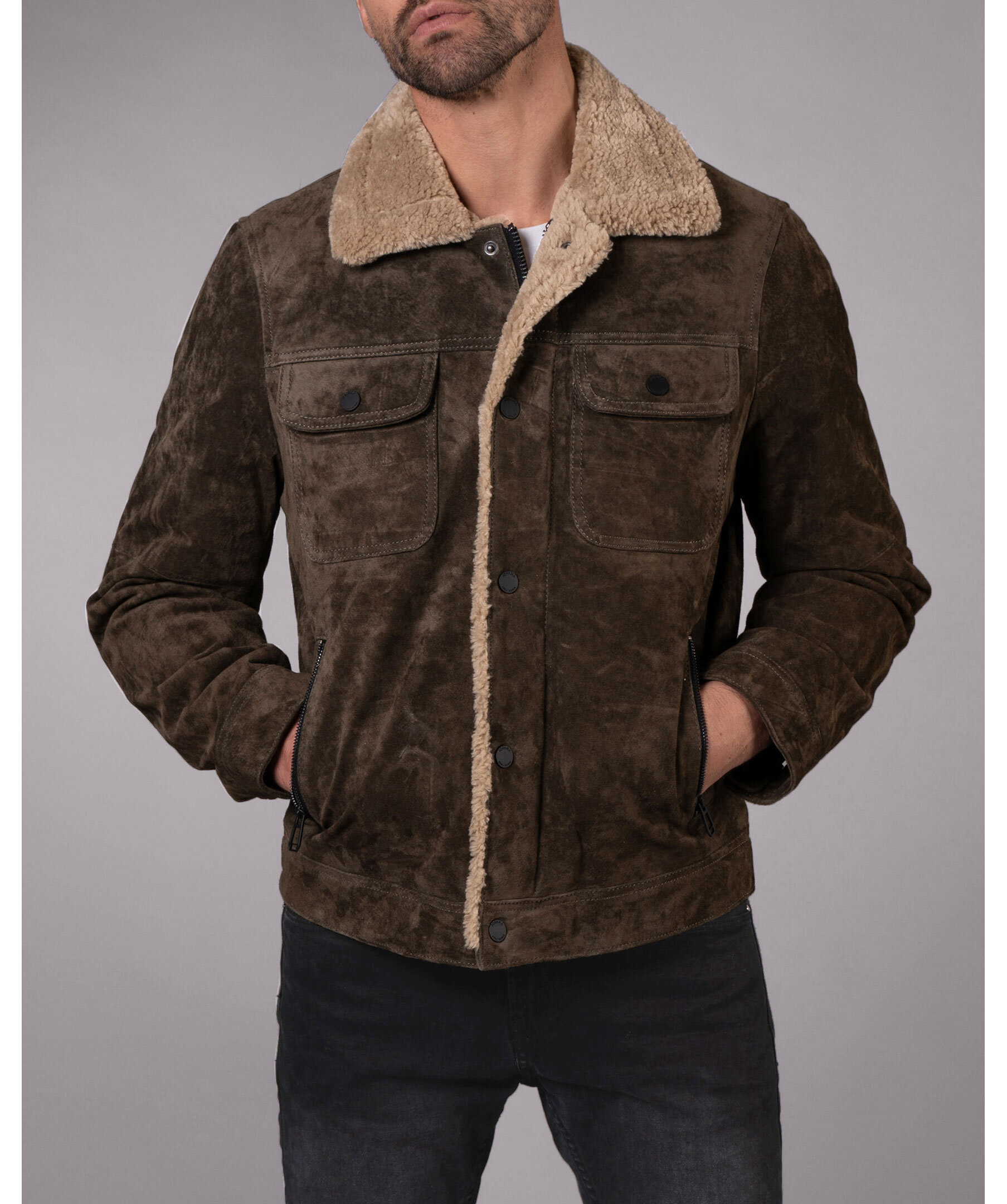 Med fickor med flikar på bröstet och en modern retrokänsla, kombinerar denna åtsittande mockajacka designelement från både den klassiska jeansjackan och läderaviatorn. Tillverkad i mjukt mocka, varm vaddering och avslutad med sherpa-päls, är det den perfekta plagget för kyliga höstdagar.