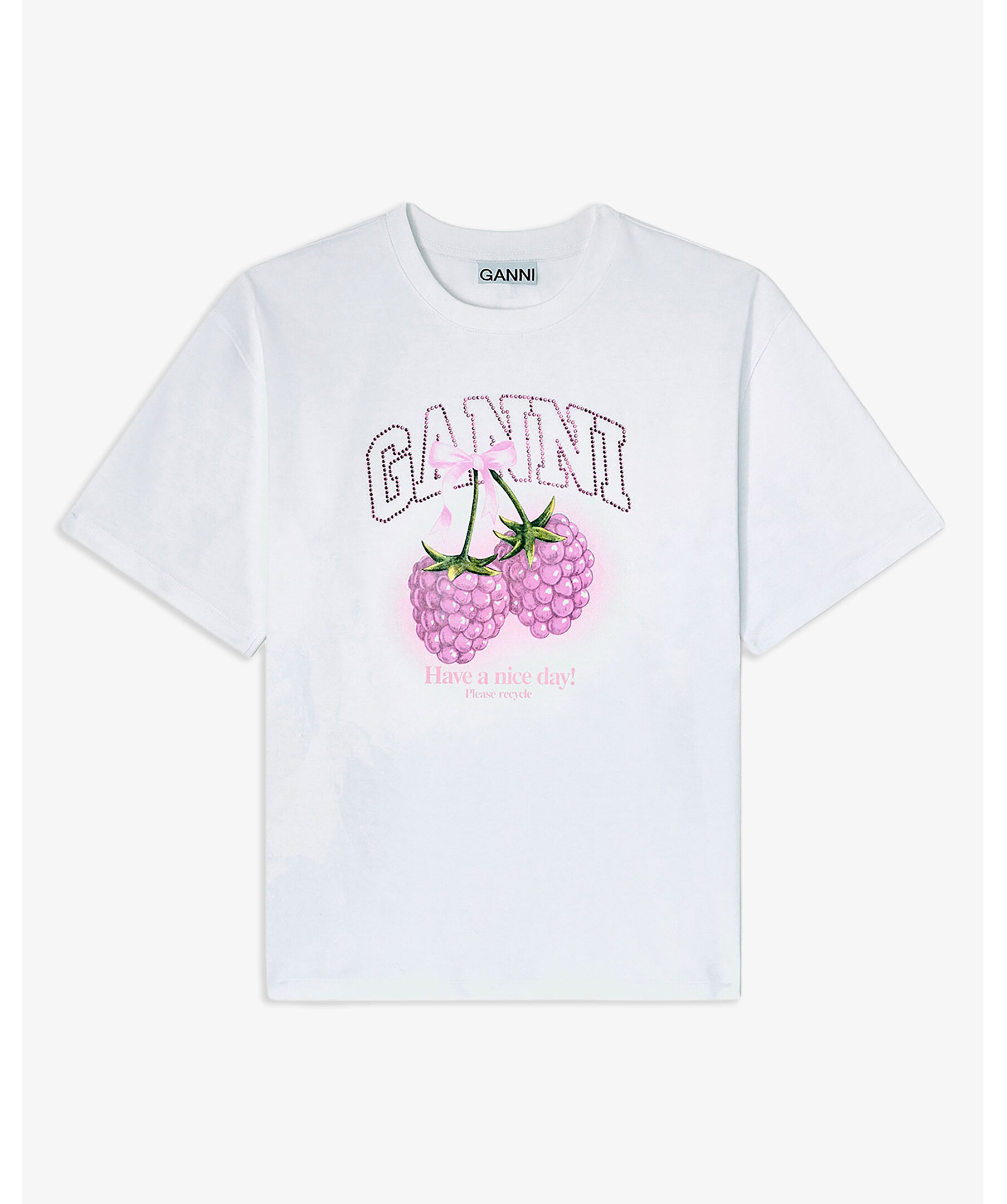 Vit t-shirt från GANNI. T-shirten har tryck med jordgubbar och texten "have a nice day! please recycle".