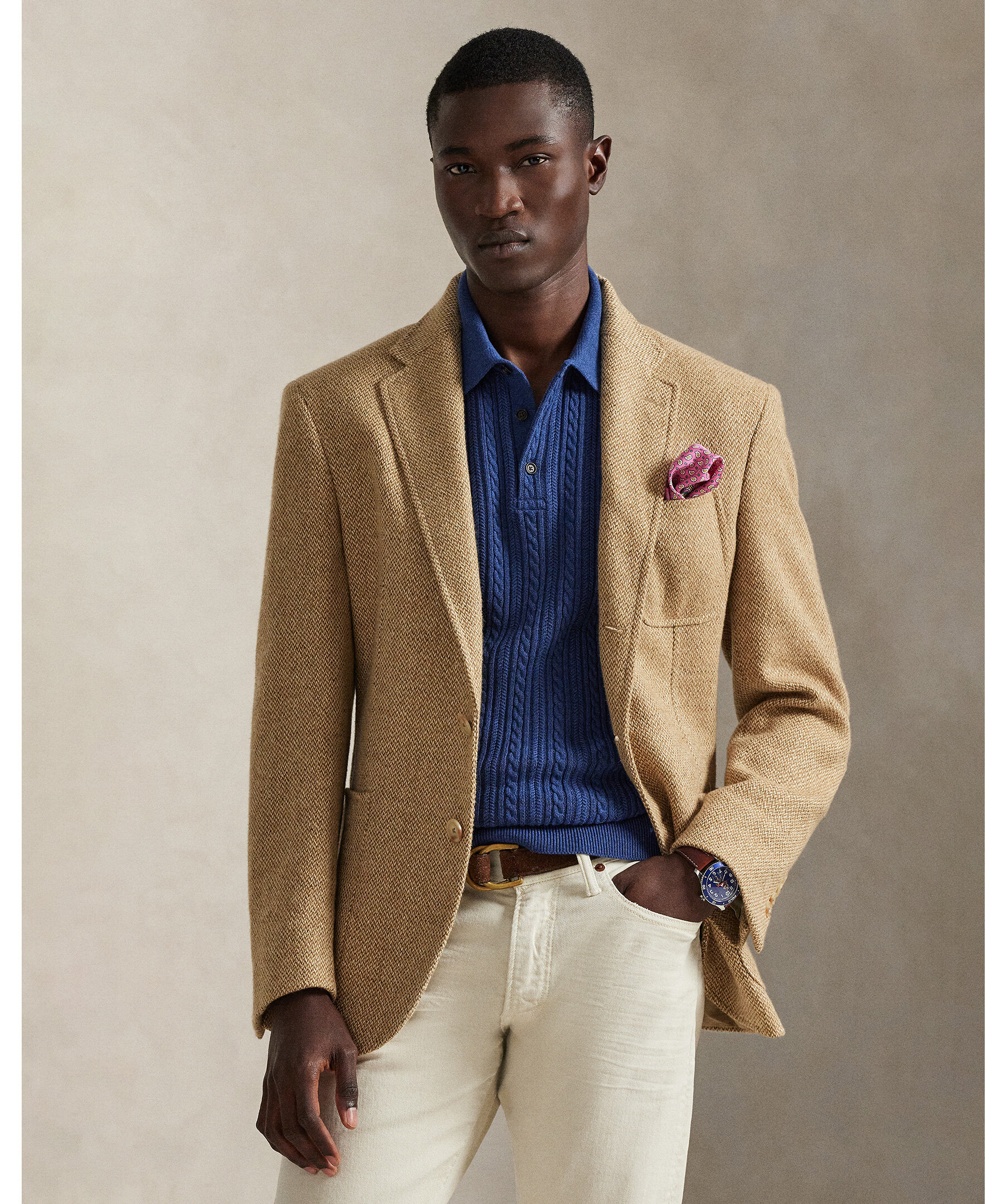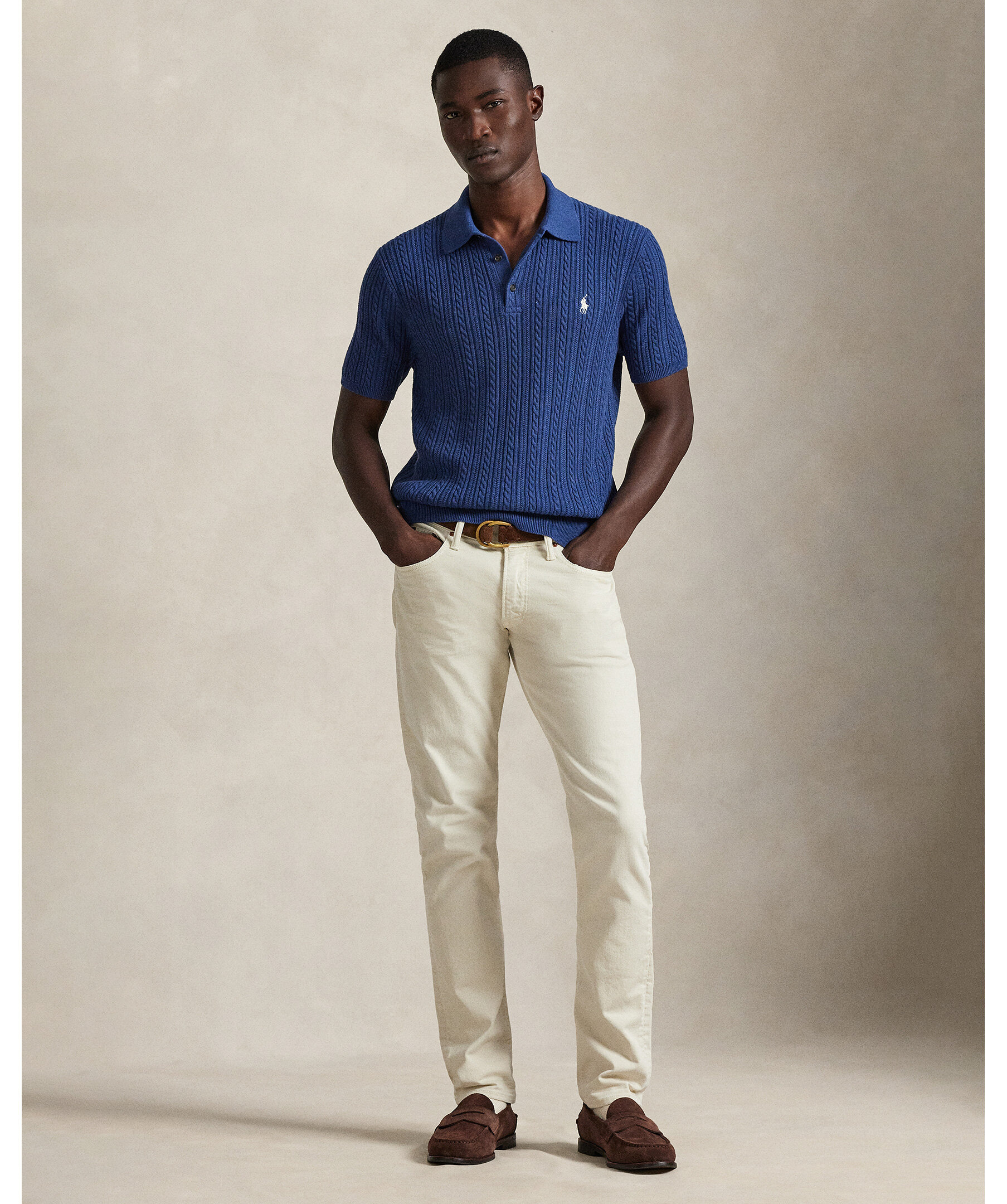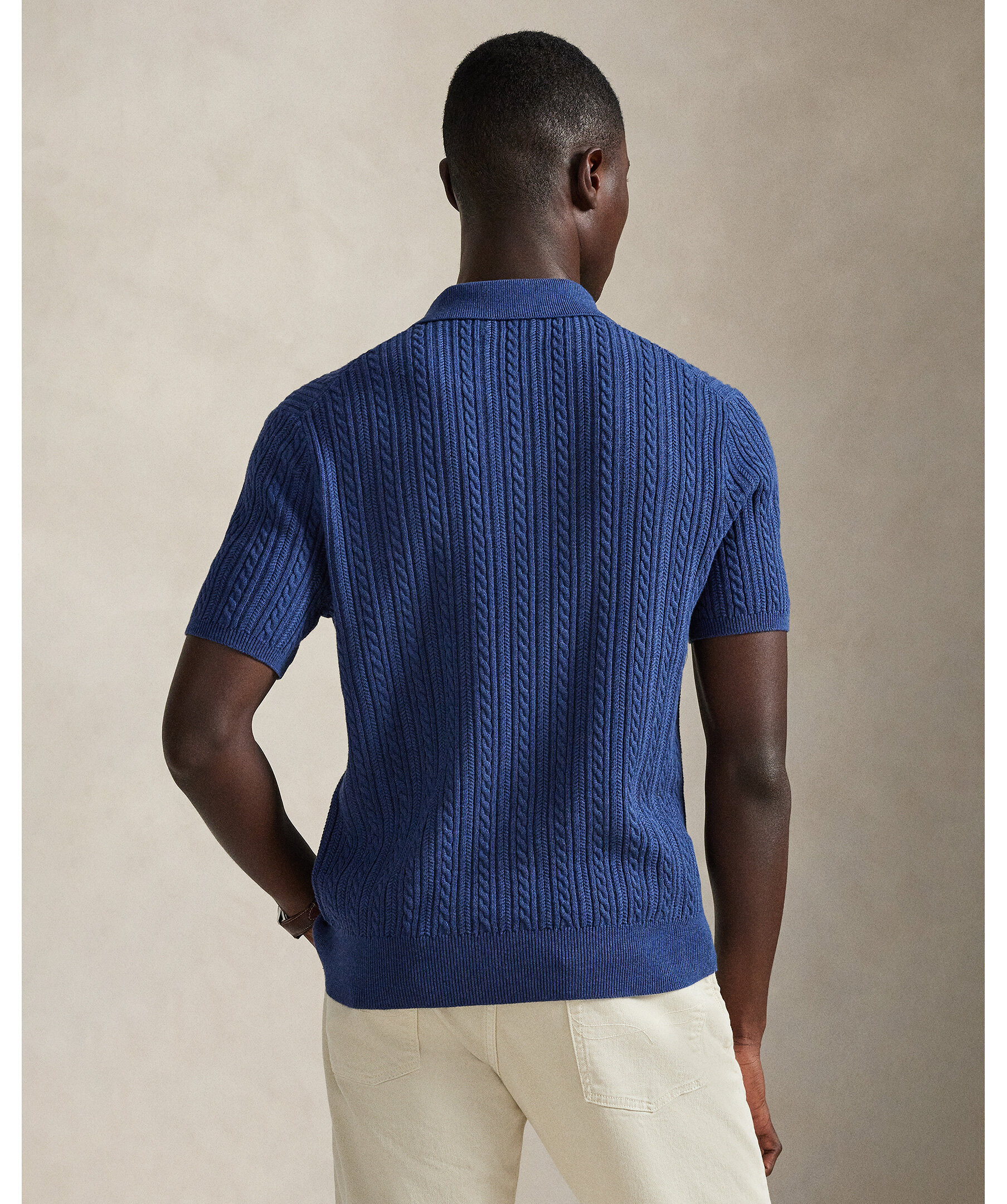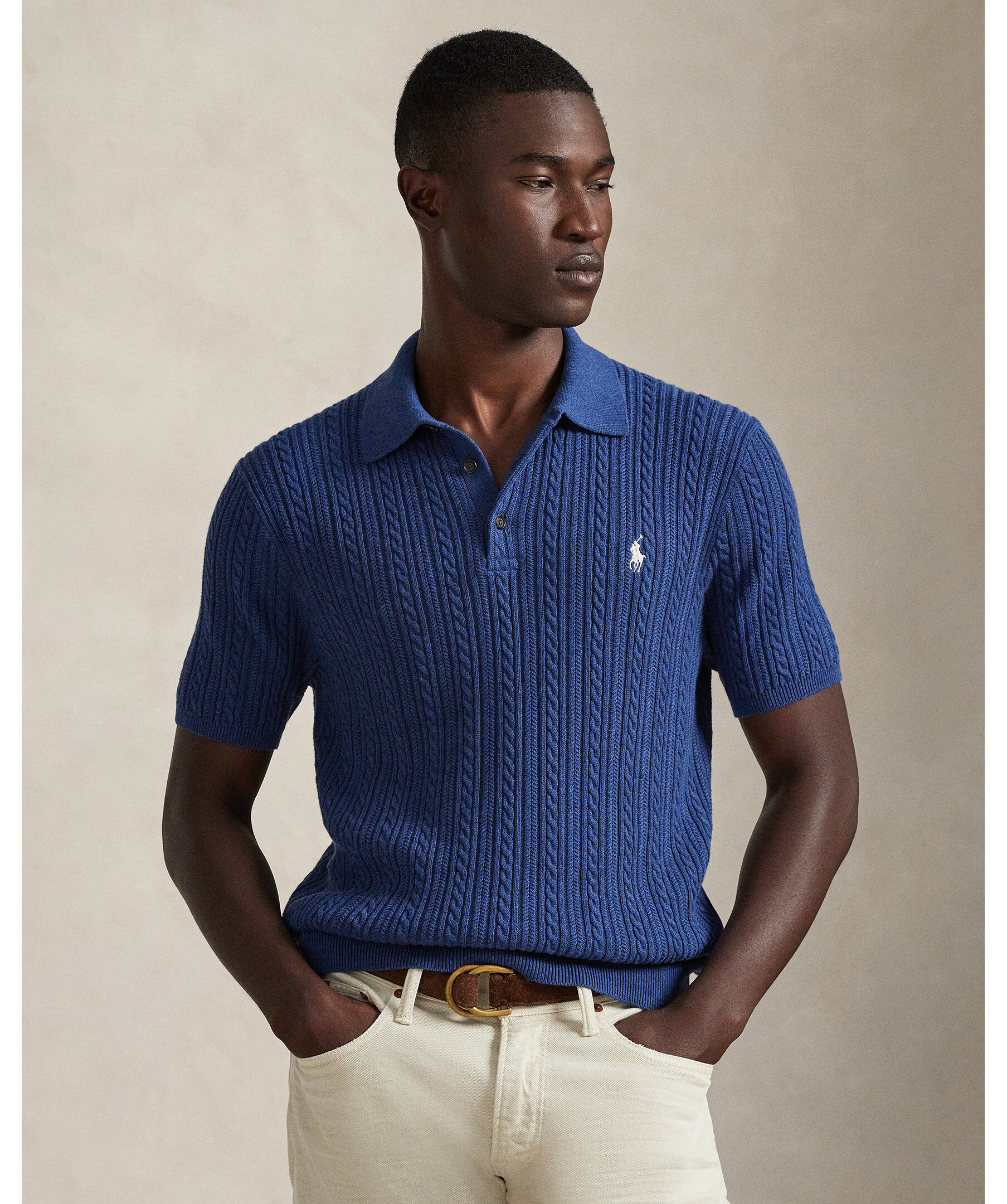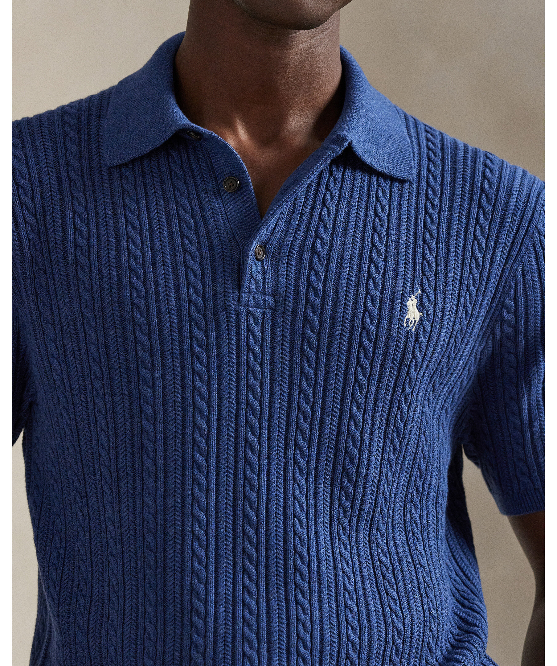 Mörkblå stickad piké från Polo Ralph Lauren. Den kombinerar en silhuett inspirerad av Ralph Laurens tidlösa pikétröja med fjäderlätt bomullsgarn som kammas med fina borstar, vilket resulterar i ett mjukare och mer slitstarkt plagg.