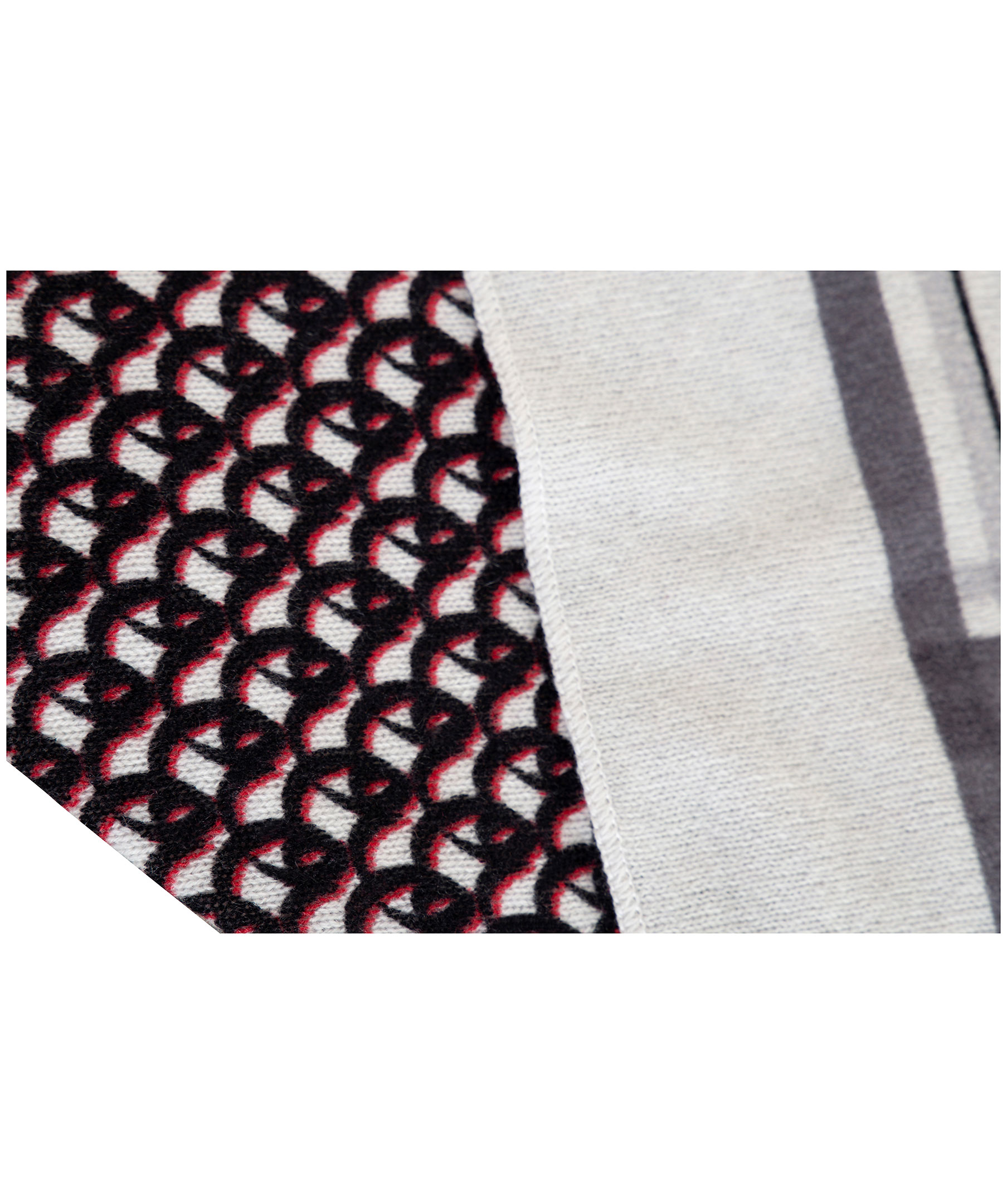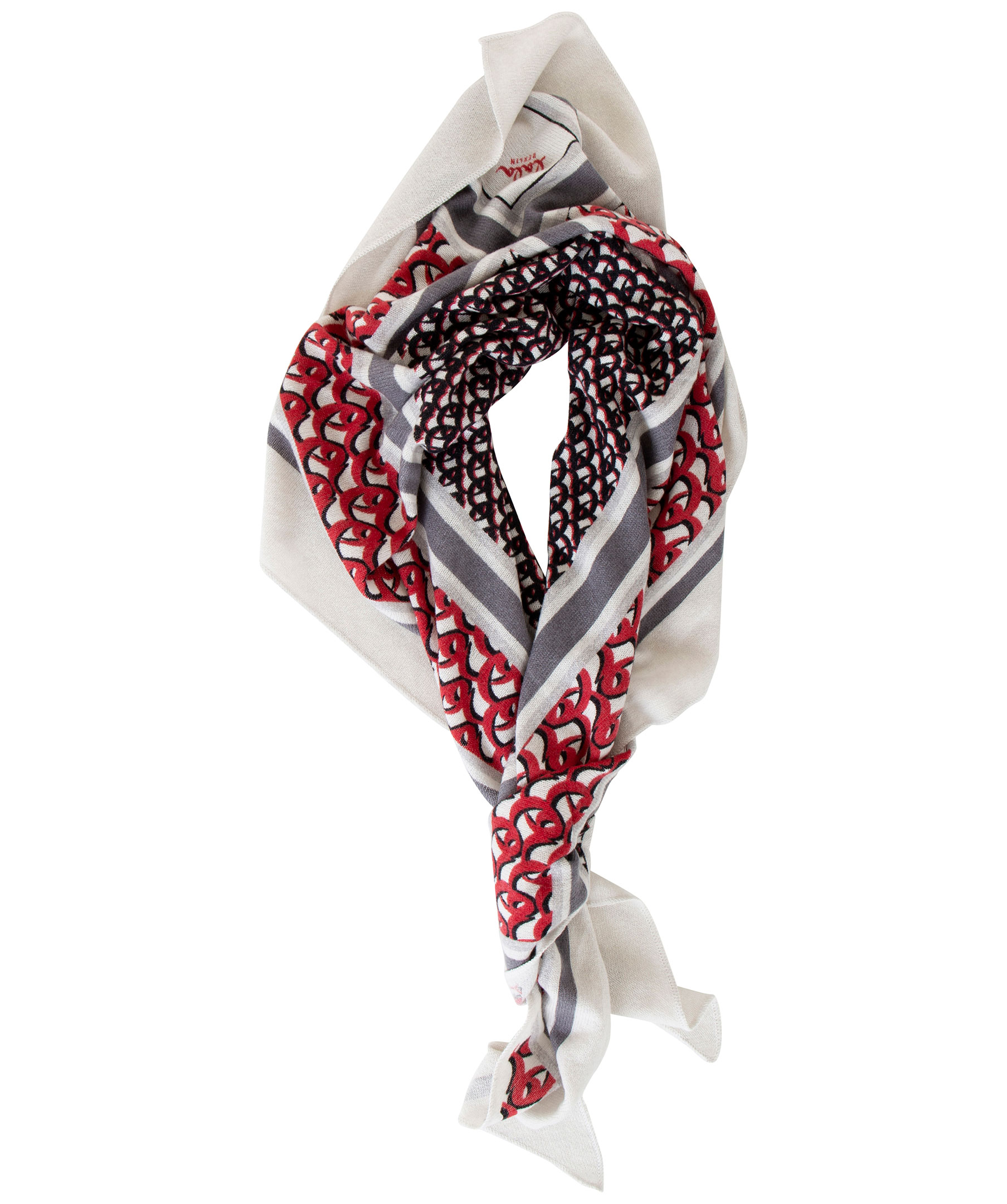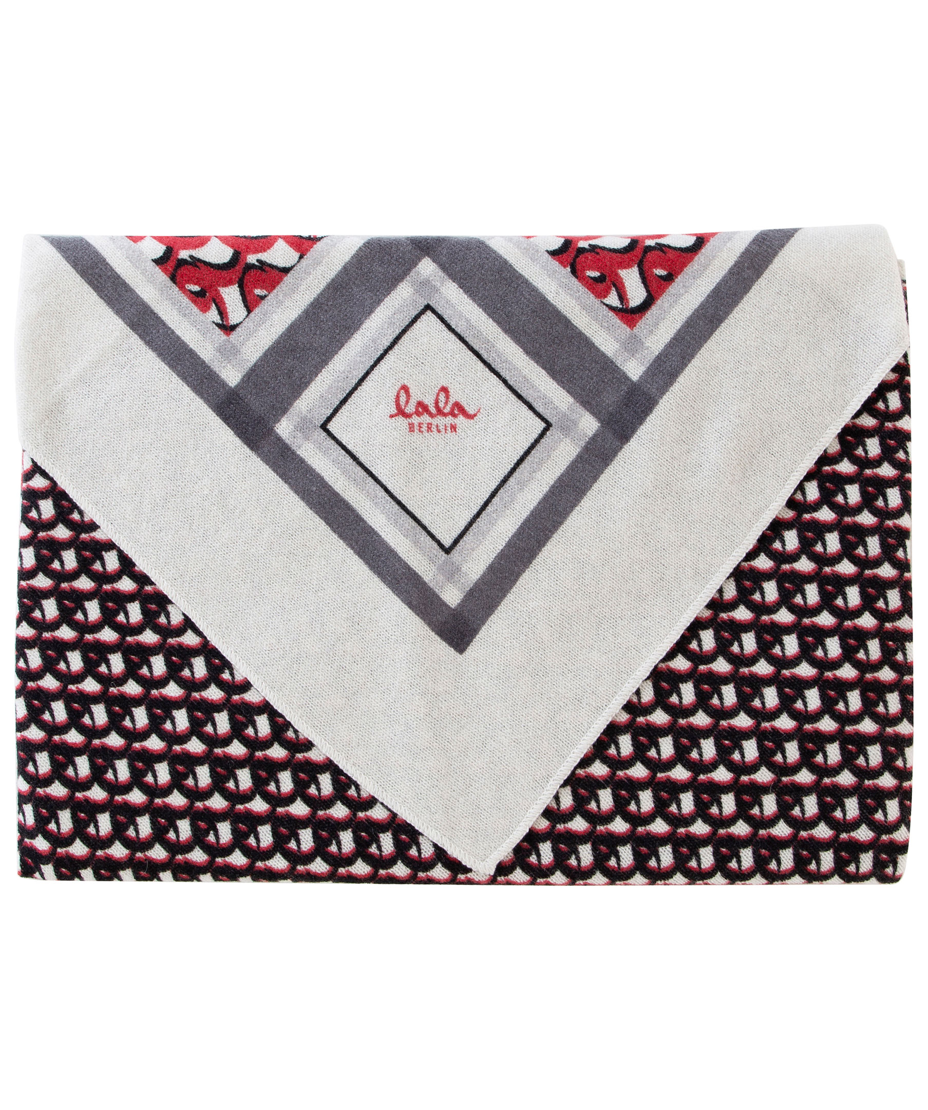 Svart/röd och grå mönstrad halsduk i trekantsmodell från Lala Berlin vävd i 100% kashmir.