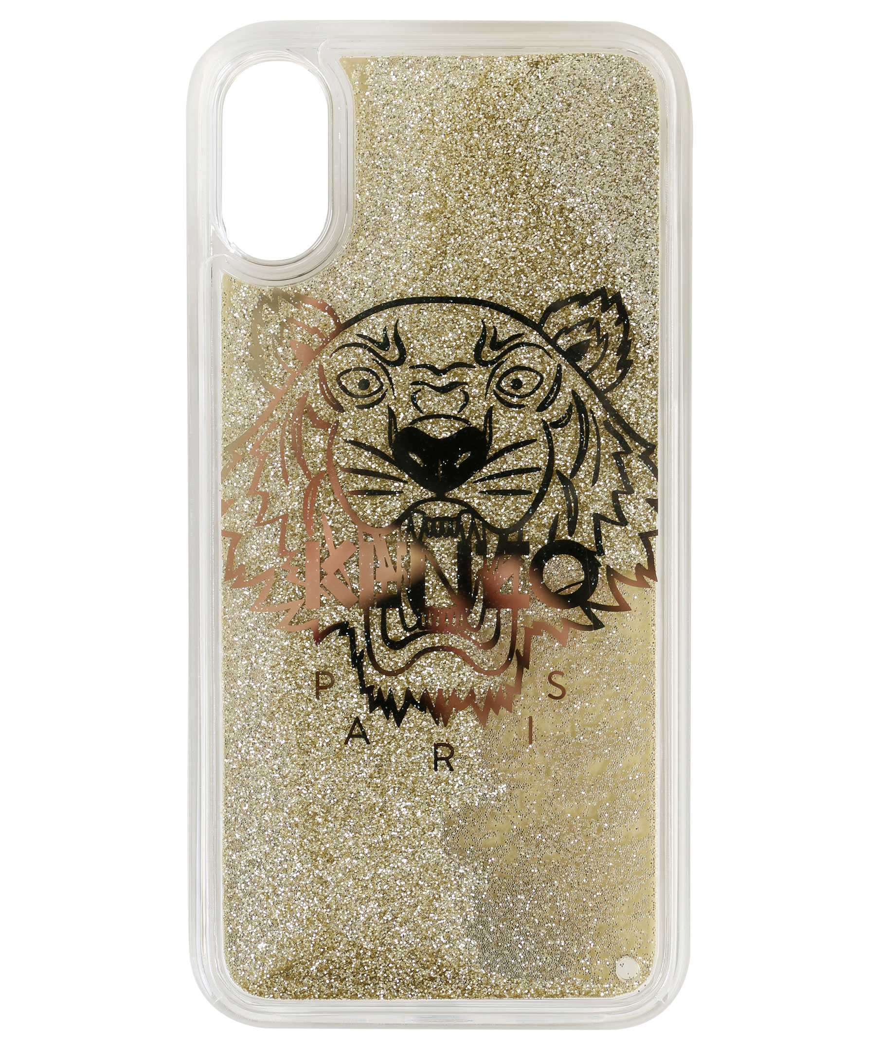 Mobilskal som passar Iphone Xs Max från Kenzo. Transparanta kanter med guldig logga tryckt på skalets baksida. Flytande guldglitter i skalet som rör sig när du rör telefonen.