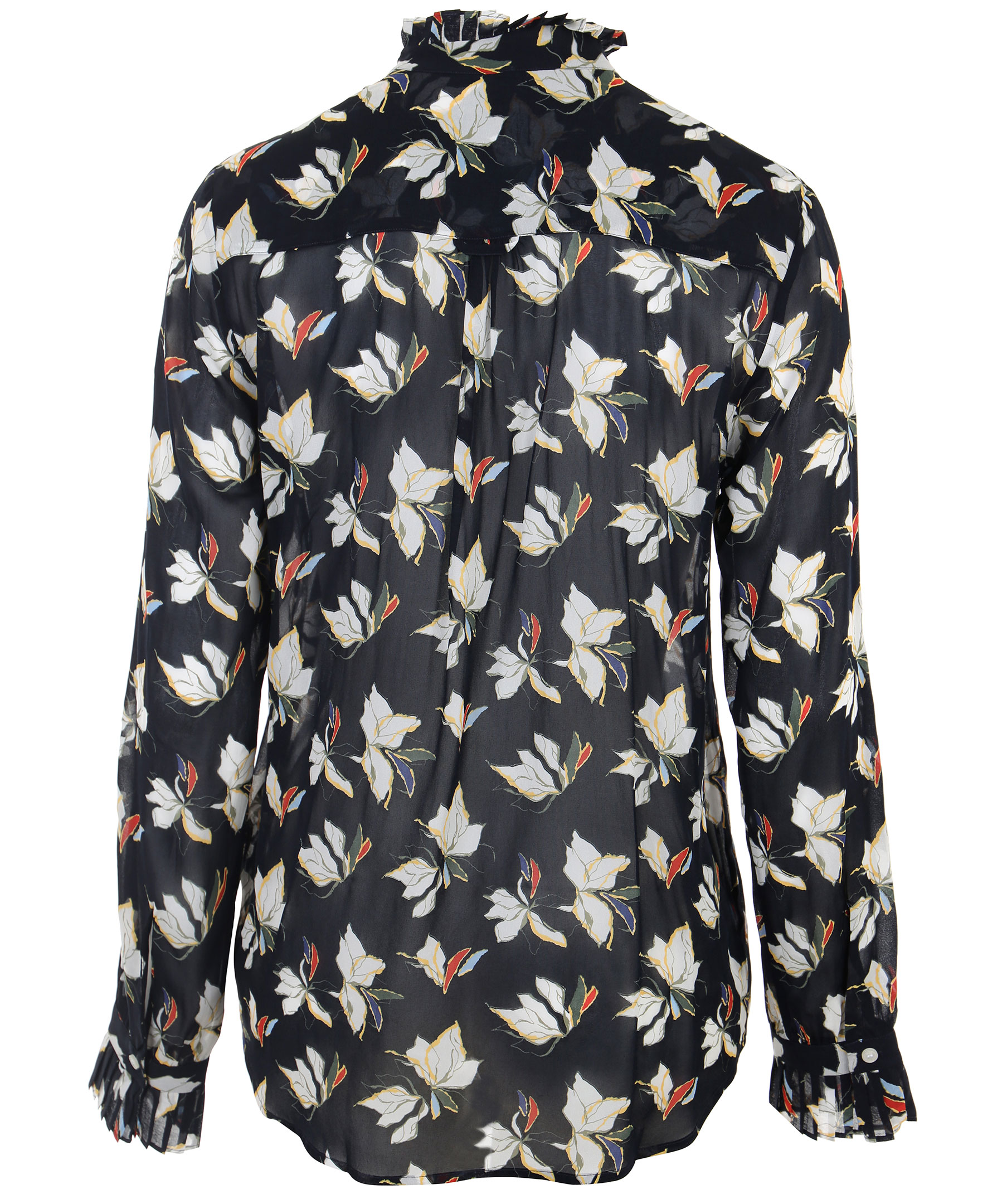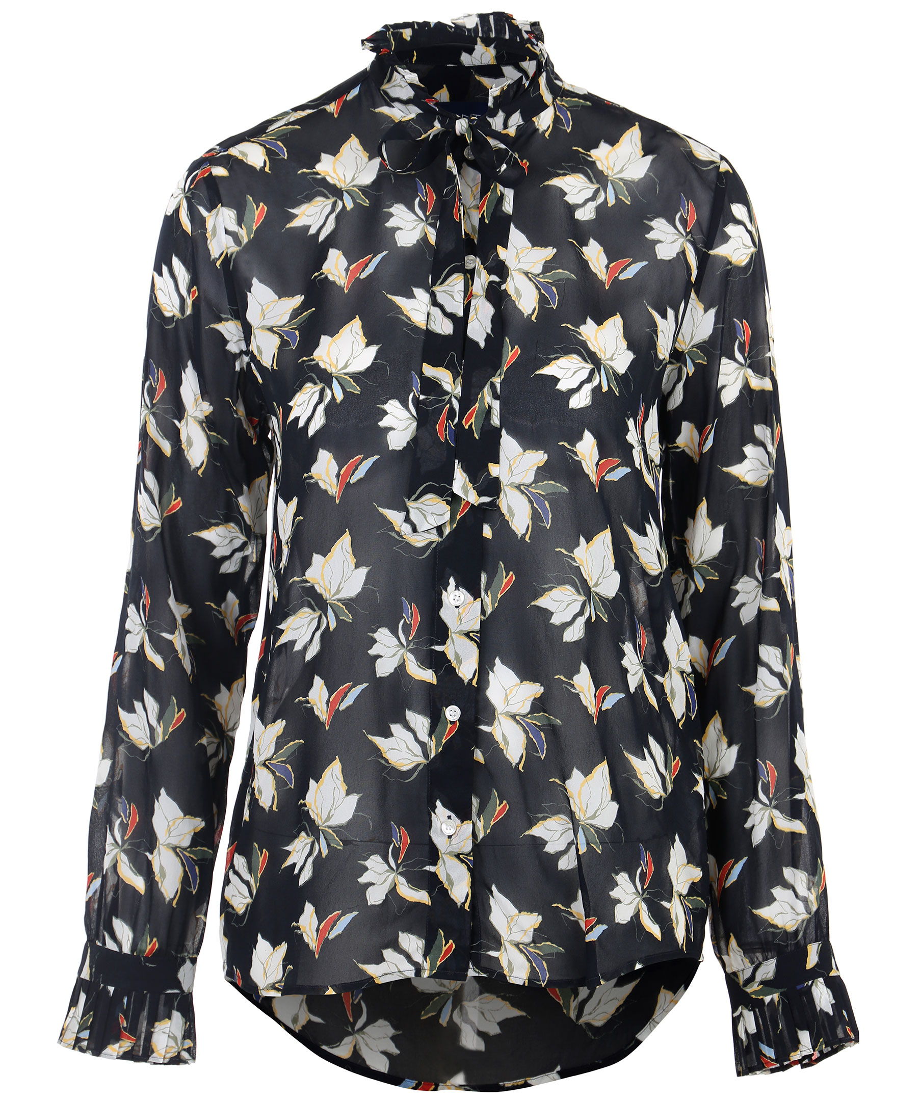 Mörkblå blus från Gant i ett vackert viskos tyg med blommönster. Blusen är semi transparent, knyt detalj vid halsen och plisserade delar vid krage och ärmslut.