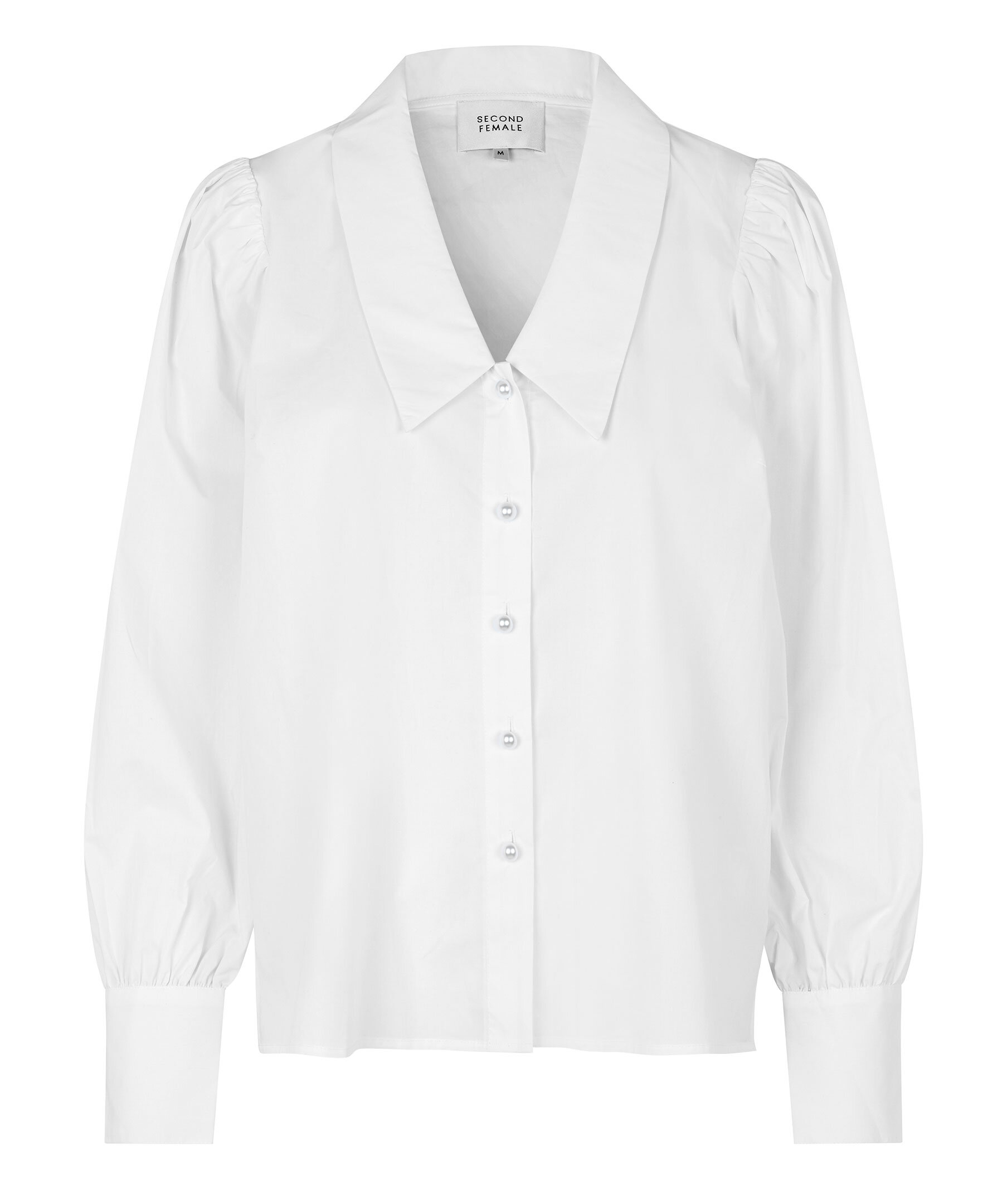 Vit, v-ringad blus i bomull från Second Female. Långa ärmar med litev puff vid axeln och bred, spetsig krage längs med ringningen. Stängs med pärlknappar och har korta slitsar i sidorna