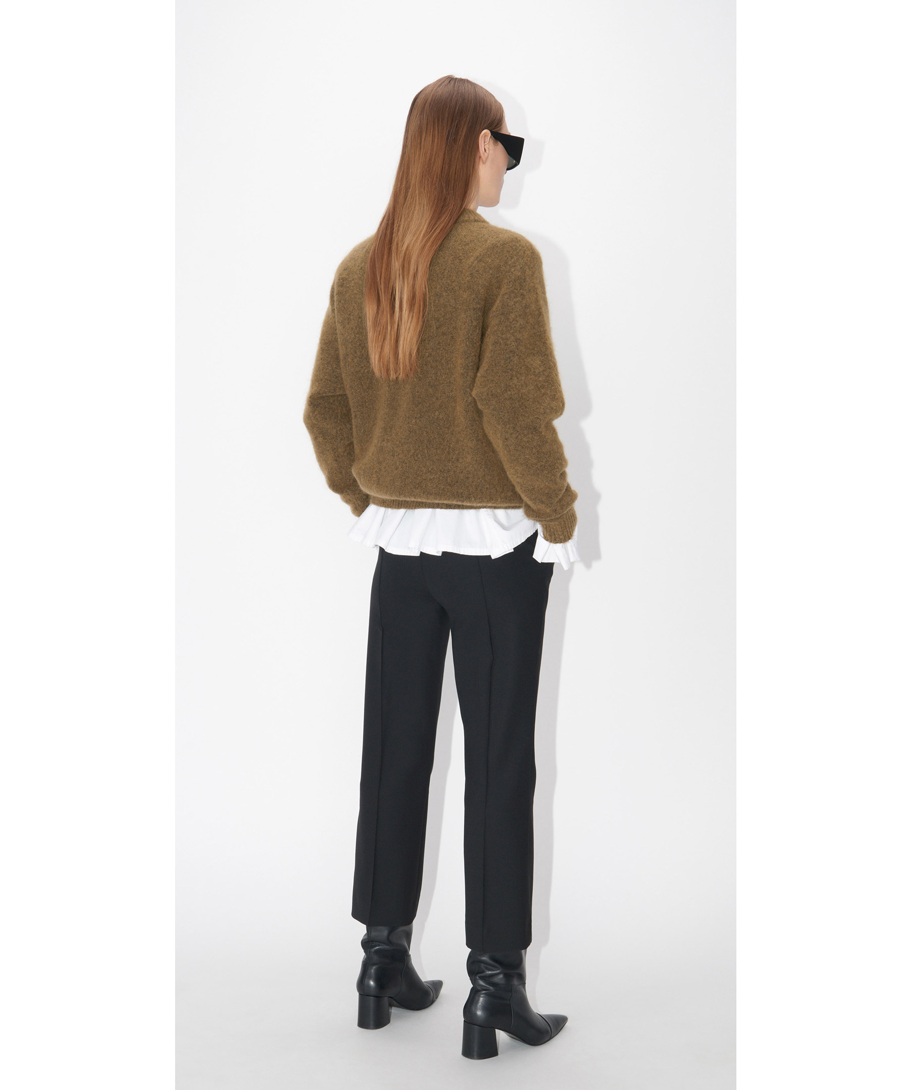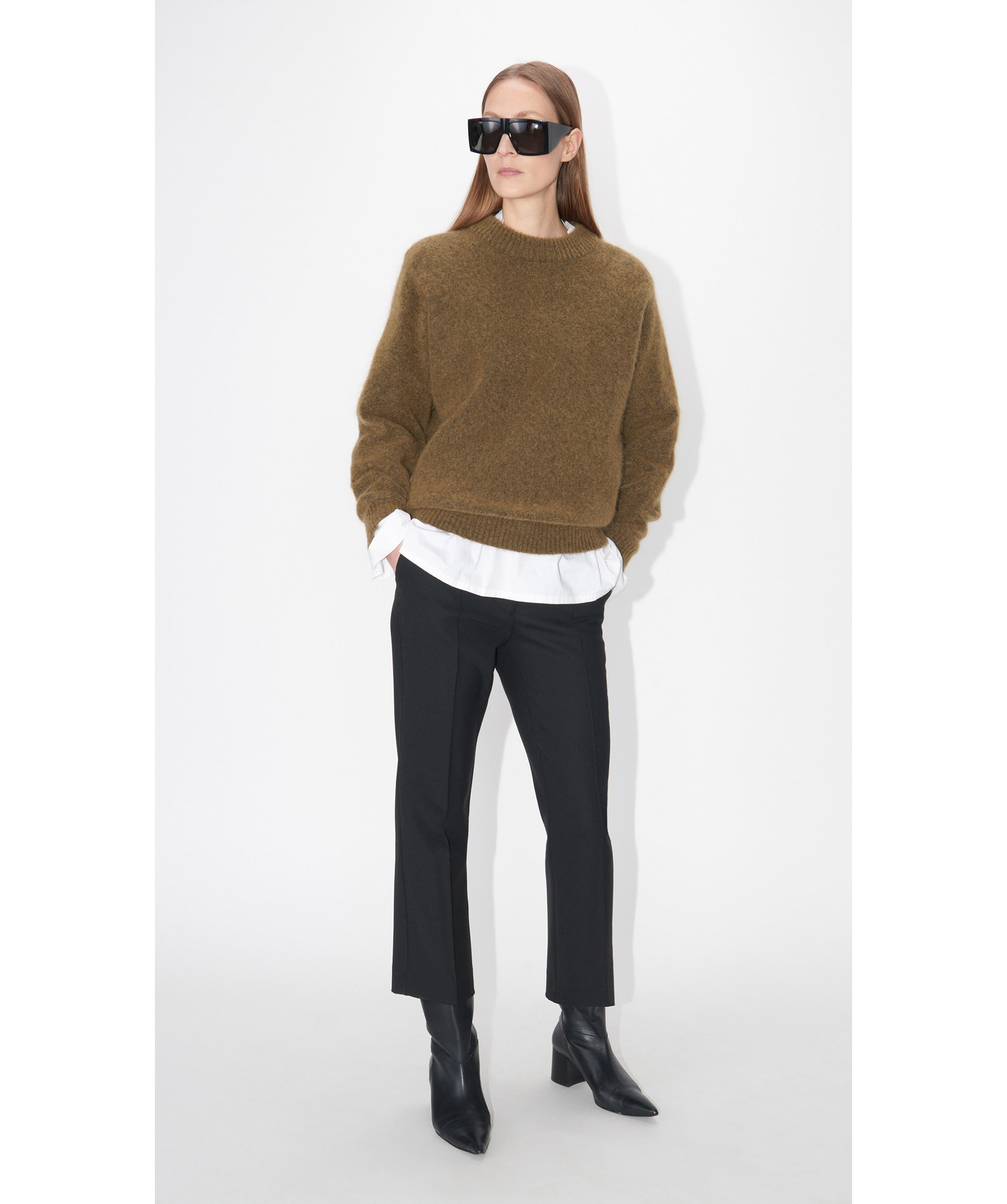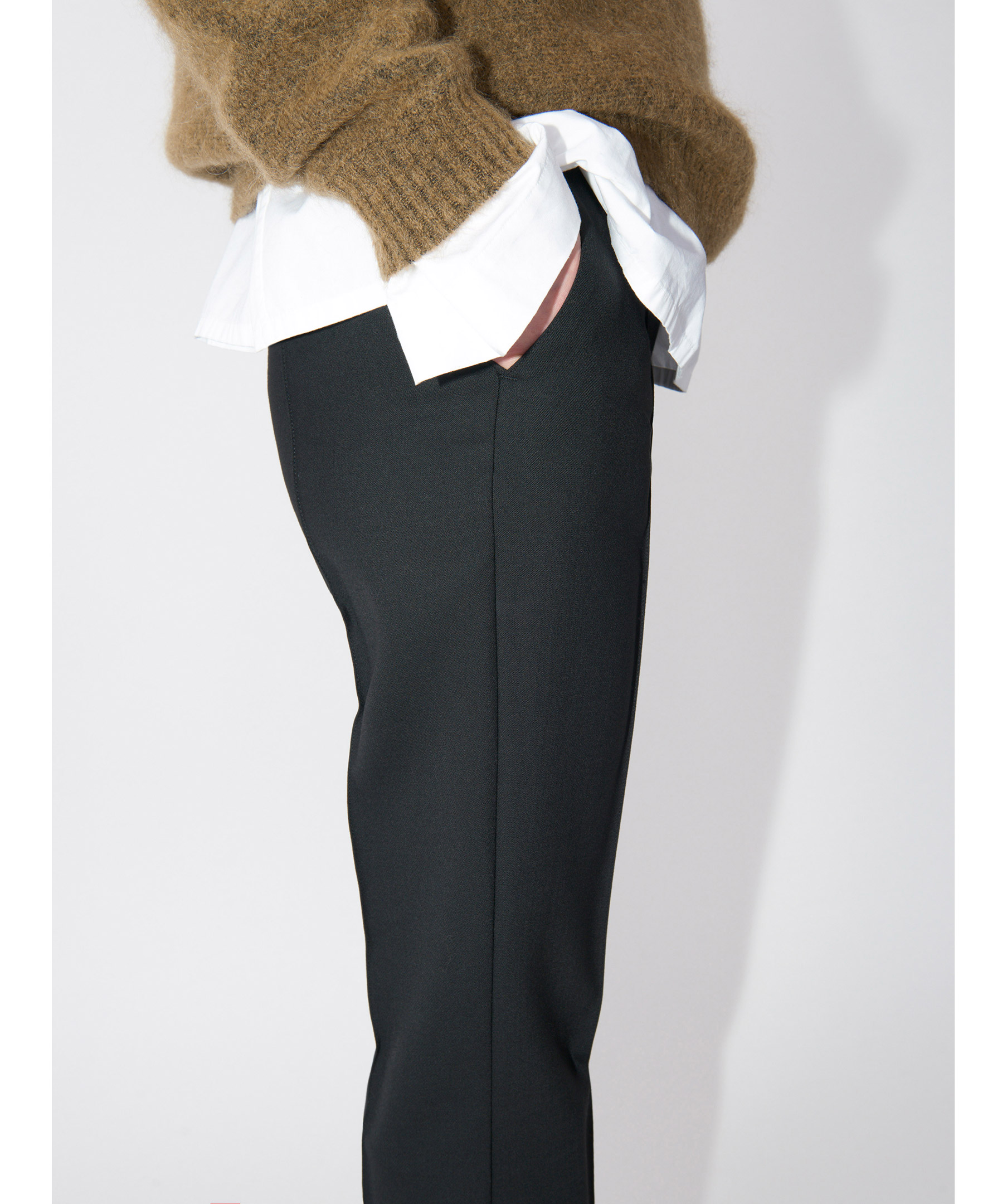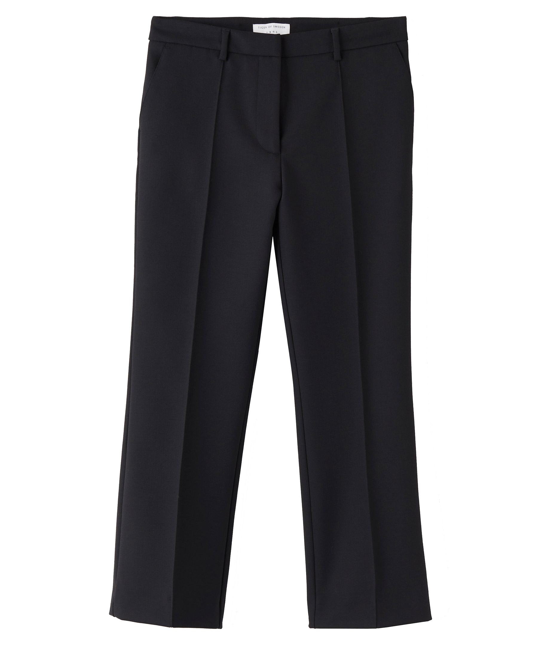 Svarta kostymbyxor från Tiger of Sweden i kick flare modell. Tillverkade i ullmix. Byxorna är croppade, och har två framfickor och två bakfickor. Stängs med dragkedja, hake och knapp. Snygga med klackar och jeans. Passar lika bra till kontoret som till festen.