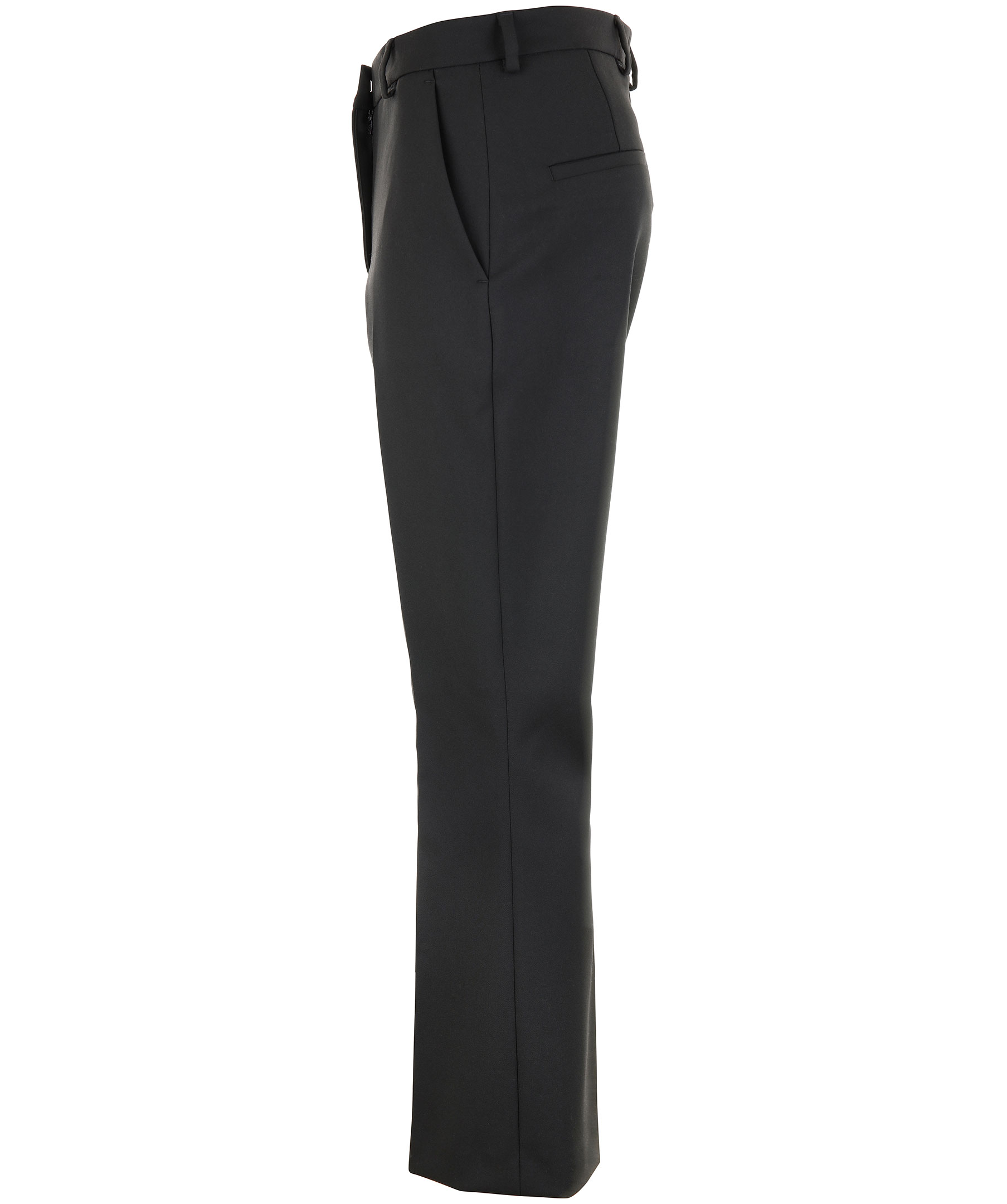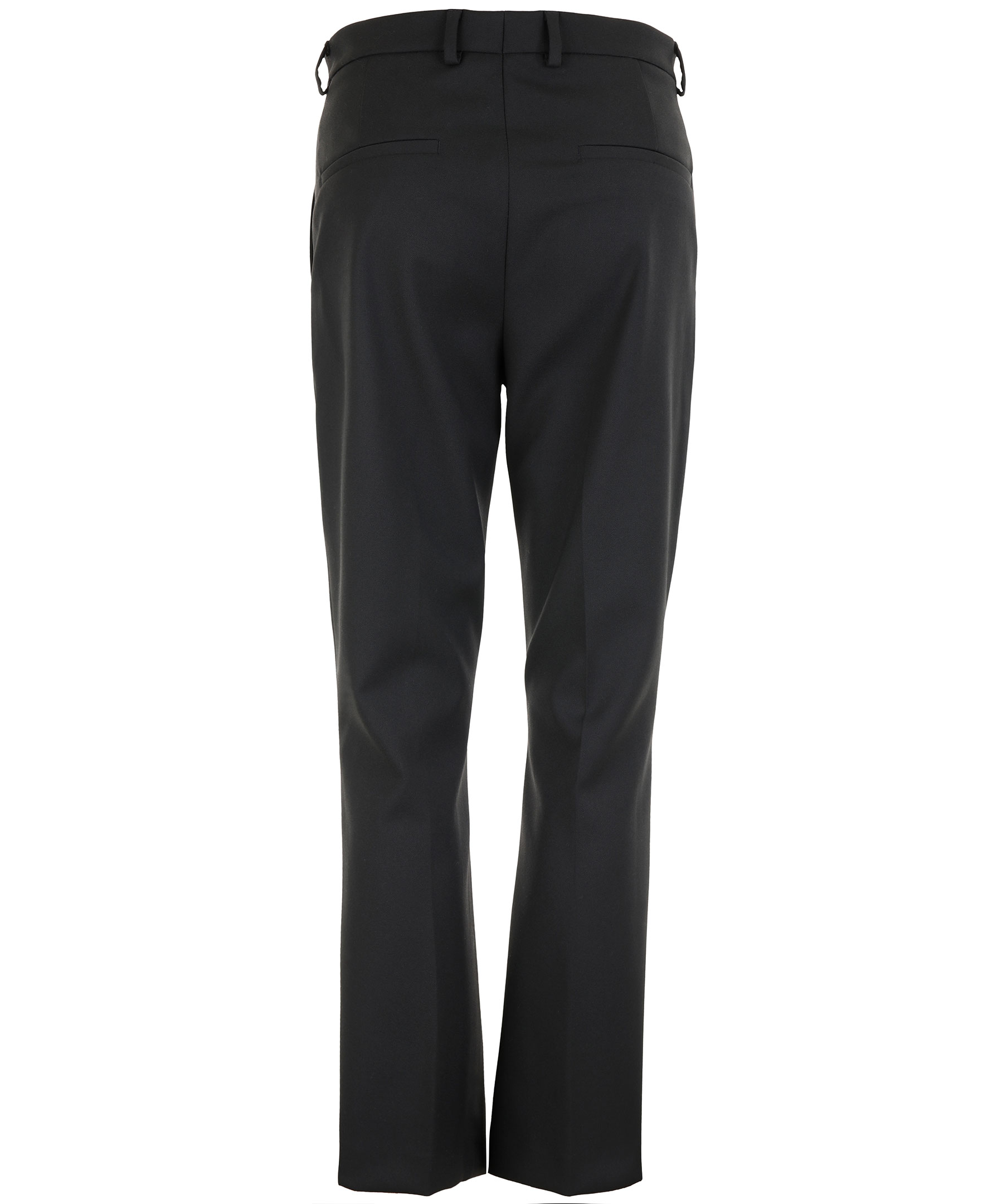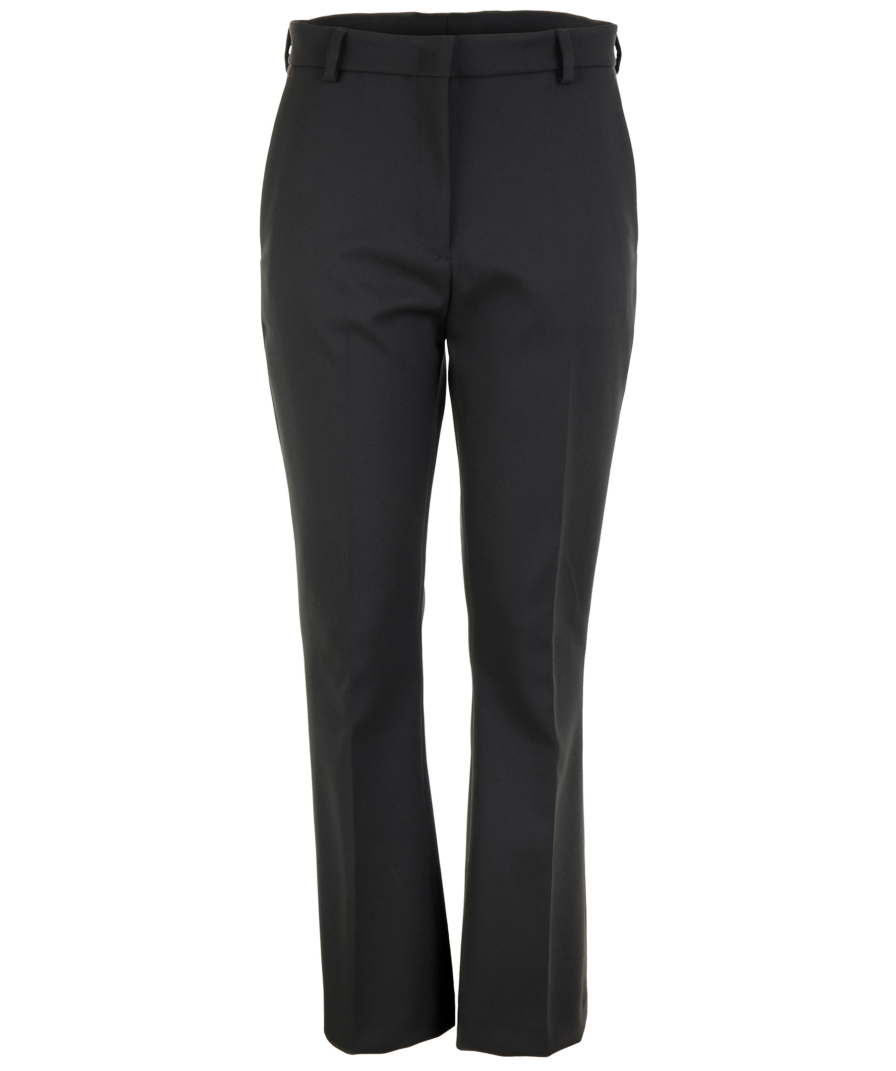 Svarta figursydda ankellånga kostymbyxor från J.Lindeberg. Tillverkade i en stretchigt polyester och viskostyg. Utsvängda vid benslut, pressveck och två framfickor.