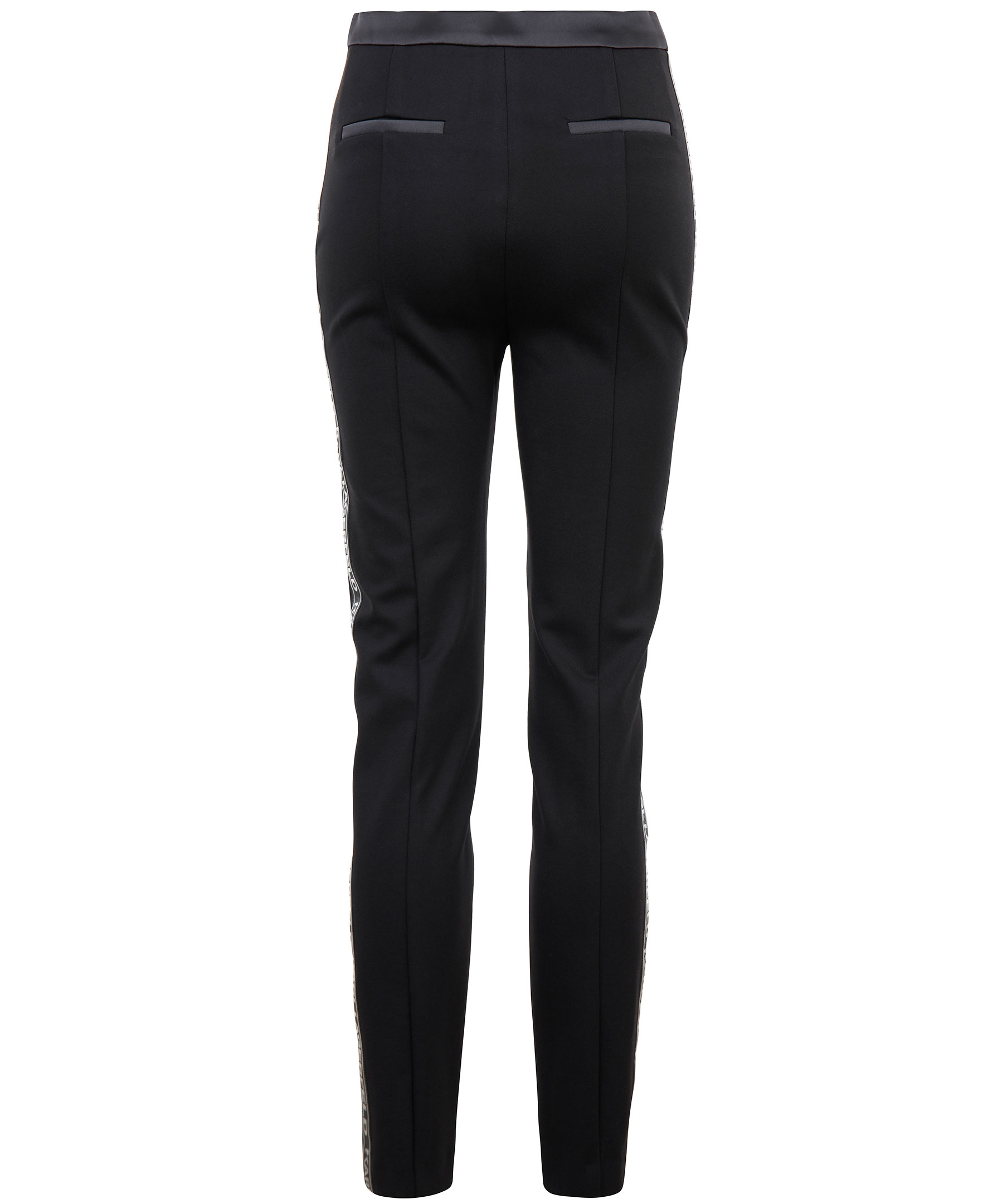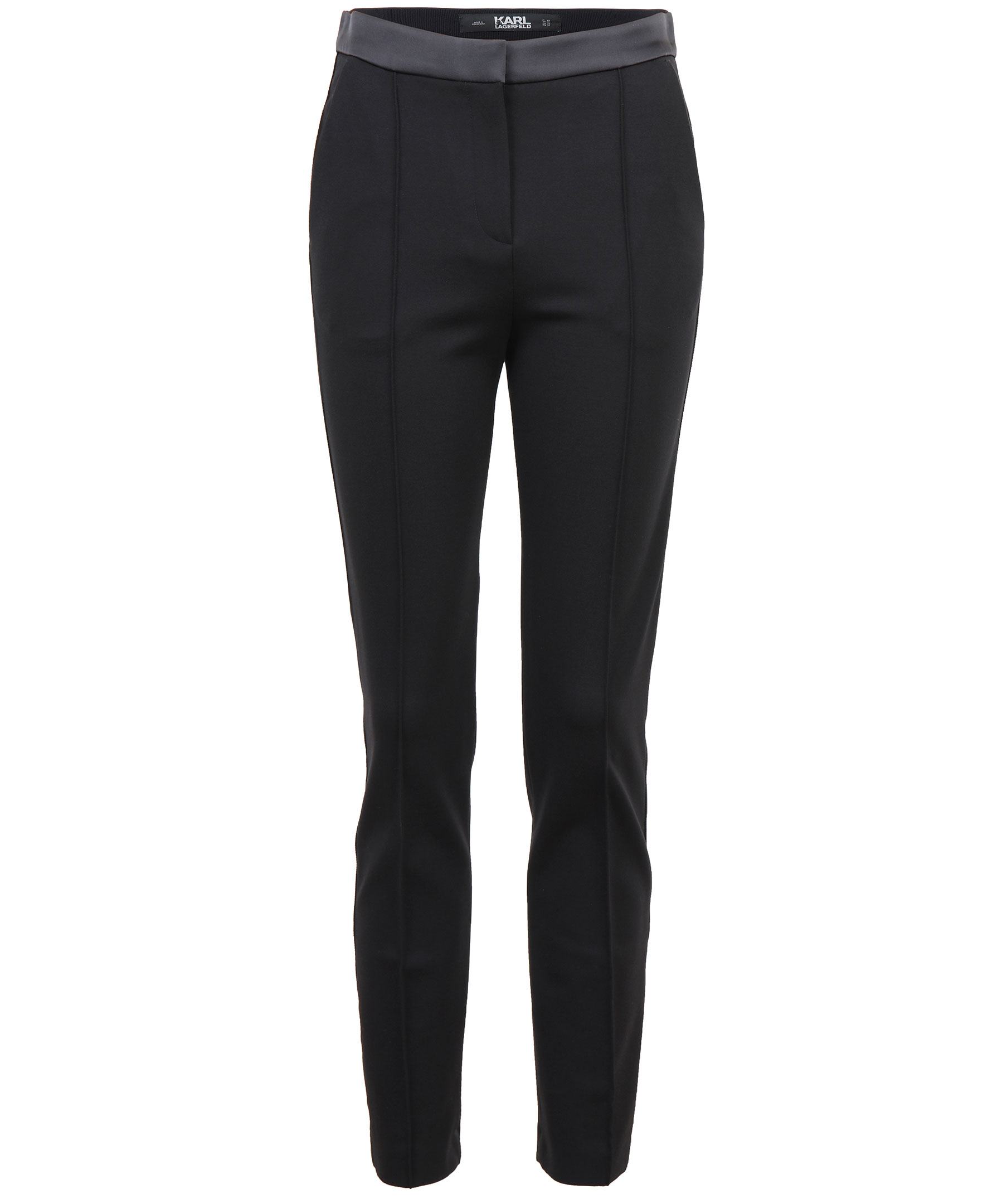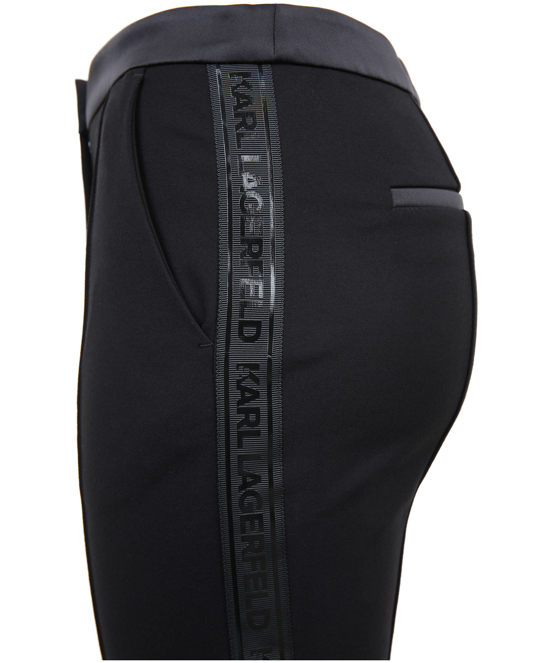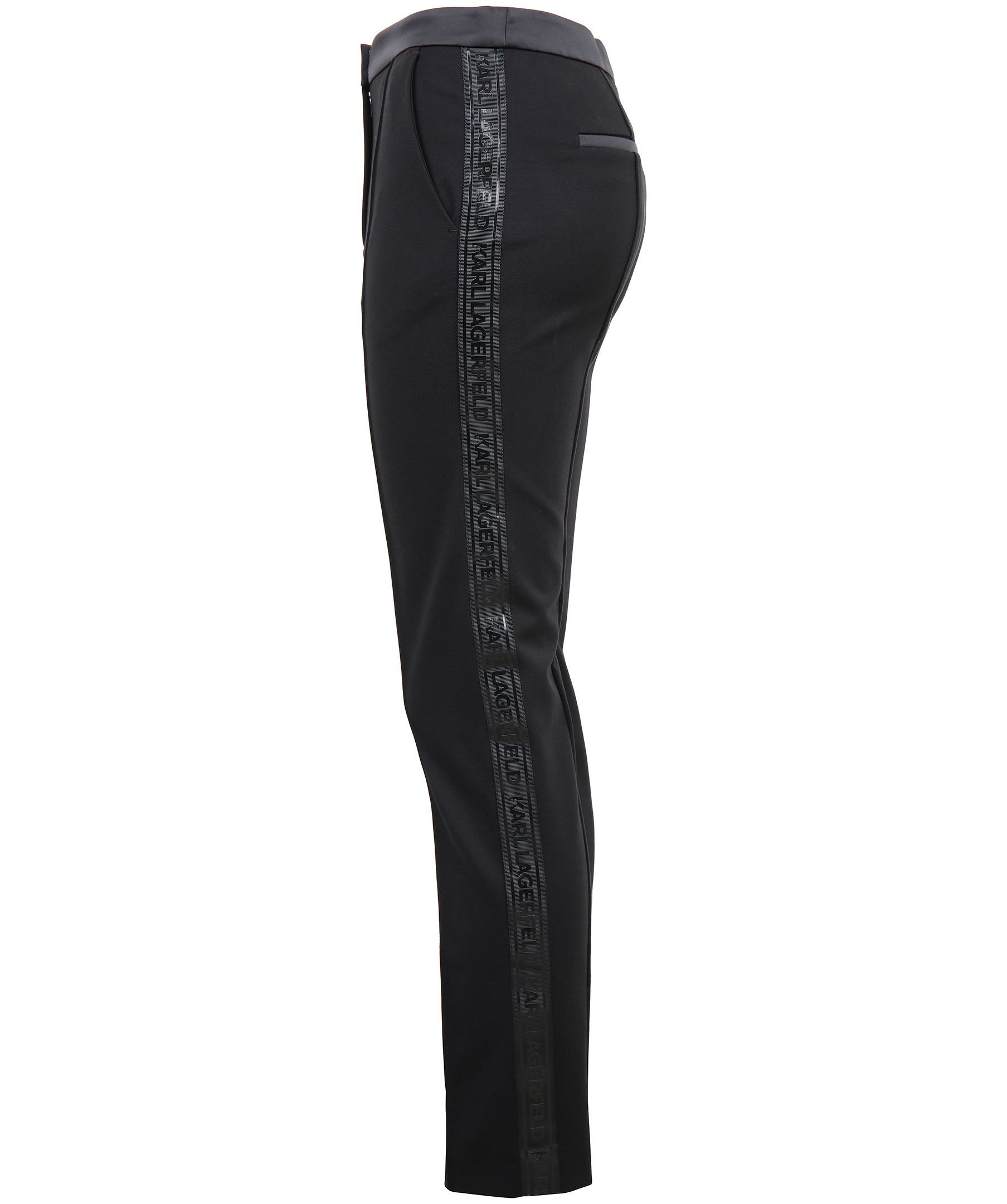 Svarta kostymbyxor med pressveck från Karl Lagerfeld. Revärer i sidorna med glansigt tryck med loggor. Sametstyg i midjan, låtsasfickor bak och snedställda fickor fram. Stängs med gylf och hake. Tillverkade i stretchig viskos och polyamid.