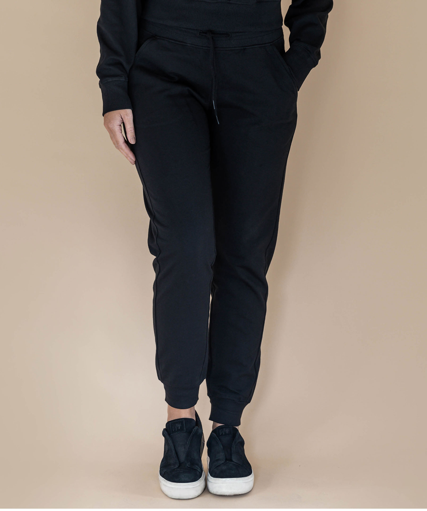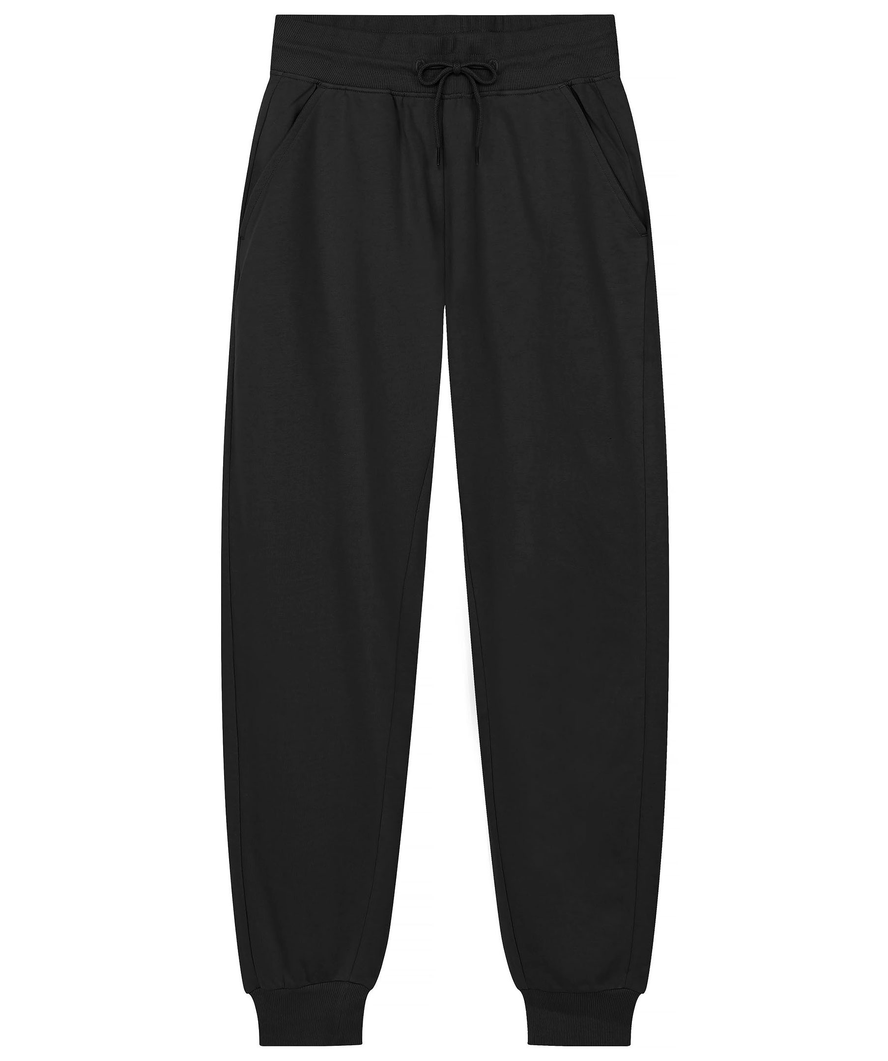 Svarta mjukisbyxor från Bread&Boxers, Design av Sara Biderman. Tillverkade i 100% ekologisk bomull. Ribbad midja med med snören i bomull. Ribbad mudd i benslut och snedställda, öppna framfickor.