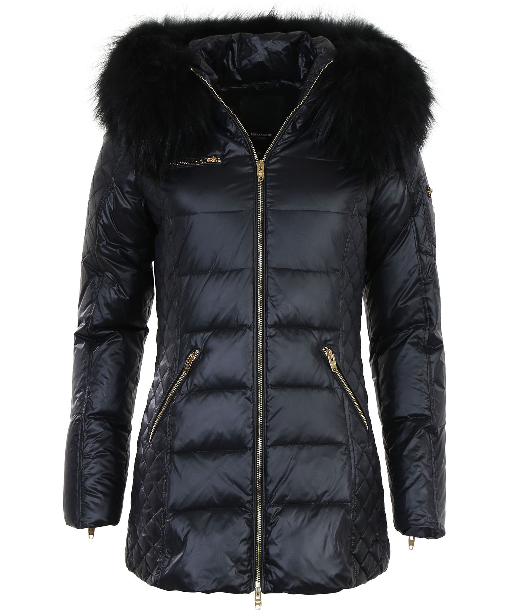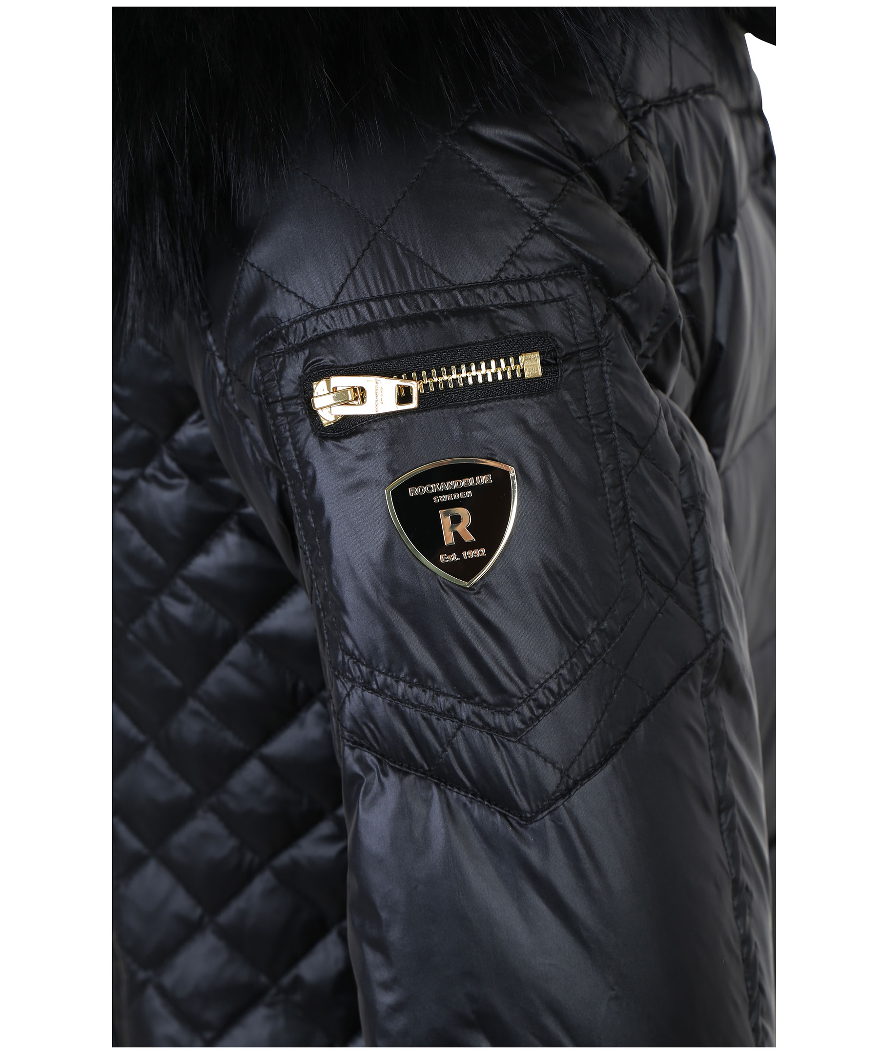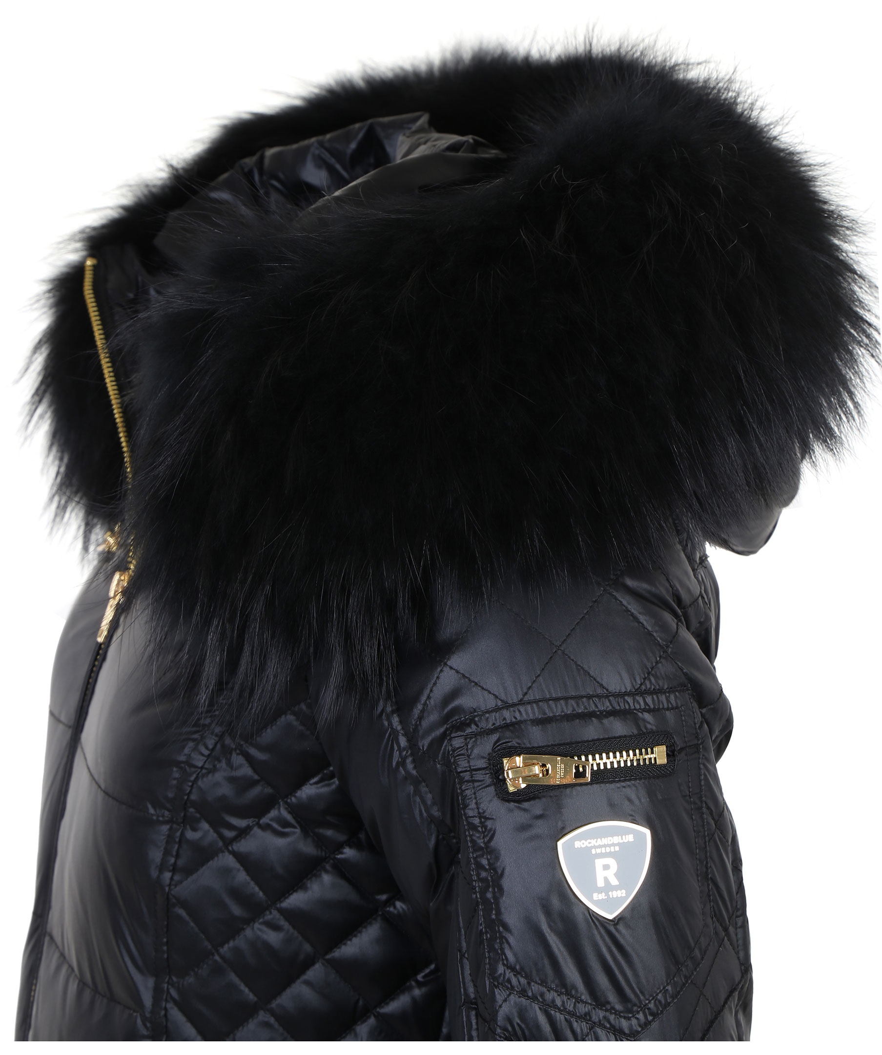 Svart dunjacka i medellång modell från Rockandblue. Tillverkad i nylon med fyllning av dun och fjäder. Quiltning i sidorna, tre fickor fram, liten ficka och logotyp på vänster ärm samt två innerfickor. Löstagbar luva med fin naturpäls. Stängs med dragkedja.