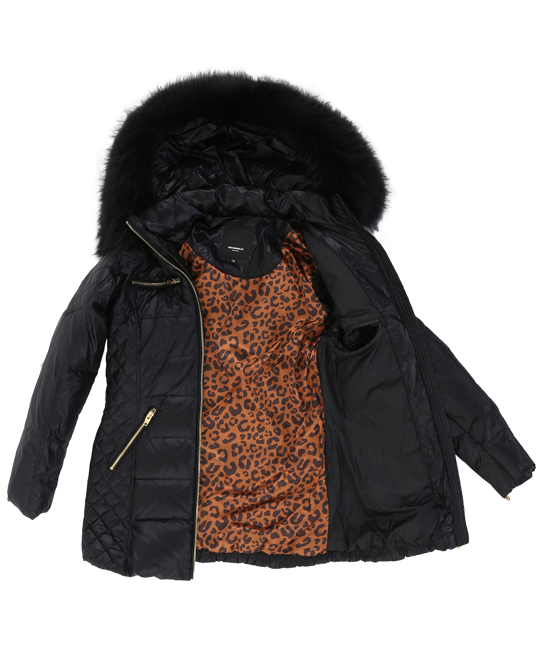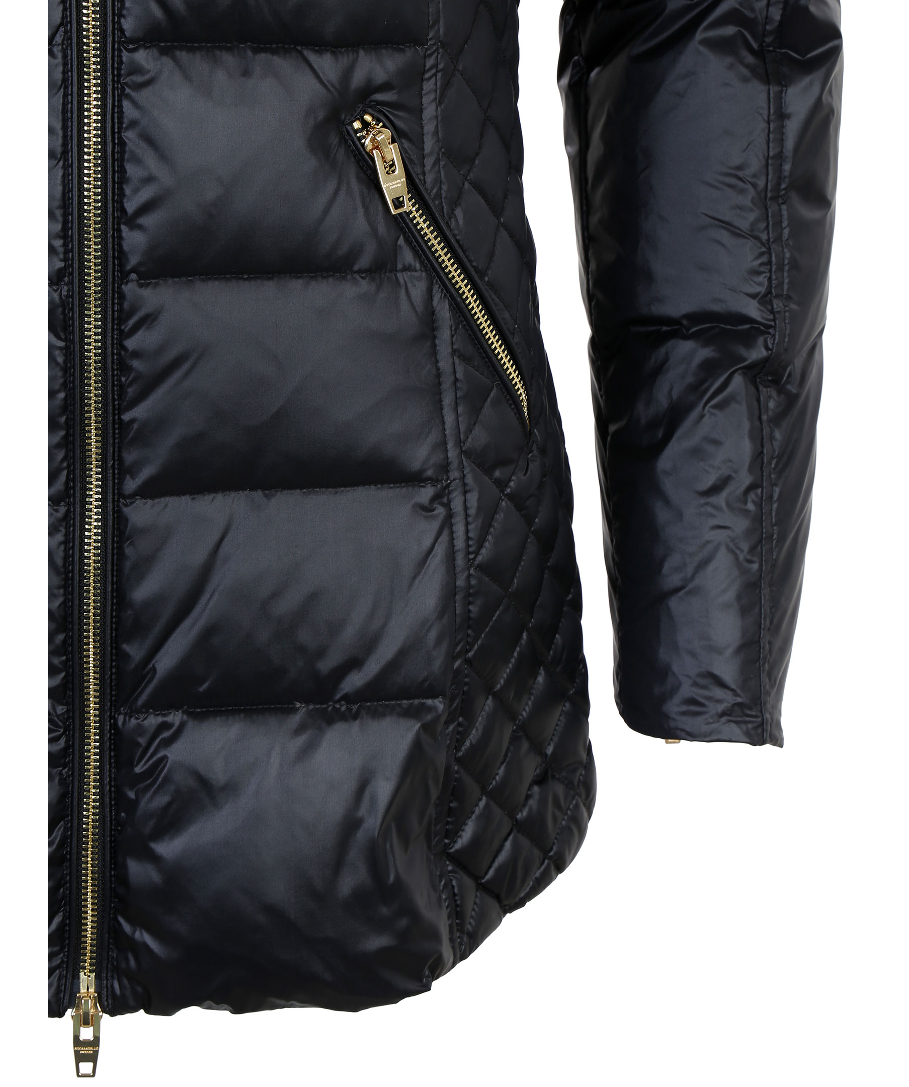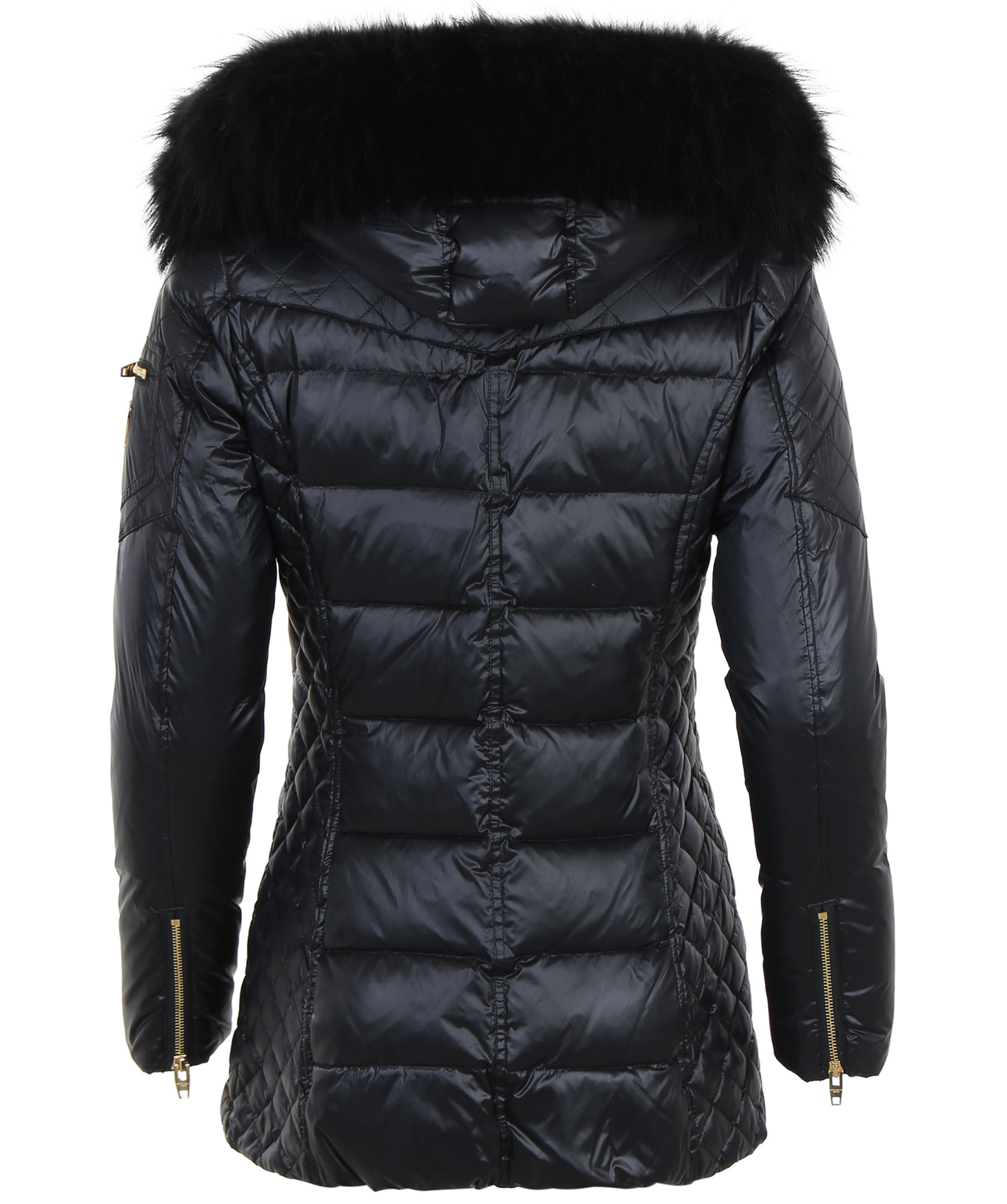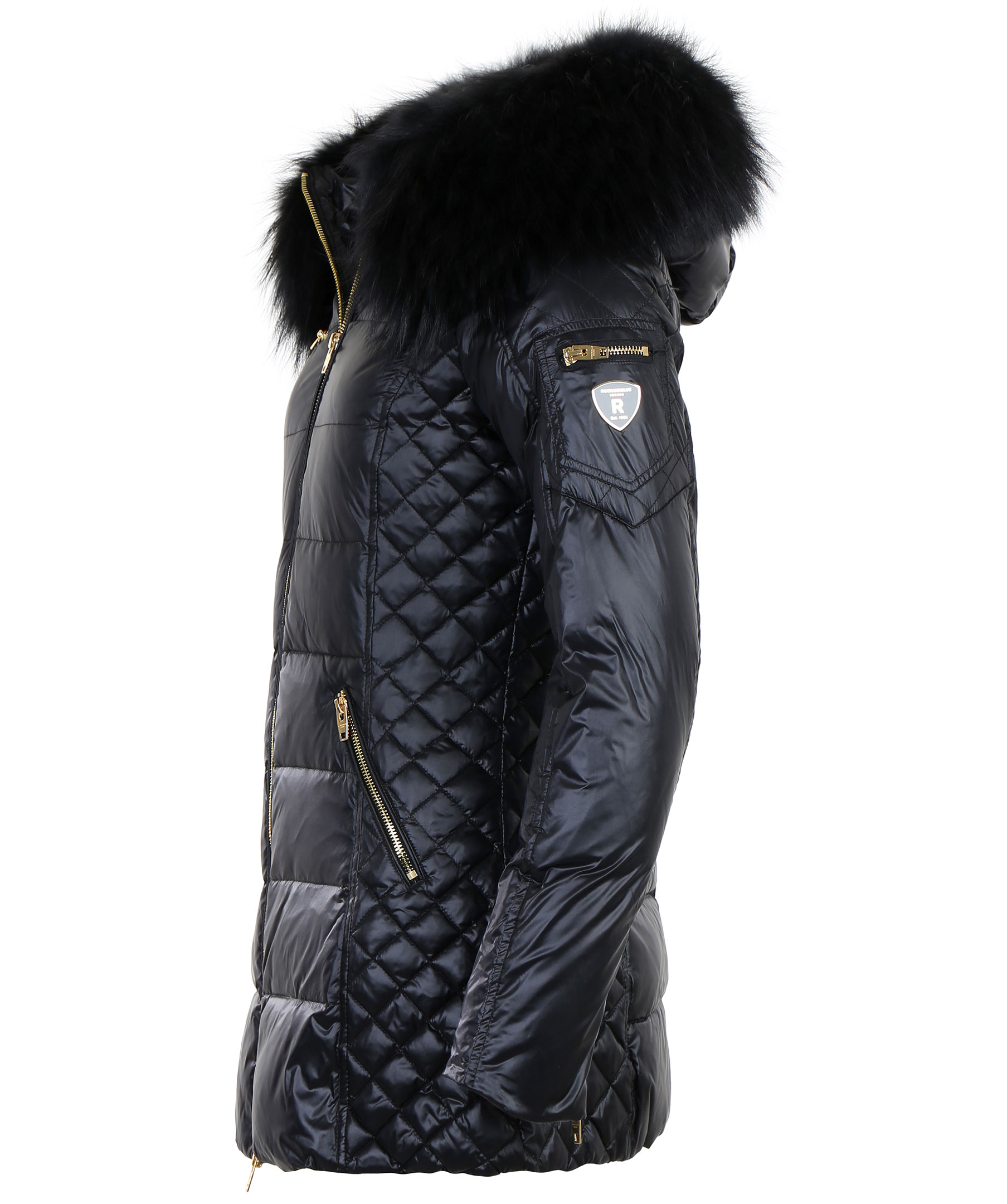 Svart dunjacka i medellång modell från Rockandblue. Tillverkad i nylon med fyllning av dun och fjäder. Quiltning i sidorna, tre fickor fram, liten ficka och logotyp på vänster ärm samt två innerfickor. Löstagbar luva med fin naturpäls. Stängs med dragkedja.