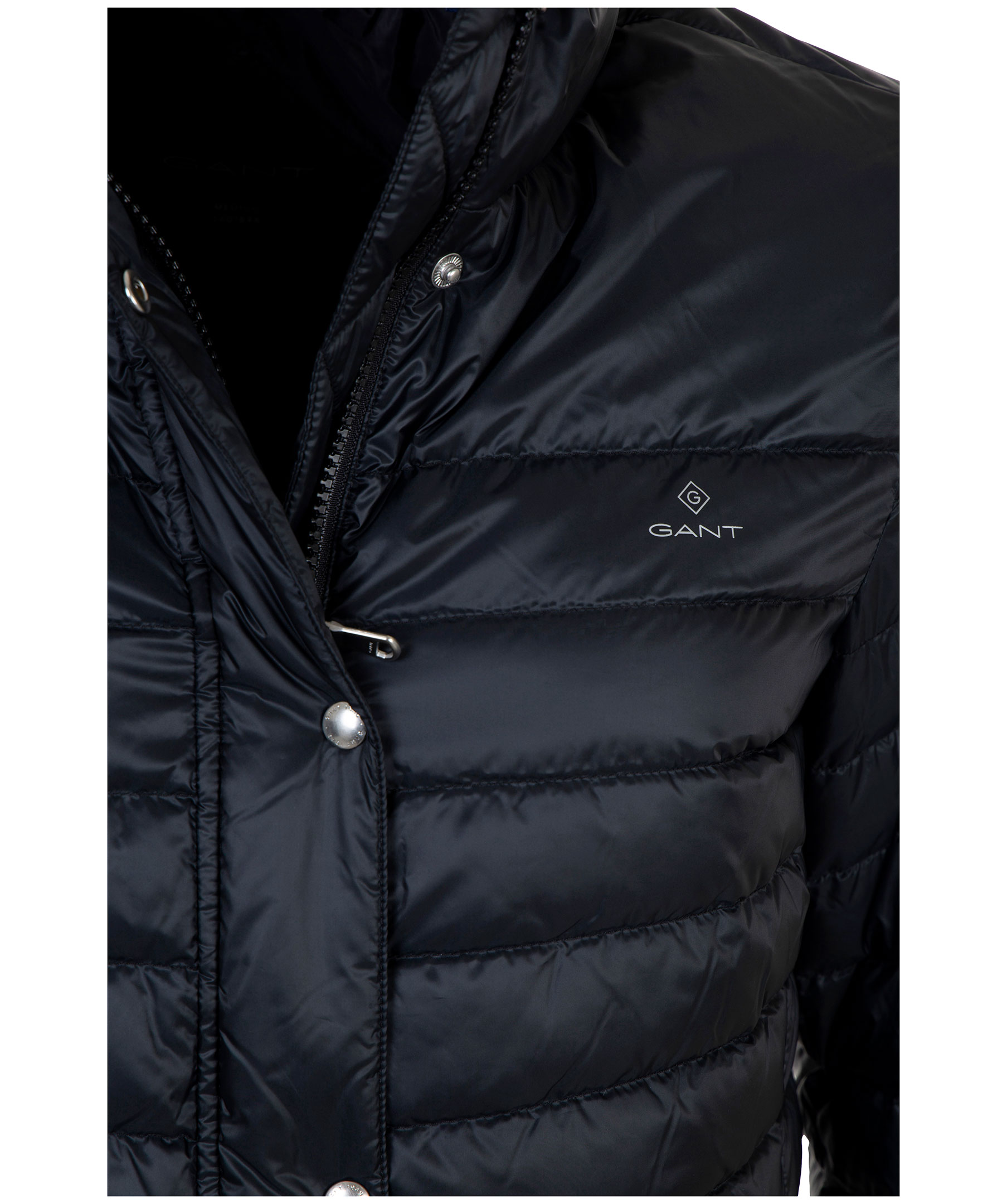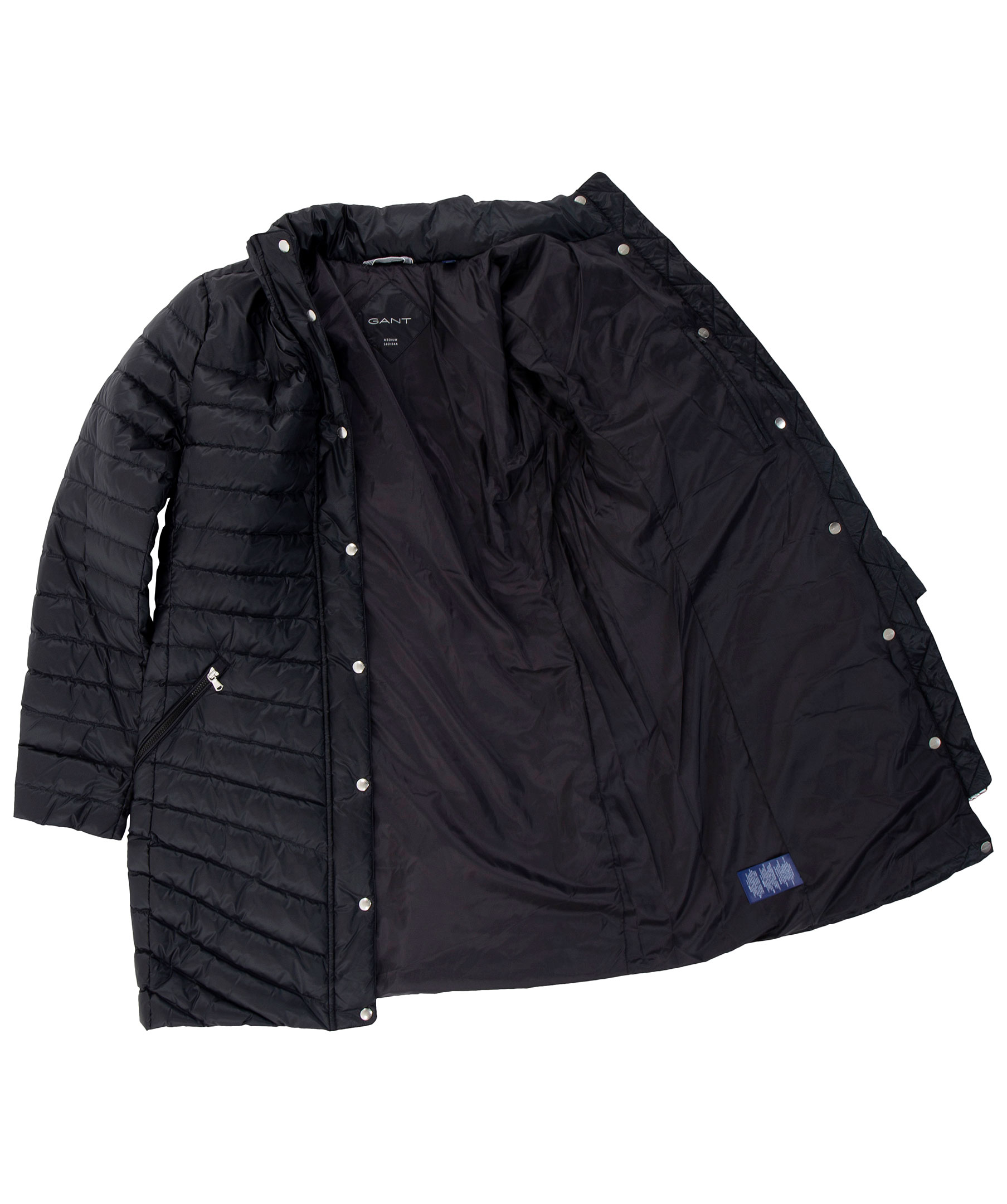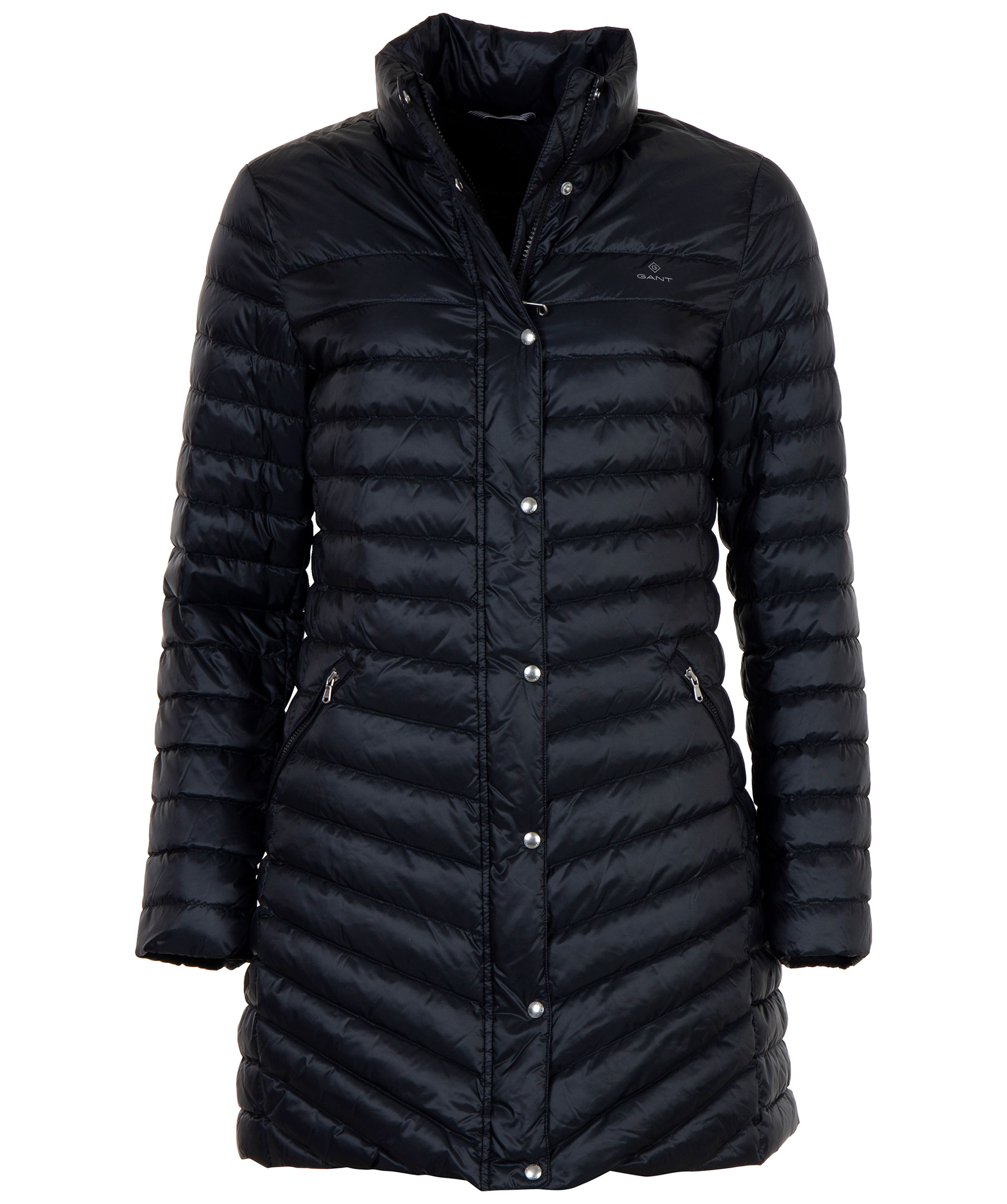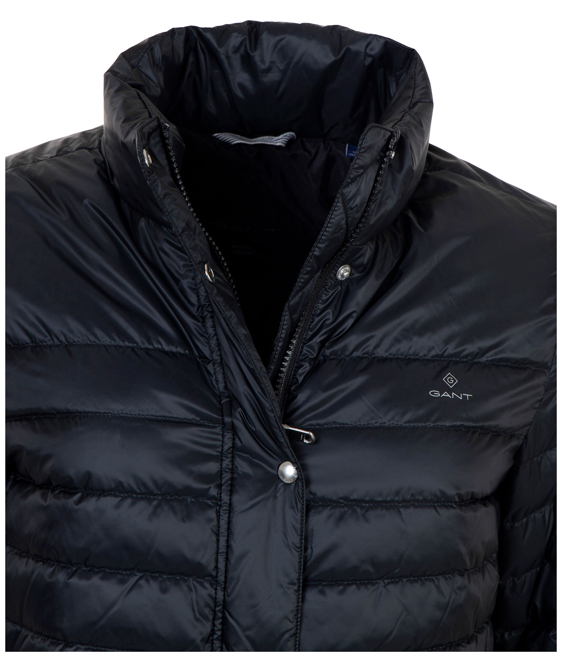 Svart tunn dunjacka i en längre modell från Gant. Jackan har två framfickor med dragkedja. Jackan stängs med dragkedja och knappar. En innerficka som stängs med dragkedja.