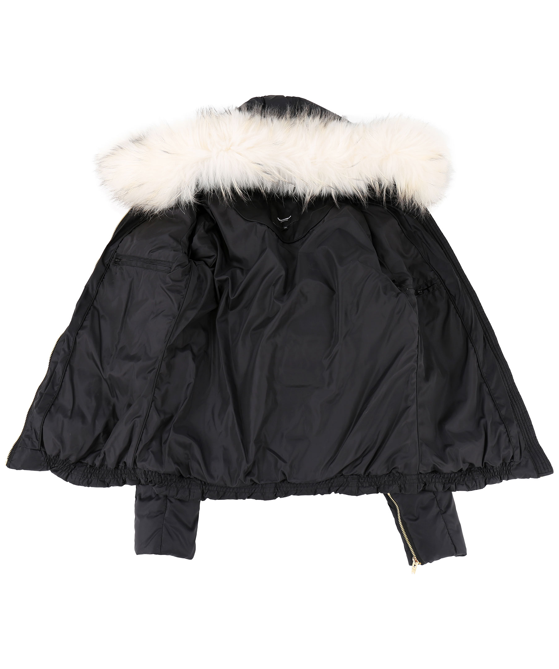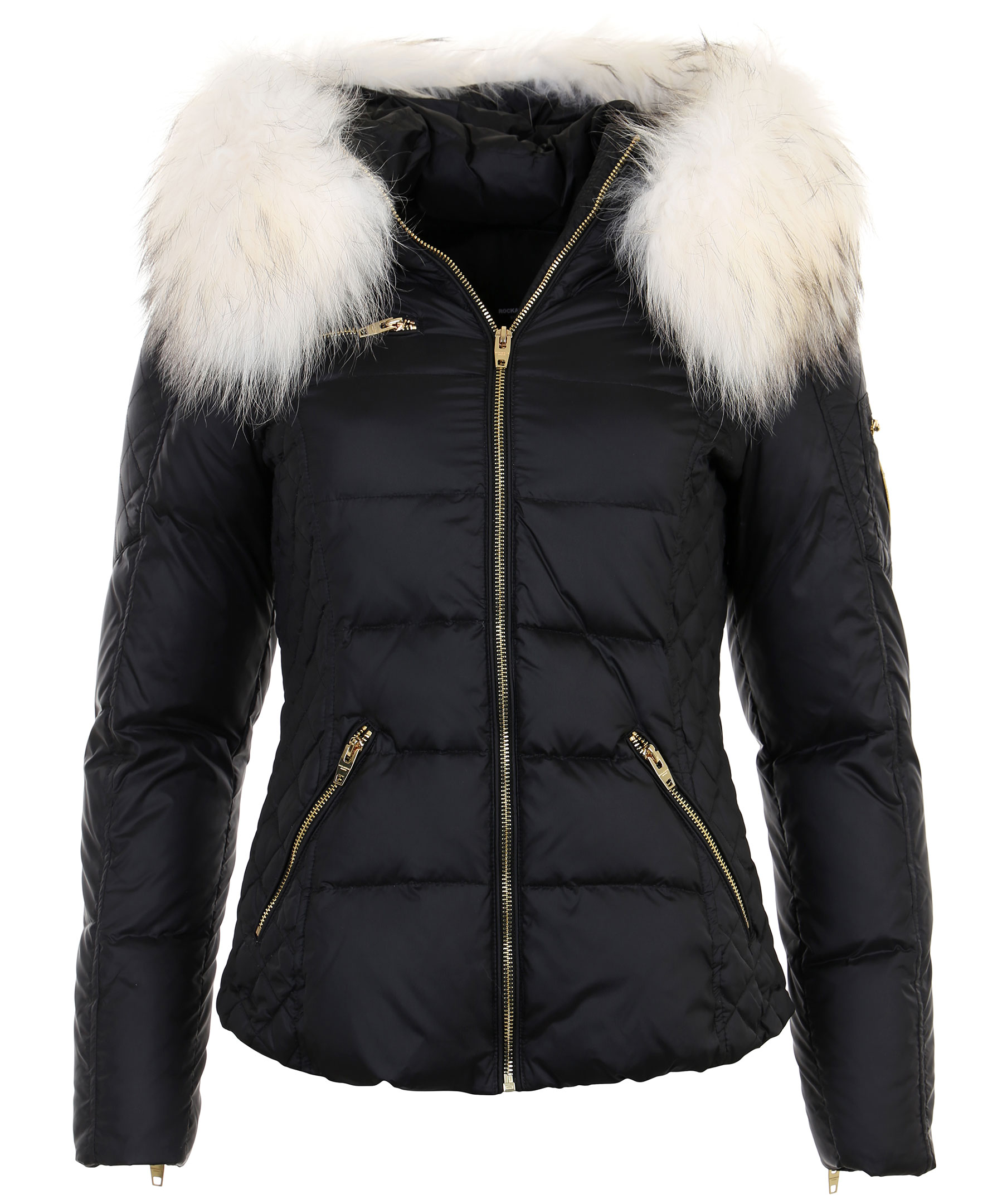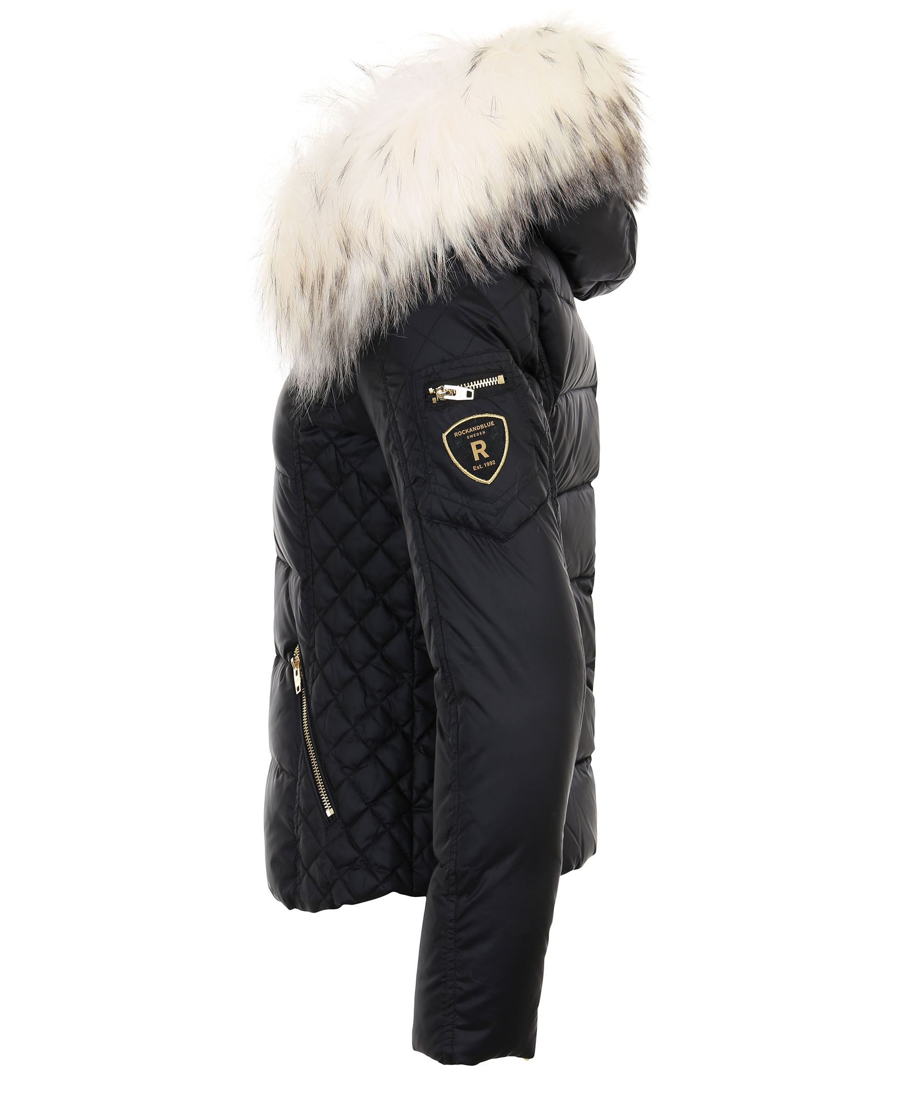 Svart dunjacka i kort modell från Rockandblue. Tillverkad i nylon med fyllning av dun och fjäder. Två fickor fram med dragkedja, logotyp i textil och ficka med dragkedja på vänster ärm och två innerfickor. Löstagbar luva med avtagbar naturpäls i vitt. Stängs med dragkedja och har quiltade sidor och detaljer i guldfärgad metall.