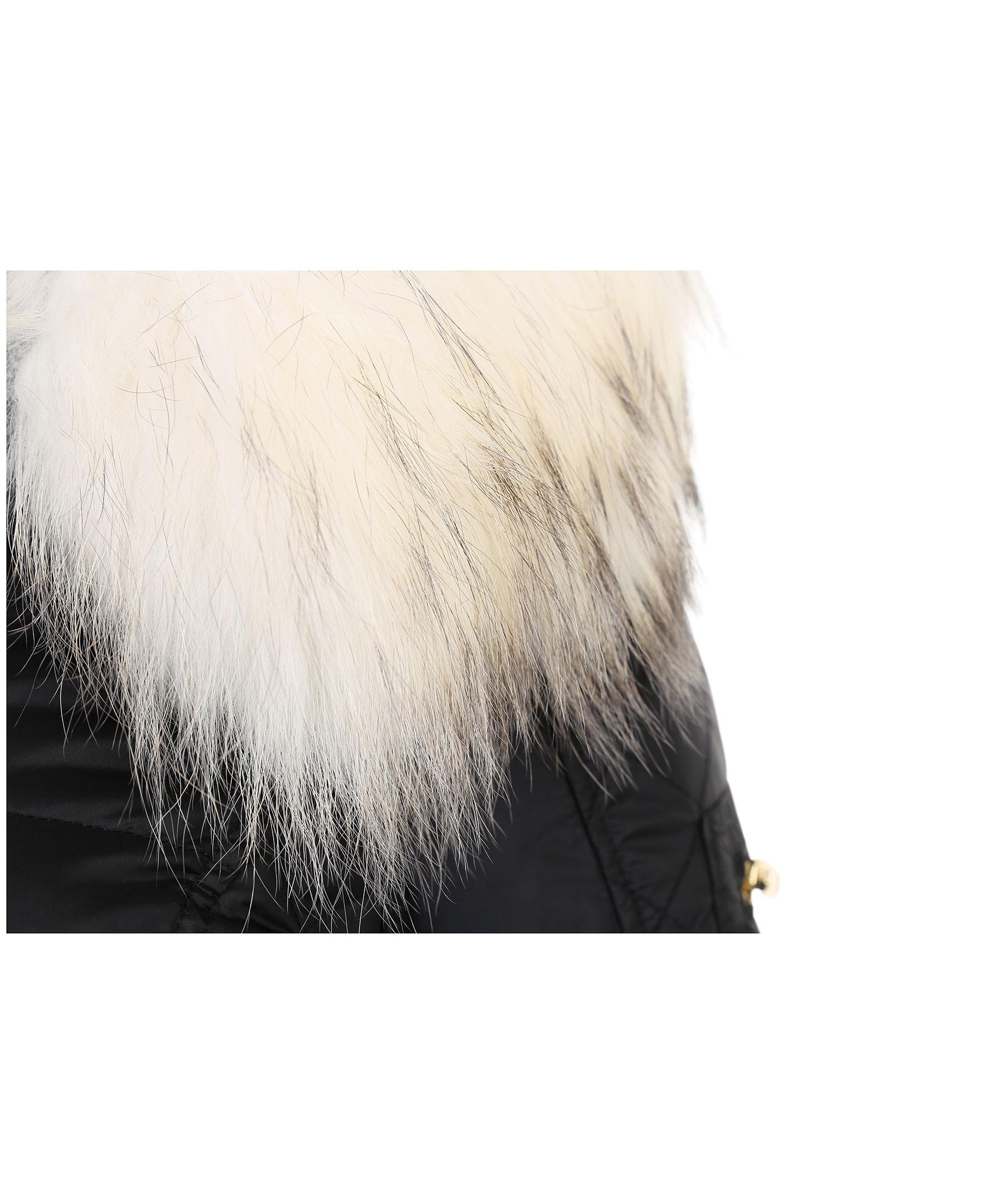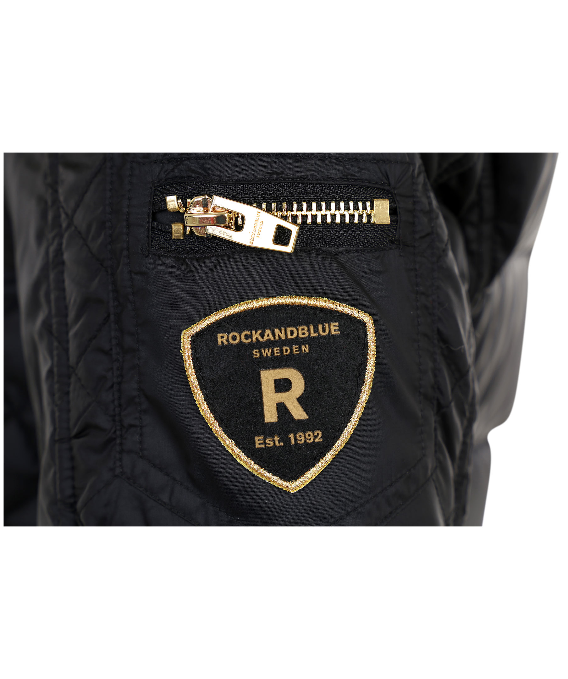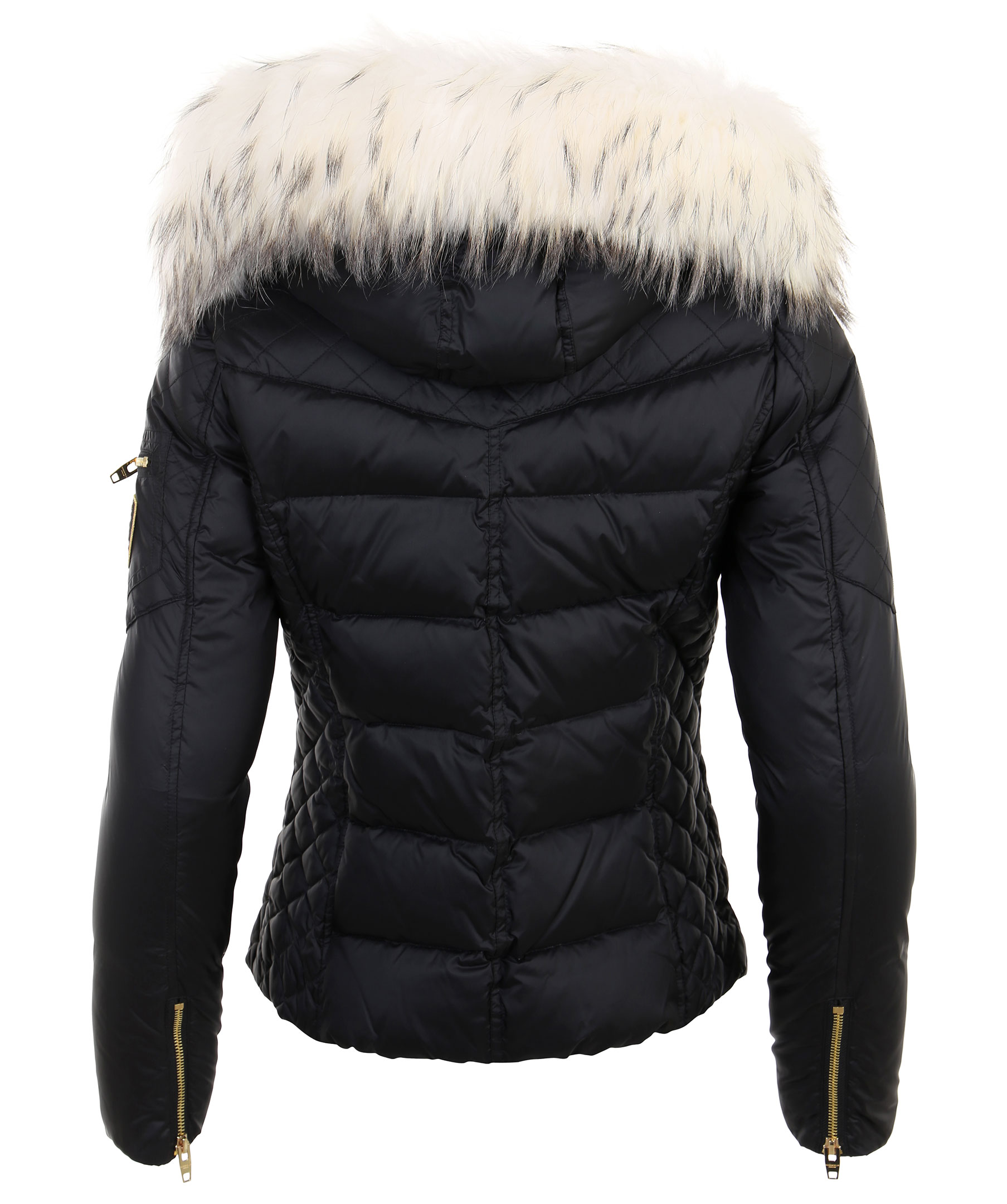 Svart dunjacka i kort modell från Rockandblue. Tillverkad i nylon med fyllning av dun och fjäder. Två fickor fram med dragkedja, logotyp i textil och ficka med dragkedja på vänster ärm och två innerfickor. Löstagbar luva med avtagbar naturpäls i vitt. Stängs med dragkedja och har quiltade sidor och detaljer i guldfärgad metall.