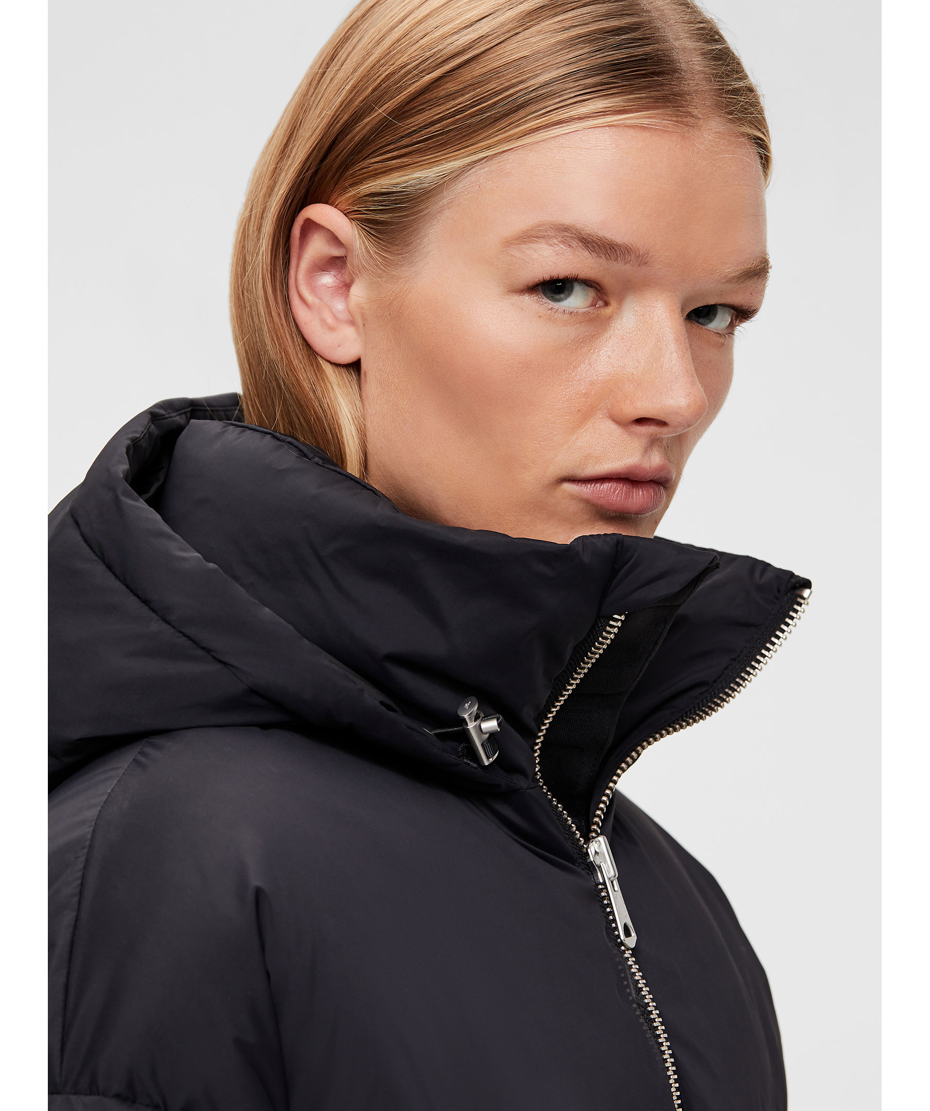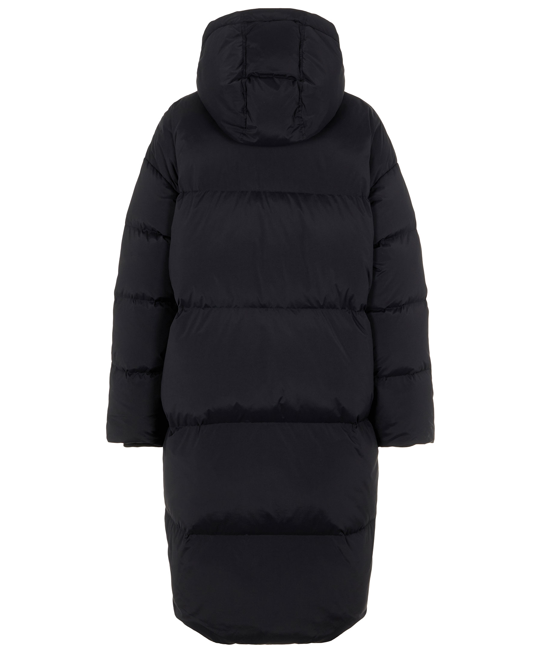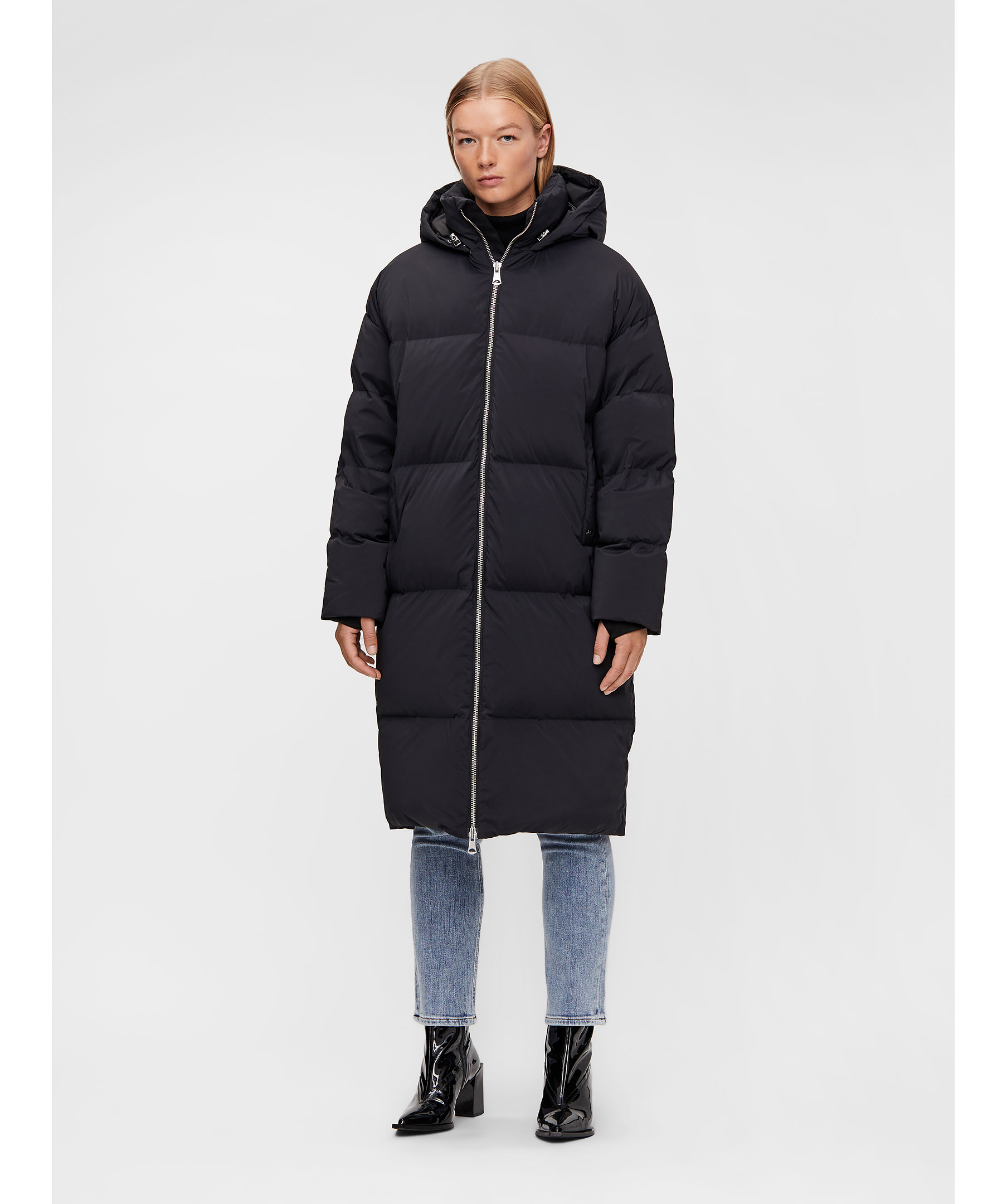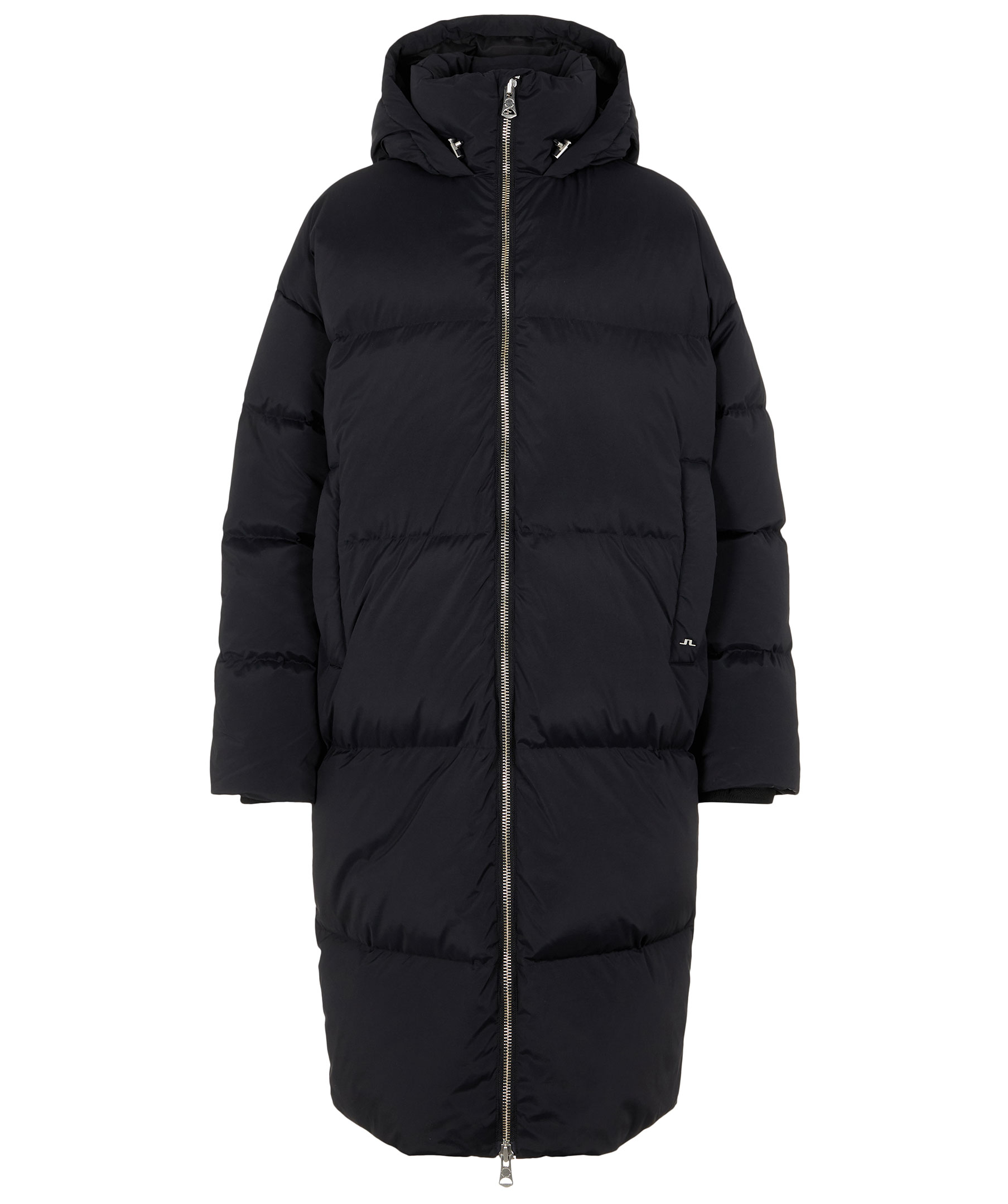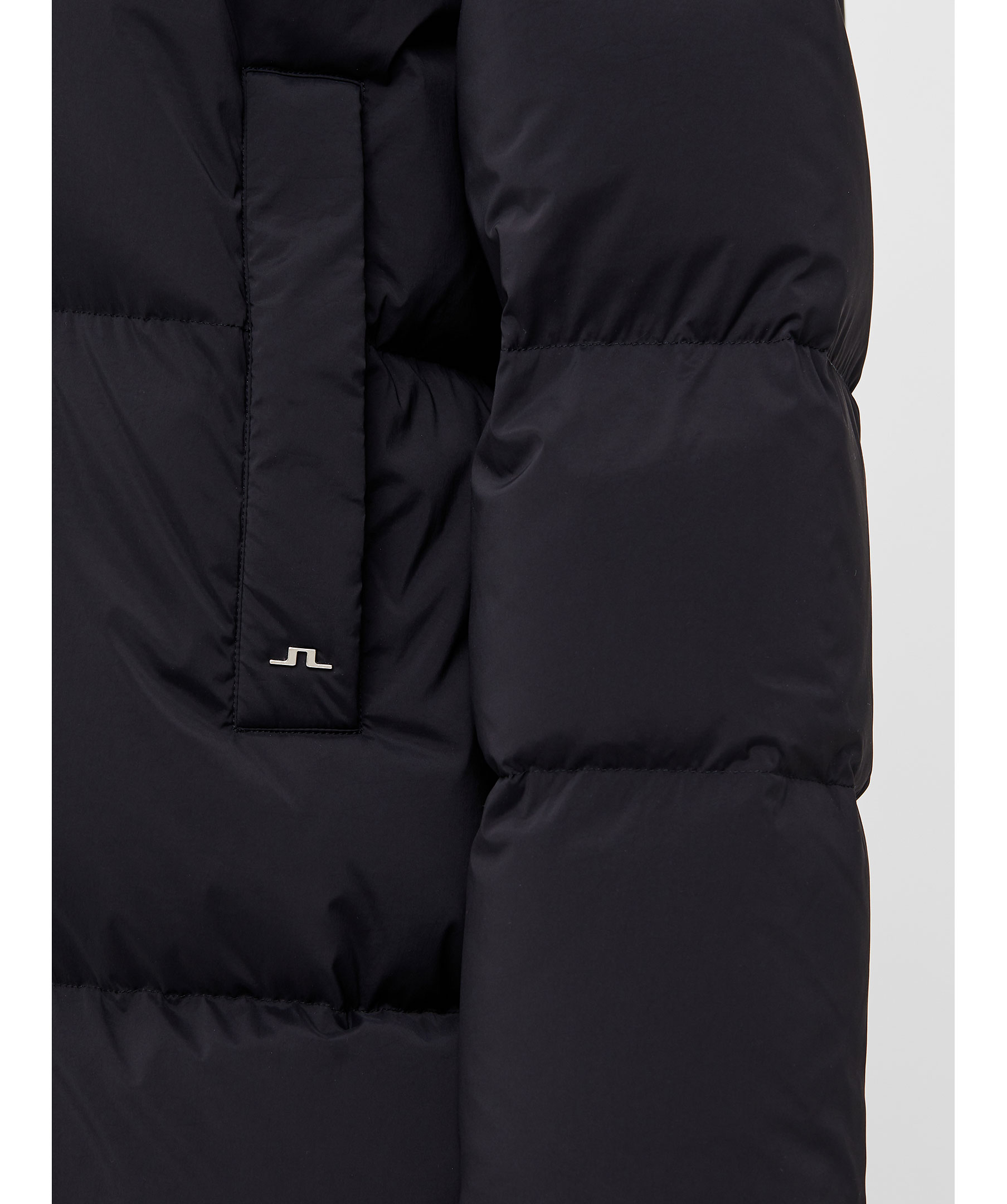 Svart lång dunjacka från J. Lindeberg. Fleecefodrade fickor, luva med justerbar snörning, logga i metall på vänster ficka, en innerficka med dragkedja. *Fleecefodrade fickor *Logga i metall *Innerficka med dragkedja