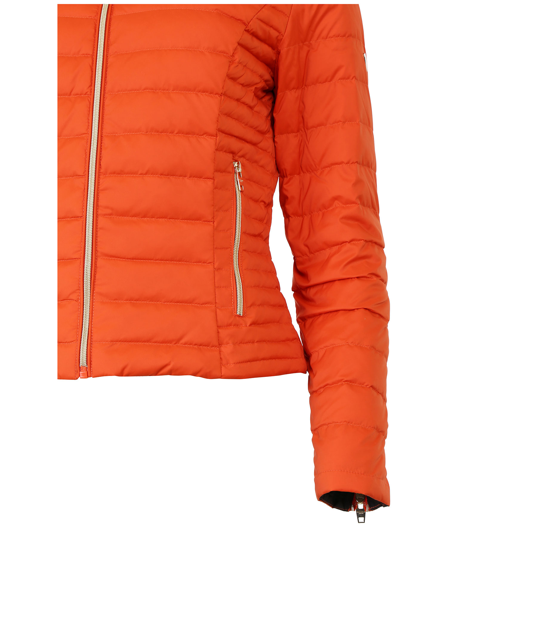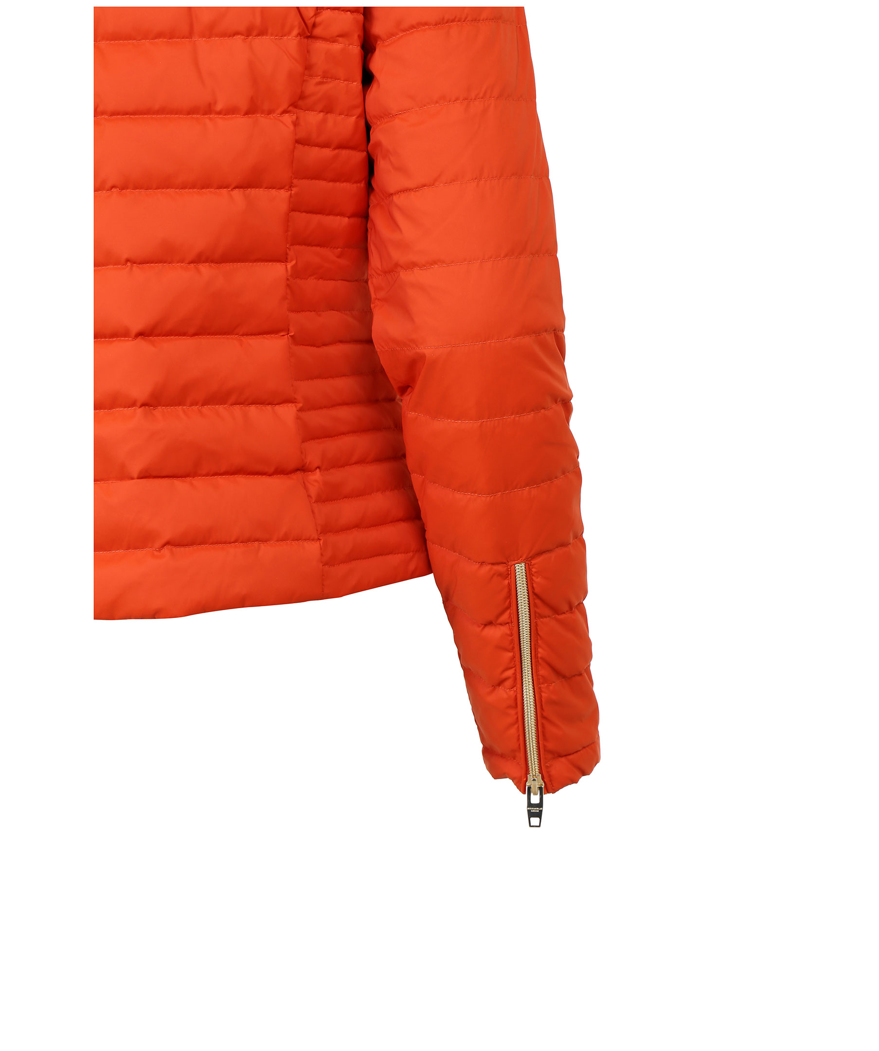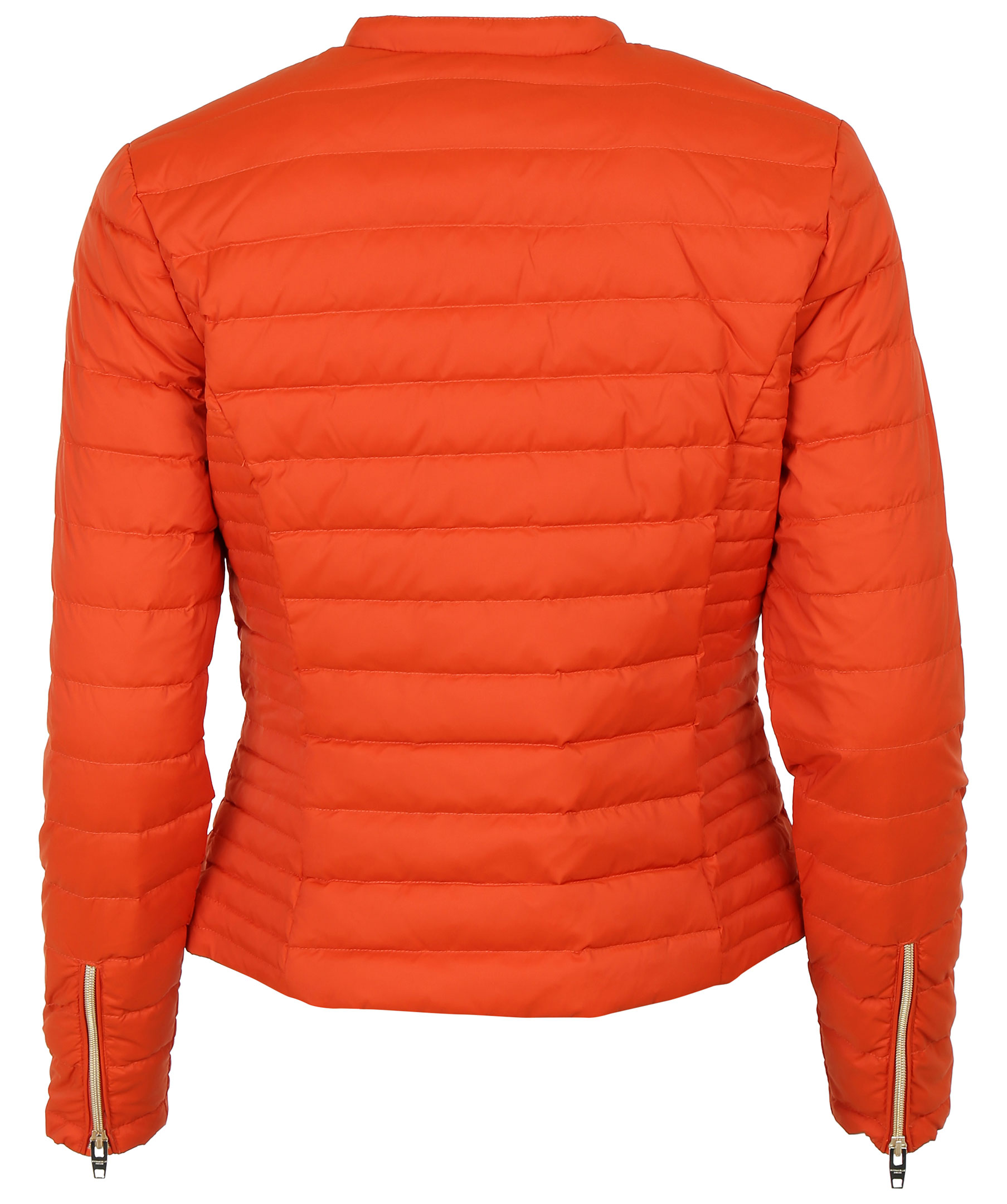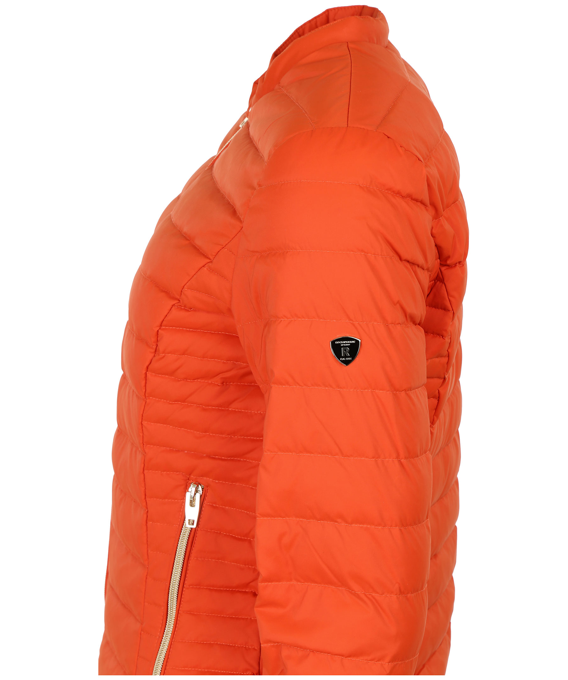Orange lättviktsdunjacka från Rock and Blue. Figursydd med guldfärgade dragkedjor vid ärmslut. Två framfickor och en innerficka. Jackan stängs med dragkedja samt en tryckknapp vid halsen. Liten logga på vänster ärm.