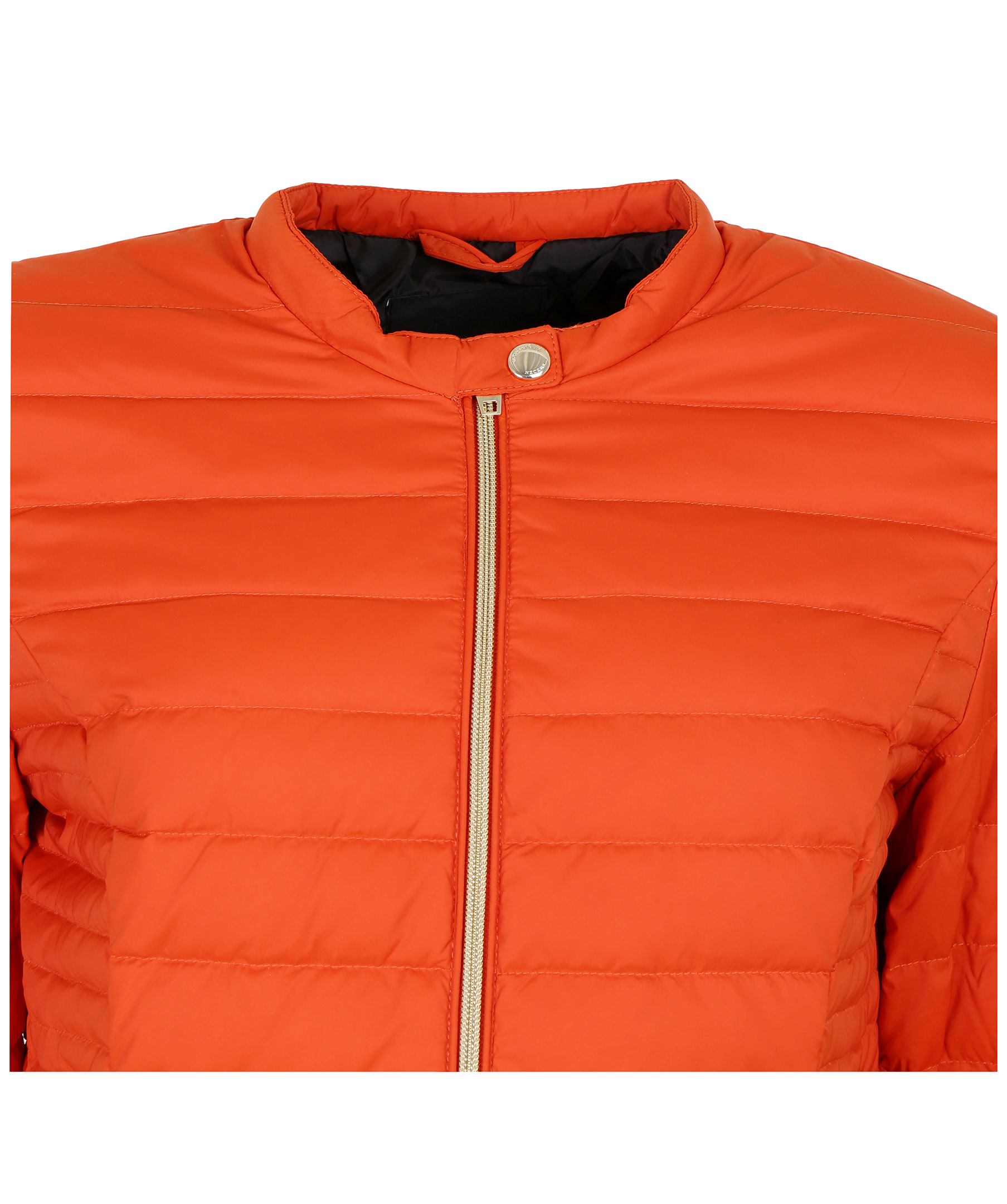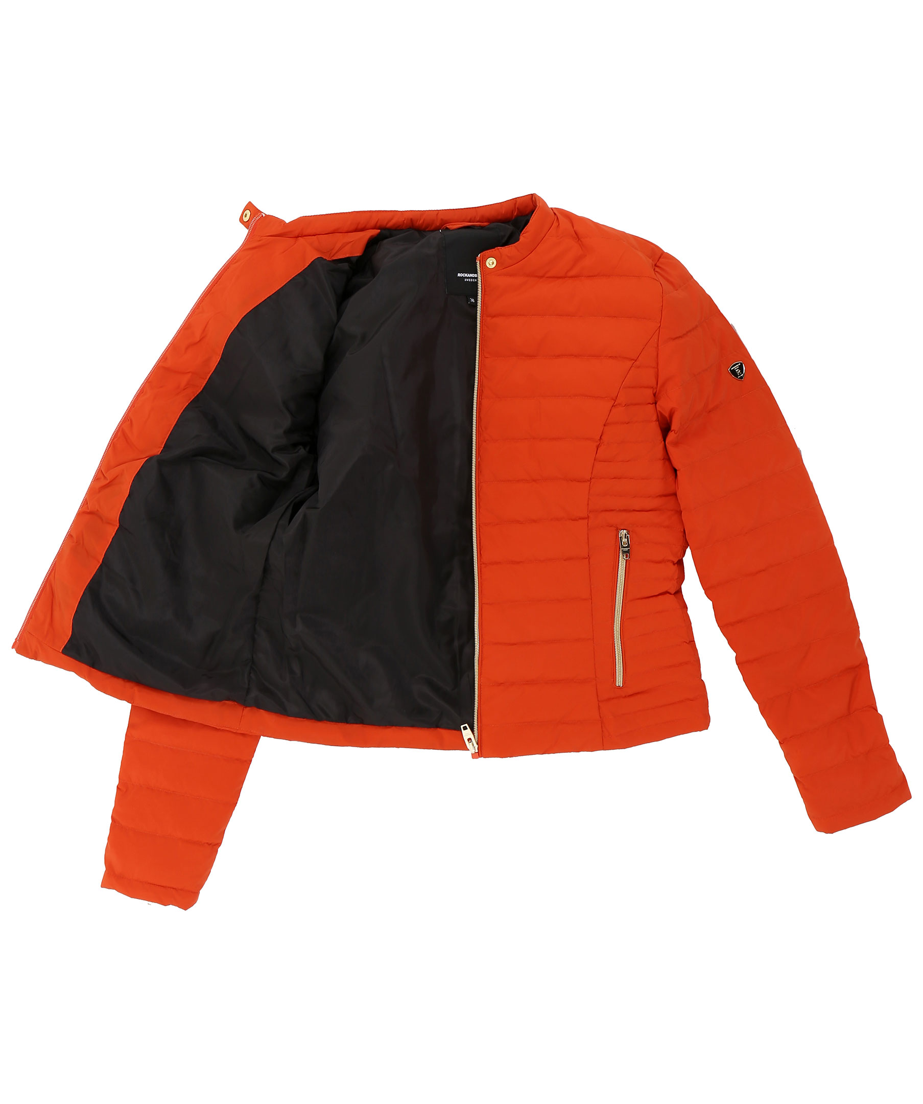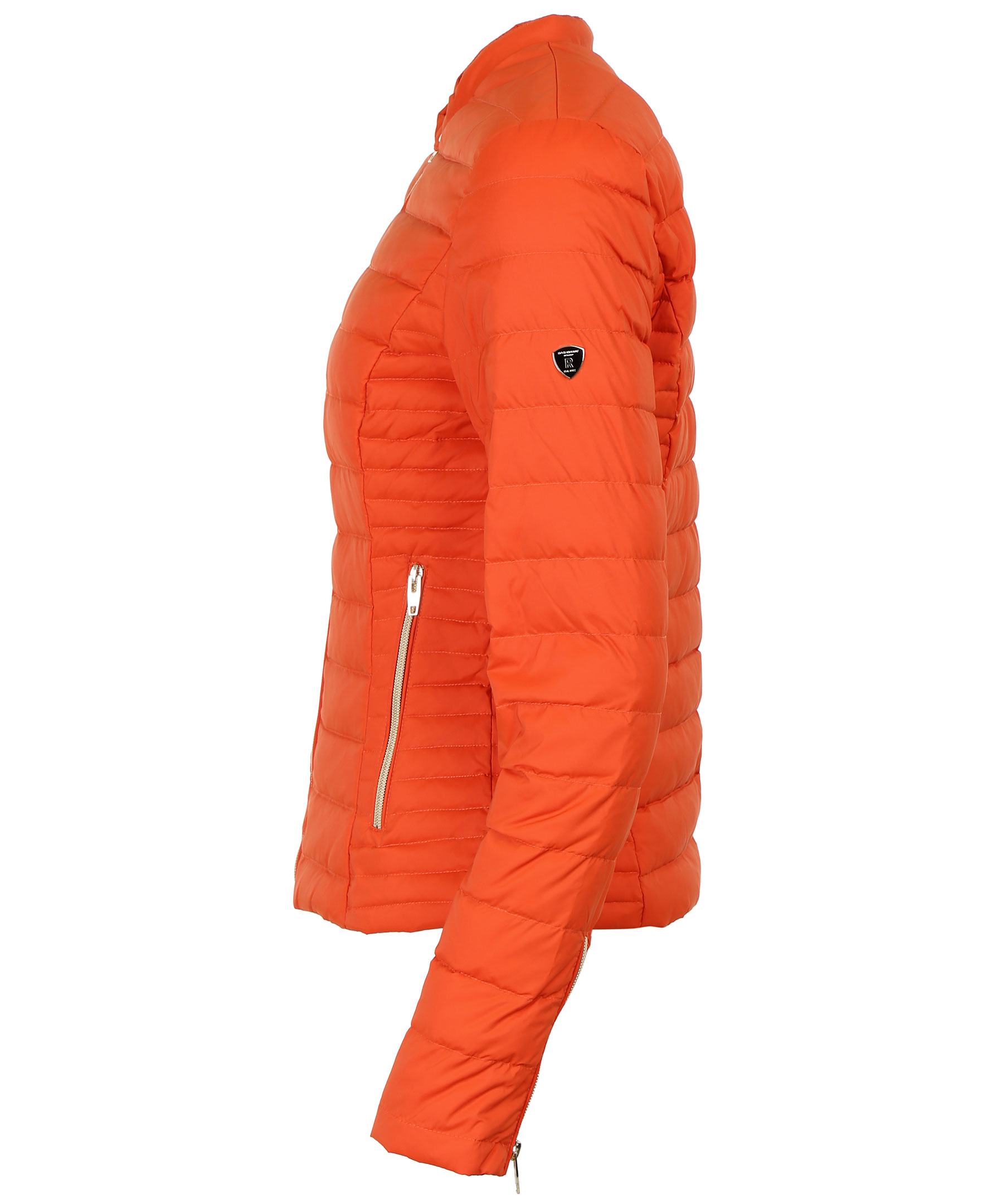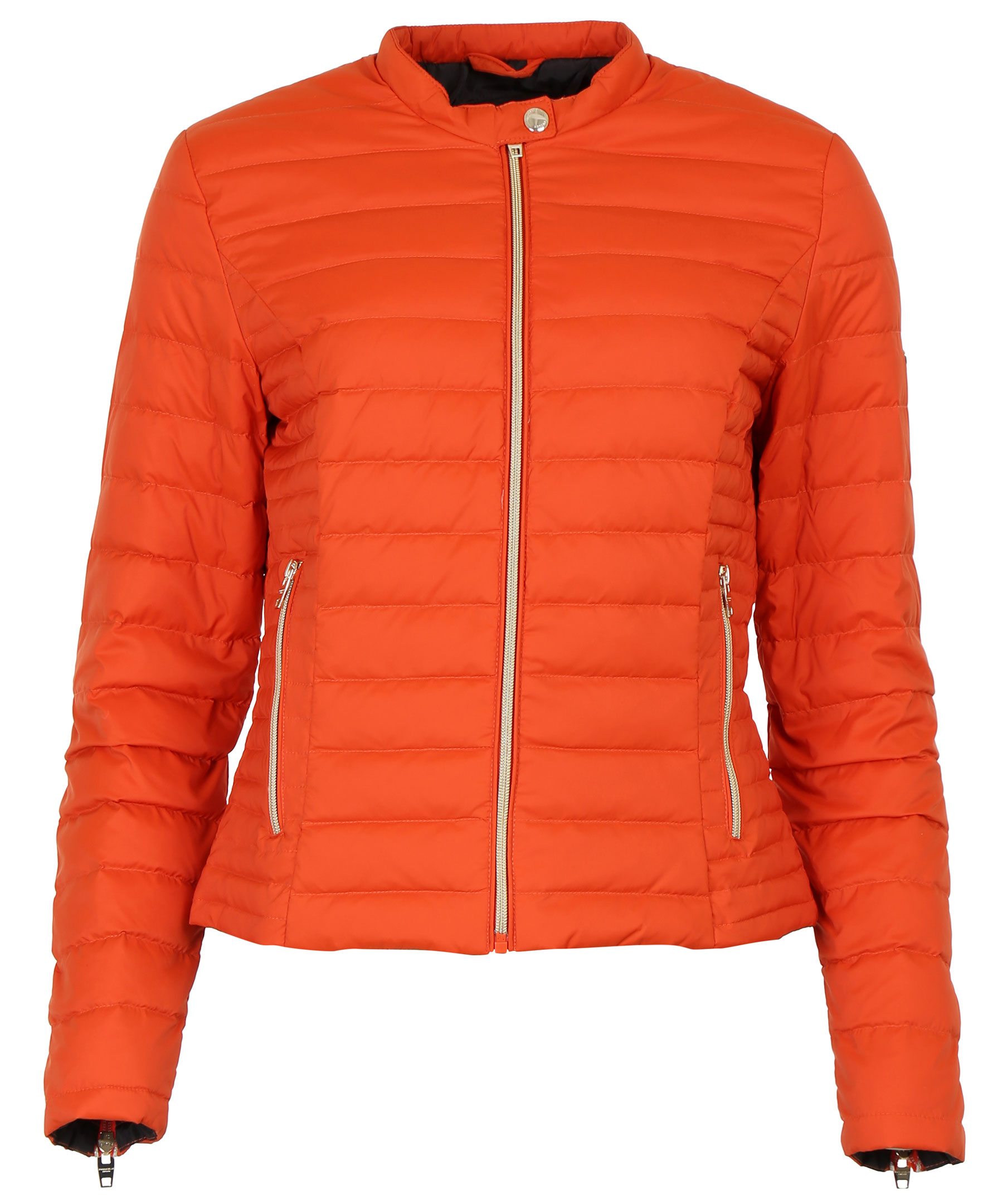 Orange lättviktsdunjacka från Rock and Blue. Figursydd med guldfärgade dragkedjor vid ärmslut. Två framfickor och en innerficka. Jackan stängs med dragkedja samt en tryckknapp vid halsen. Liten logga på vänster ärm.
