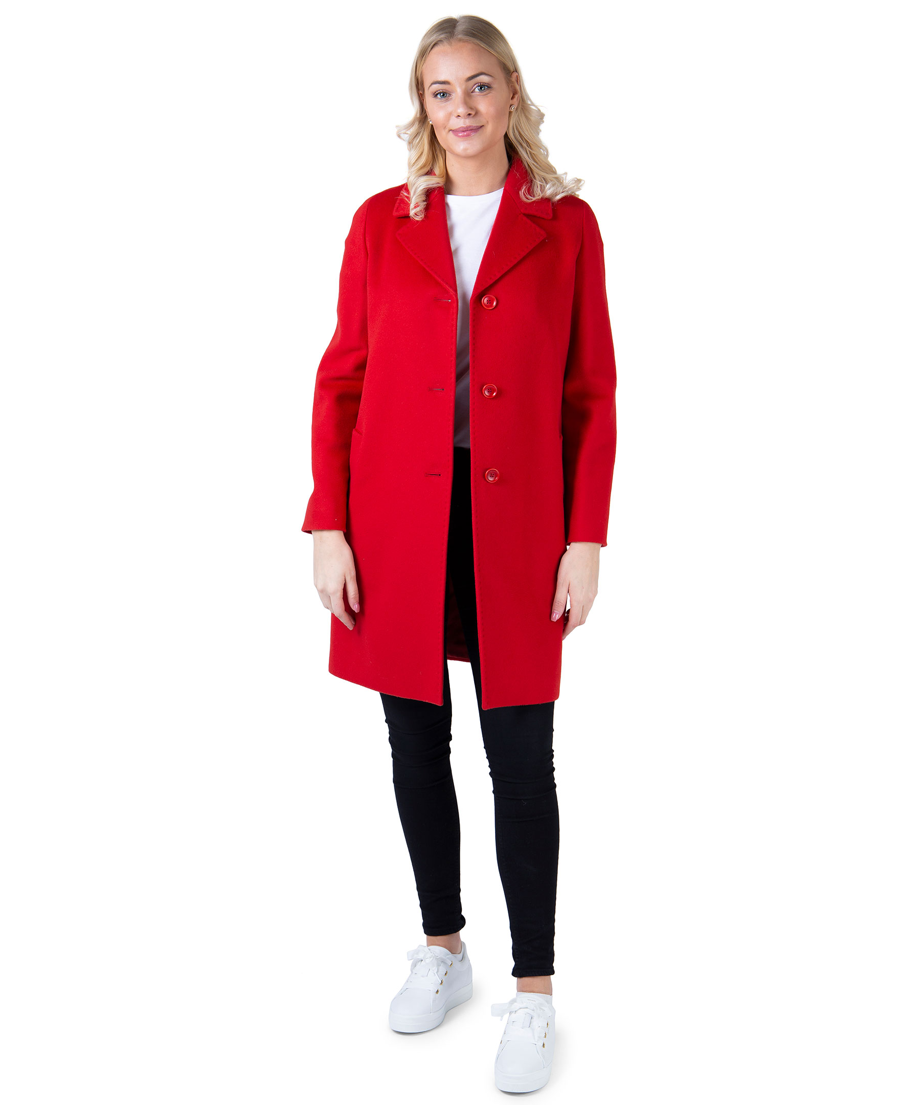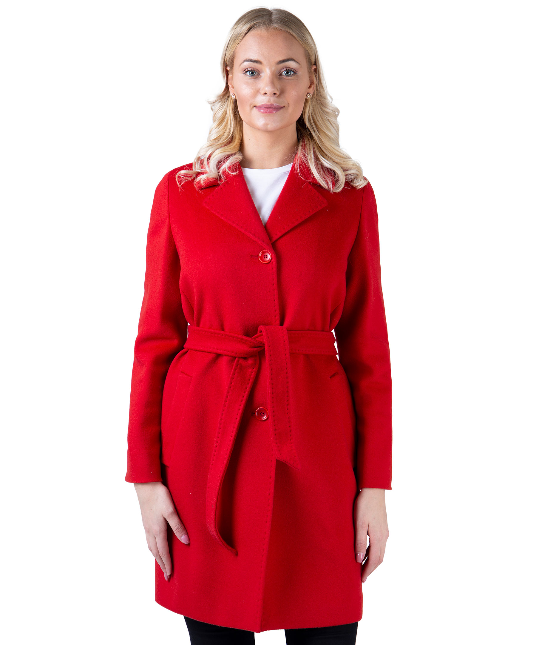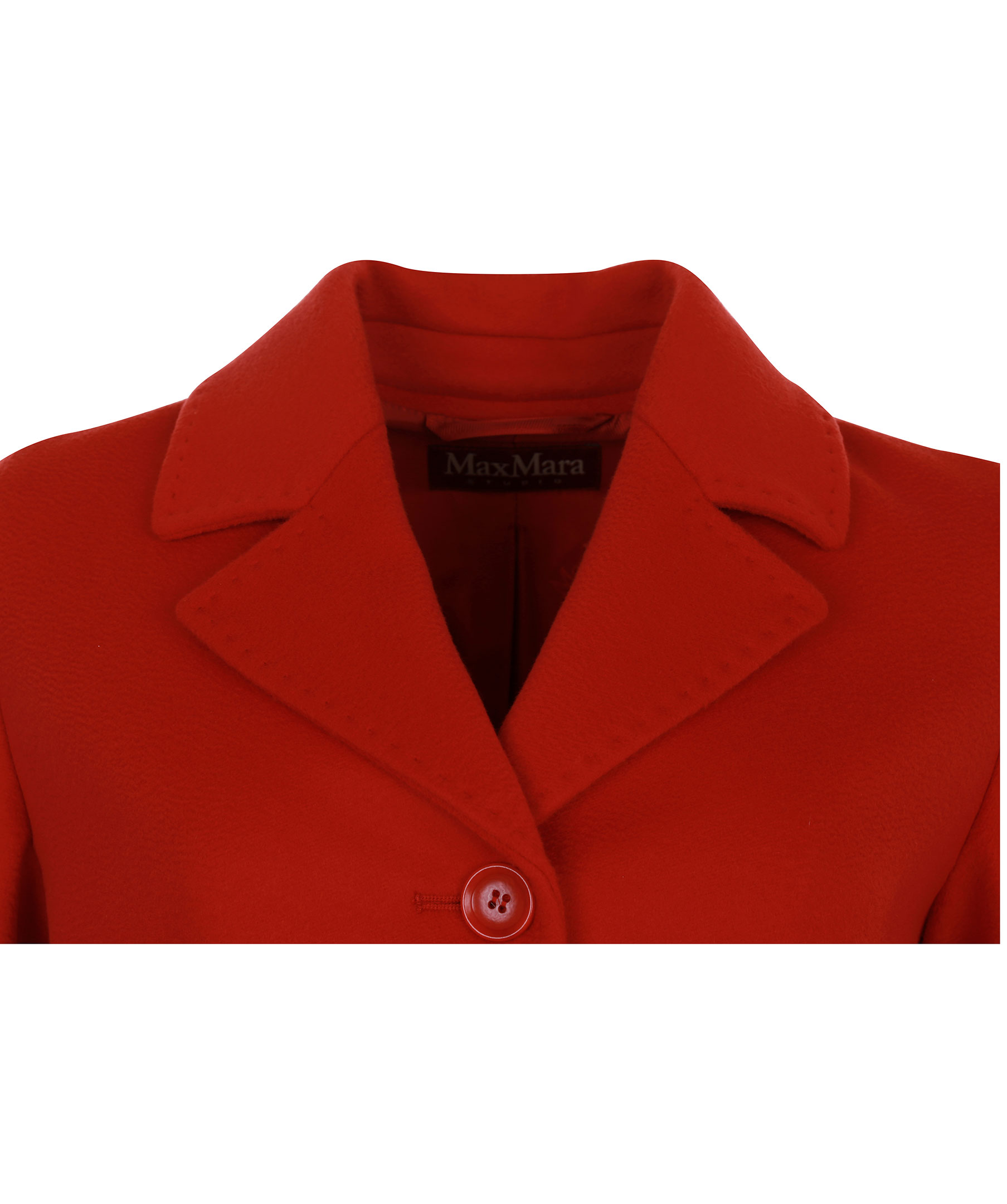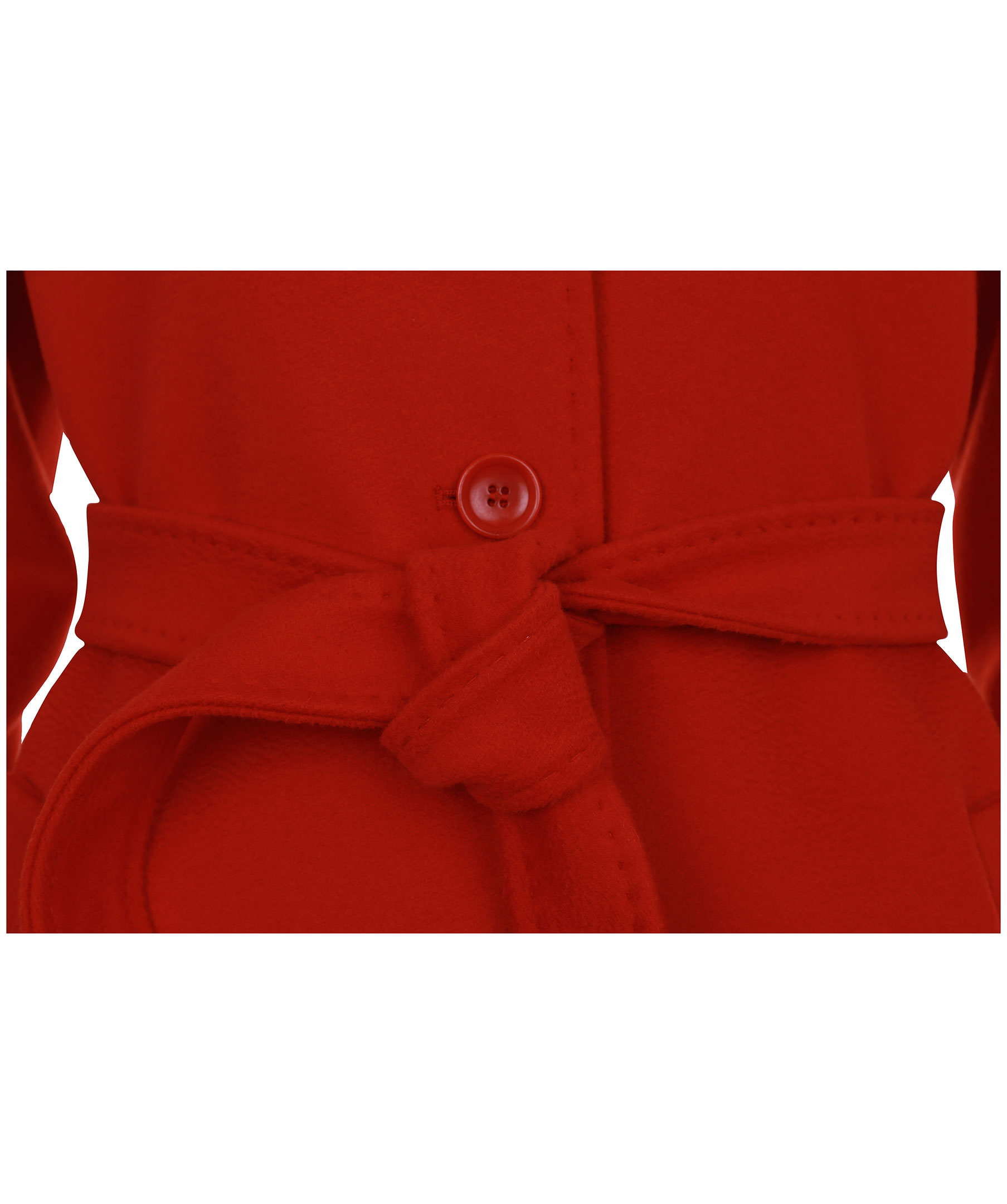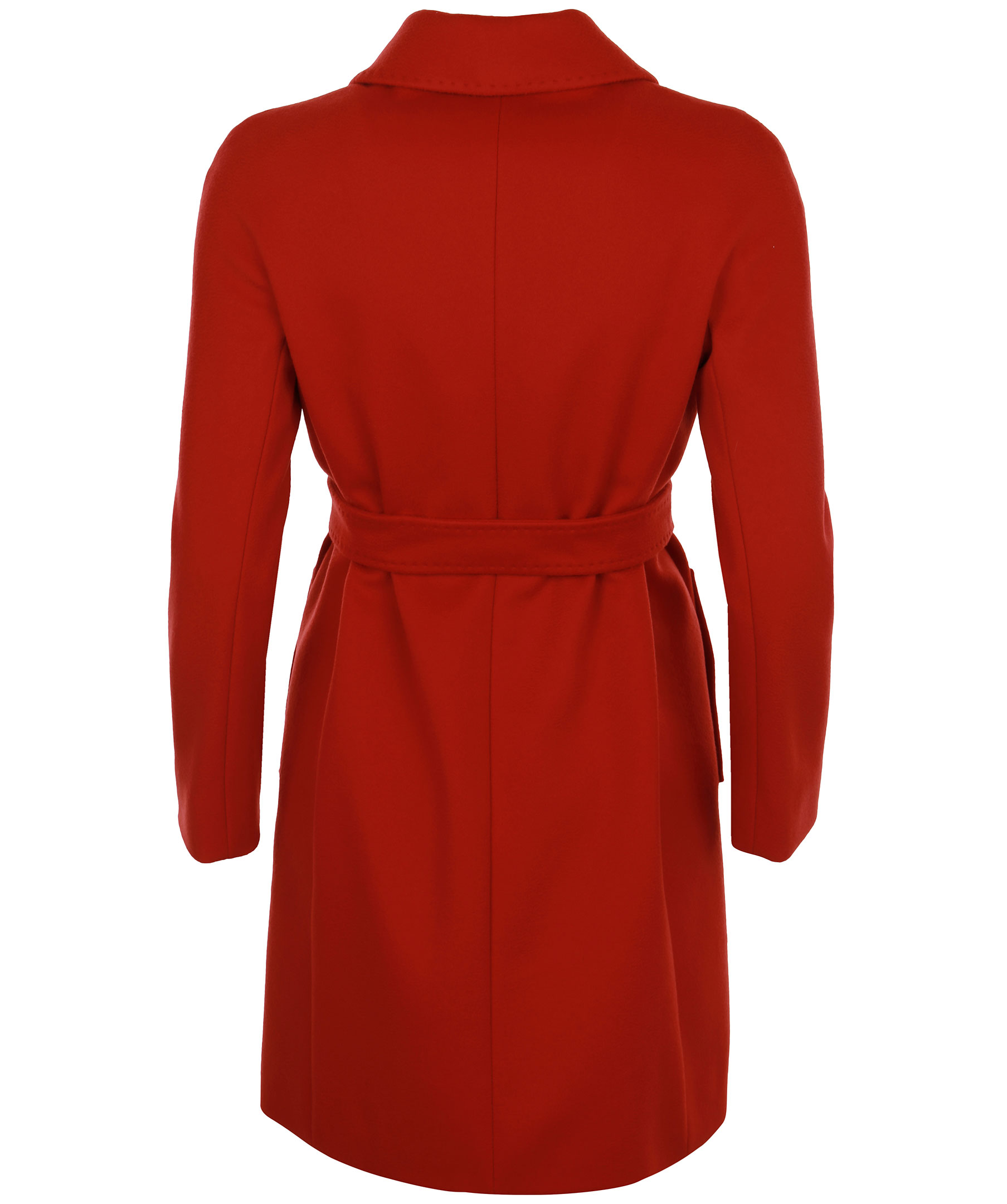 Kappan Sarzana från Max Mara Studio i en vacker röd färg. Snedställda fickor framtill, klassisk krage samt knyt i midjan. Gjord i fantastiskt mjuk ren ny ull. Stängs med knappar.