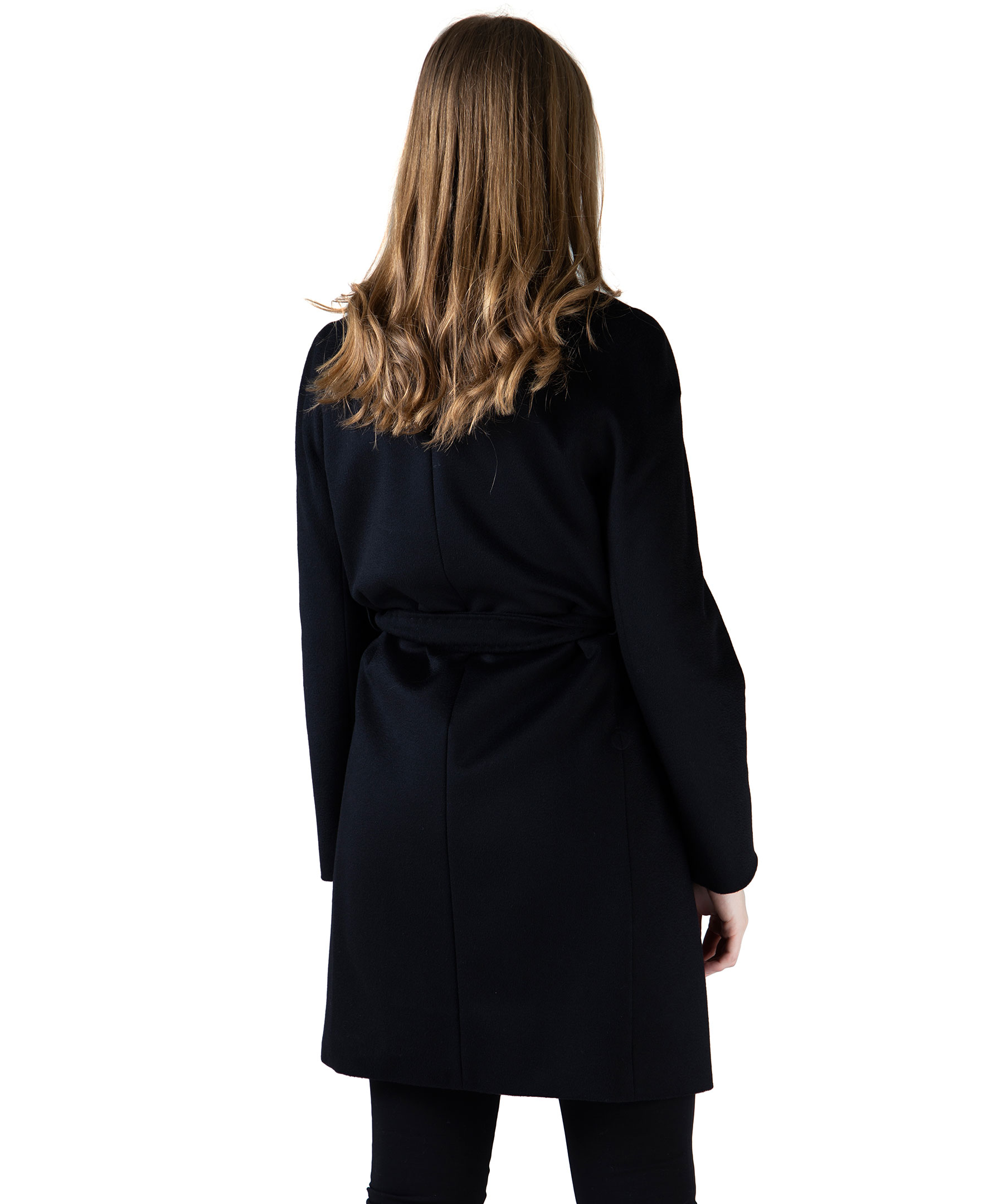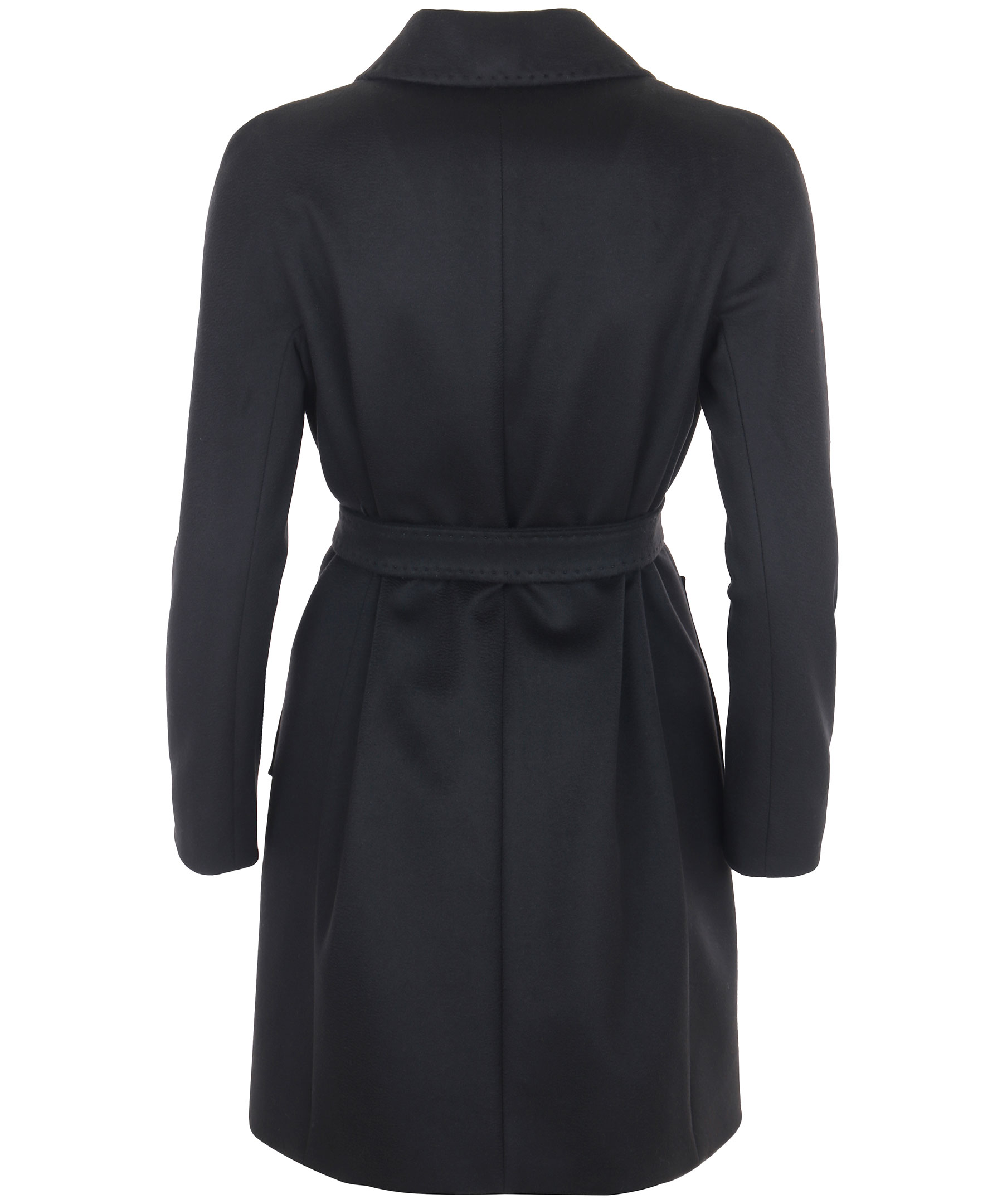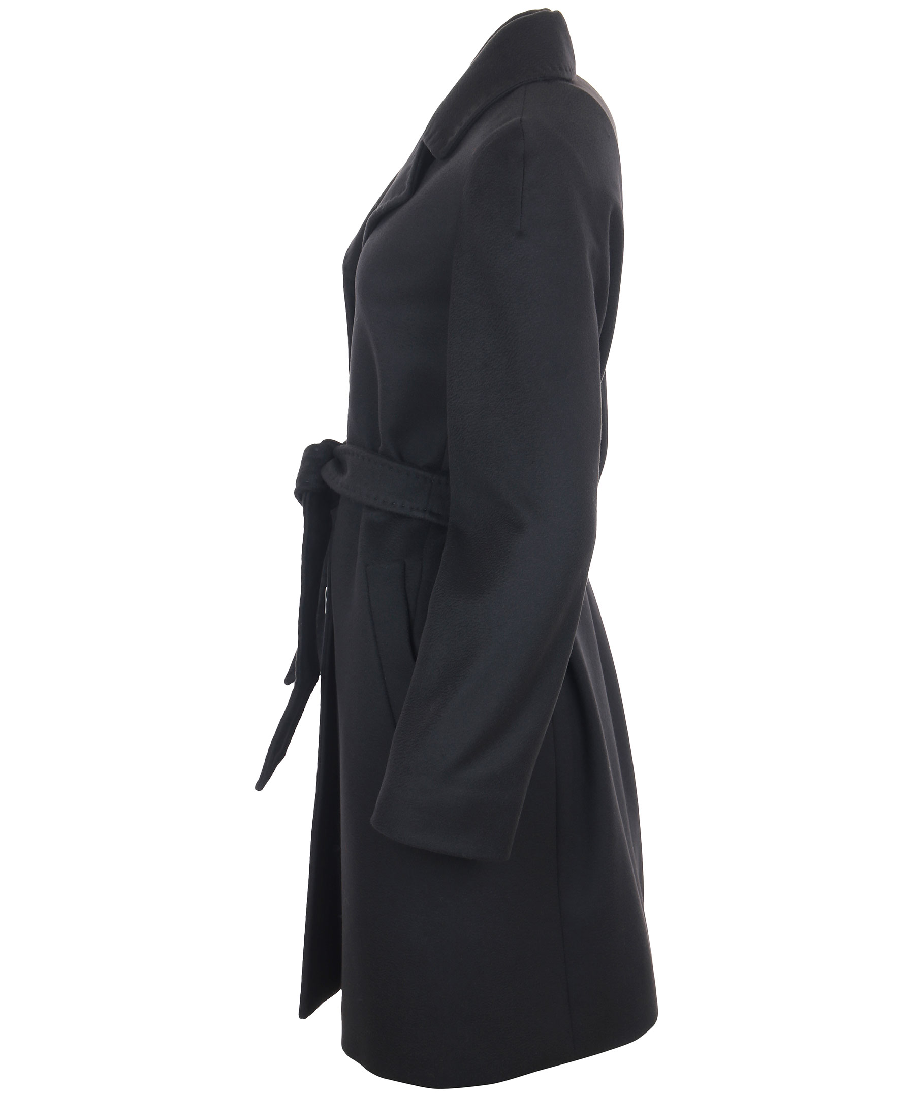 Kappan Sarzana från Max Mara Studio i svart färg. Snedställda fickor framtill, klassisk krage samt knyt i midjan. Gjord i fantastiskt mjuk ren ny ull. Stängs med knappar. Modellen är 173 cm lång och bär storlek 36.