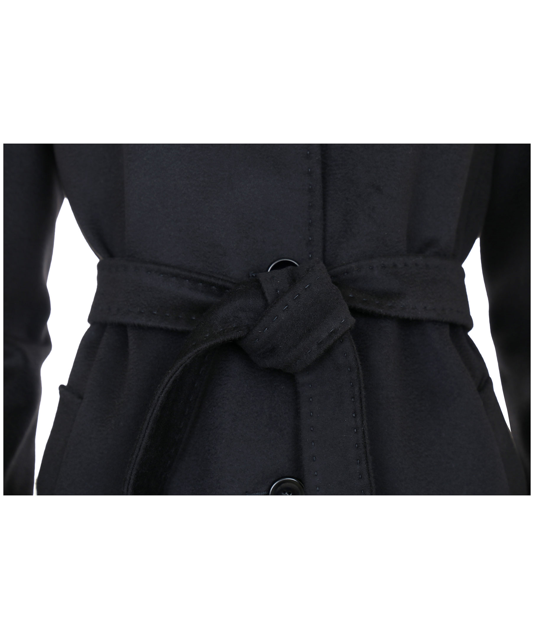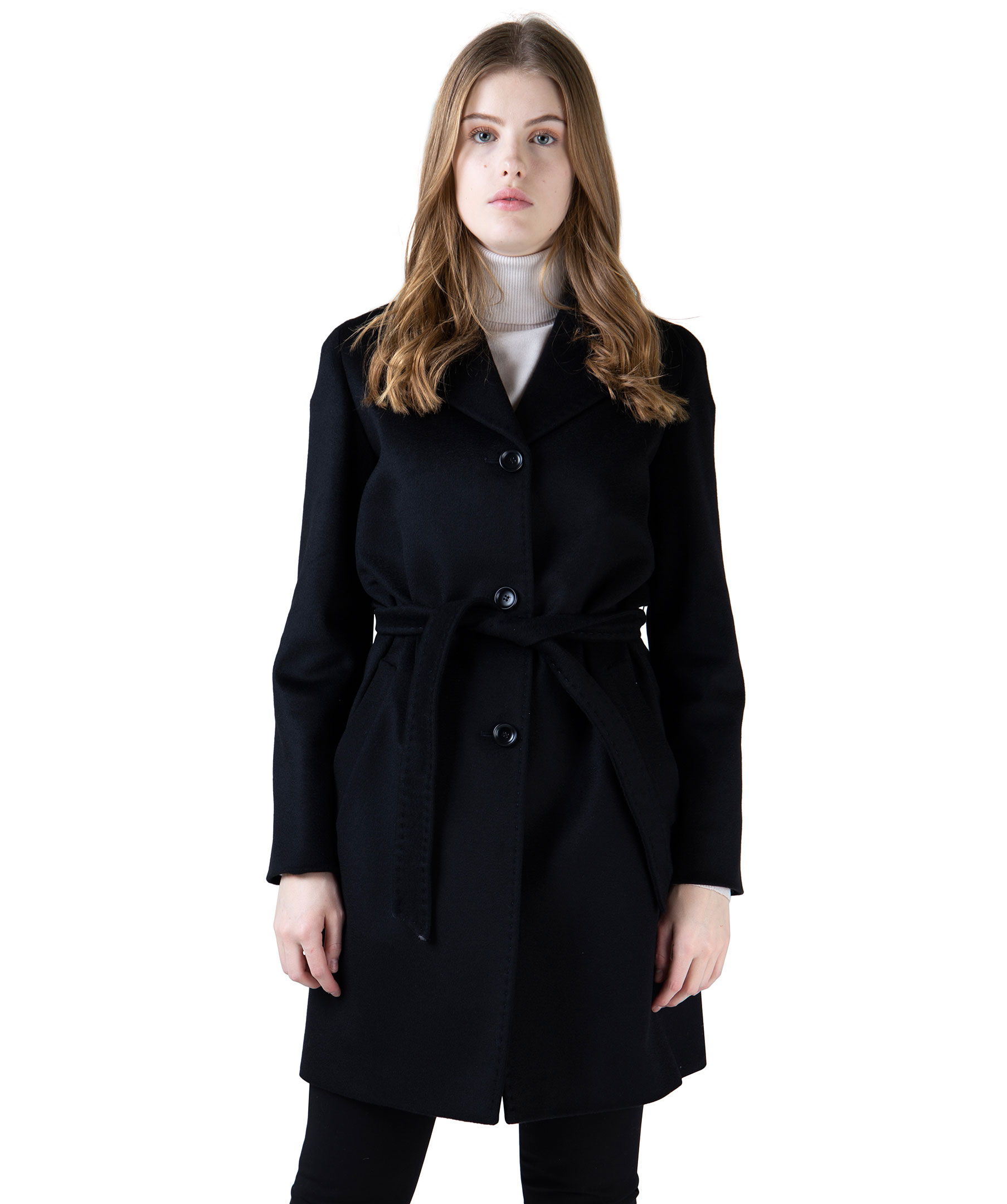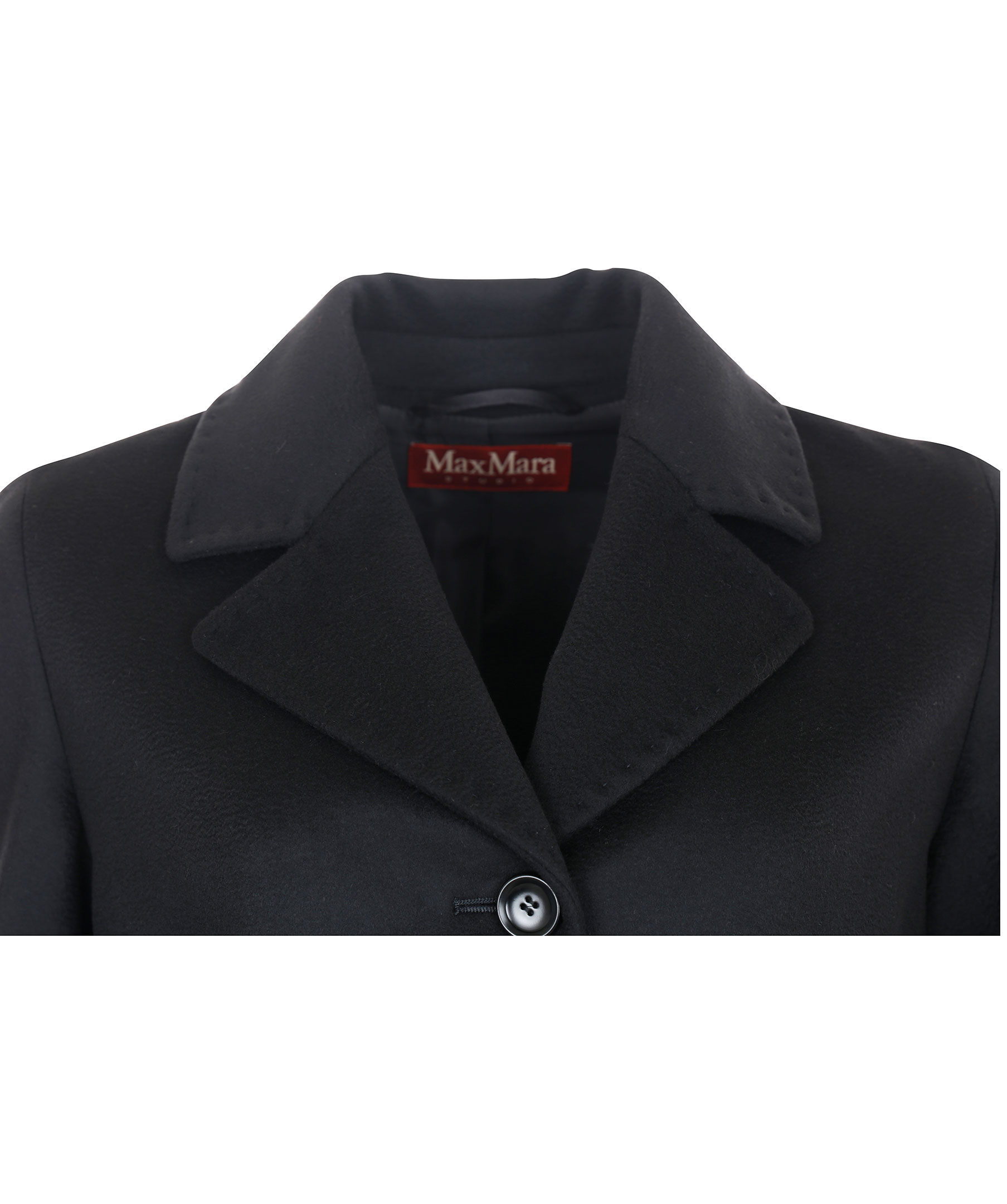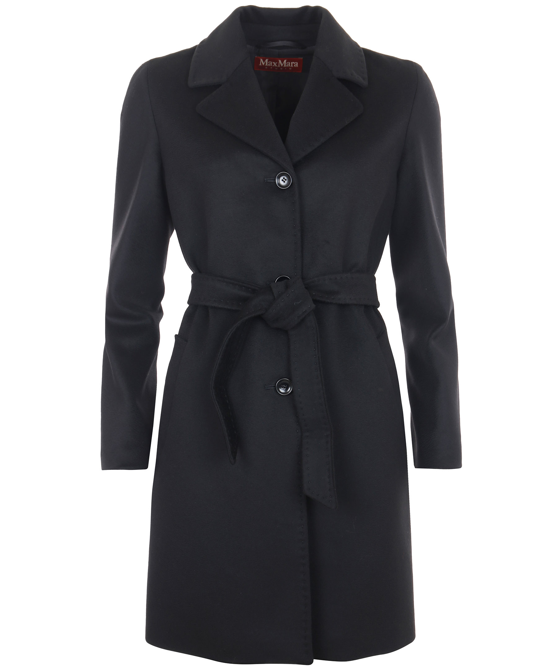 Kappan Sarzana från Max Mara Studio i svart färg. Snedställda fickor framtill, klassisk krage samt knyt i midjan. Gjord i fantastiskt mjuk ren ny ull. Stängs med knappar. Modellen är 173 cm lång och bär storlek 36.