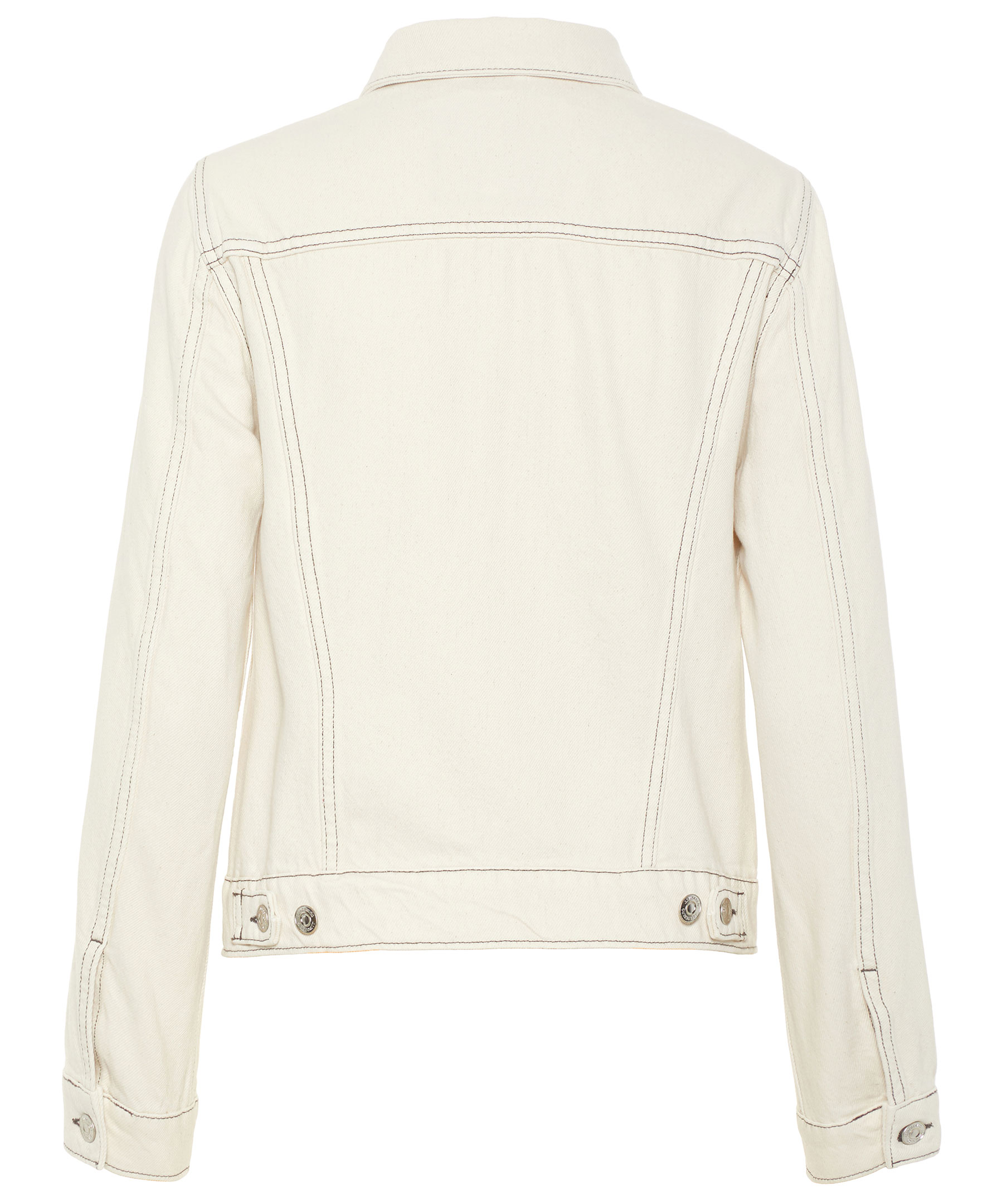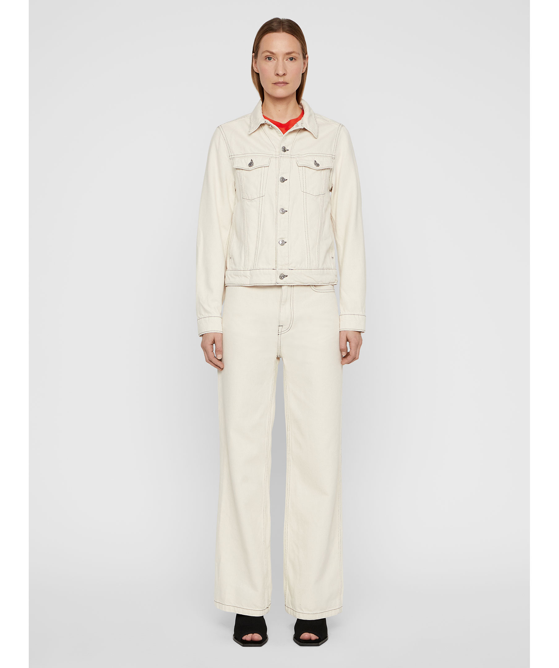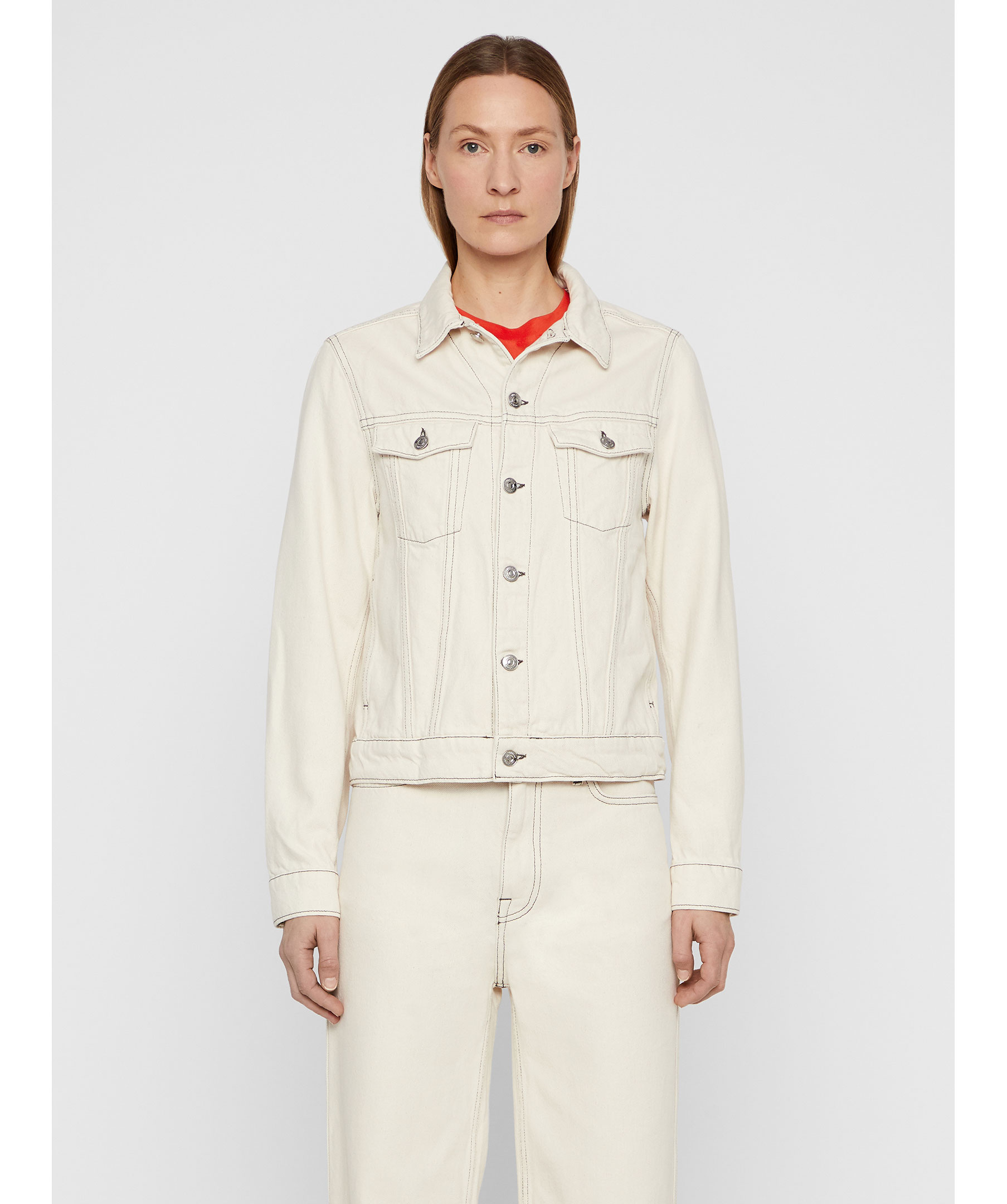 Vit jeansjacka från J. Lindeberg. Tillverkad i bomull. Två bröstfickor, silverfärgade knappar, kontrastfärgade sömmar.
