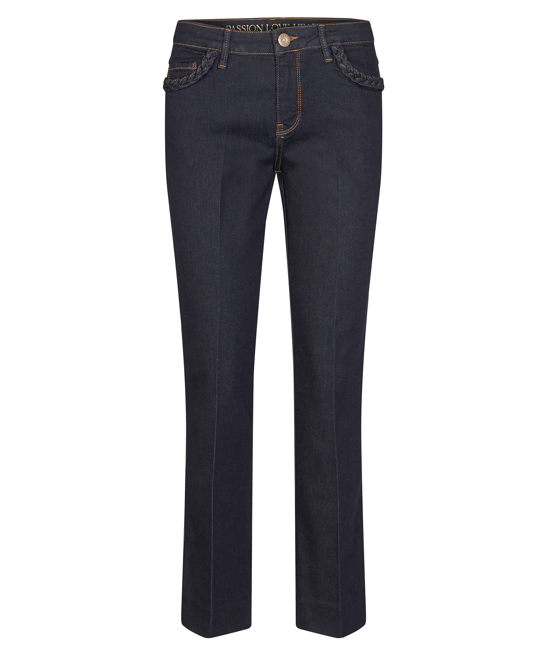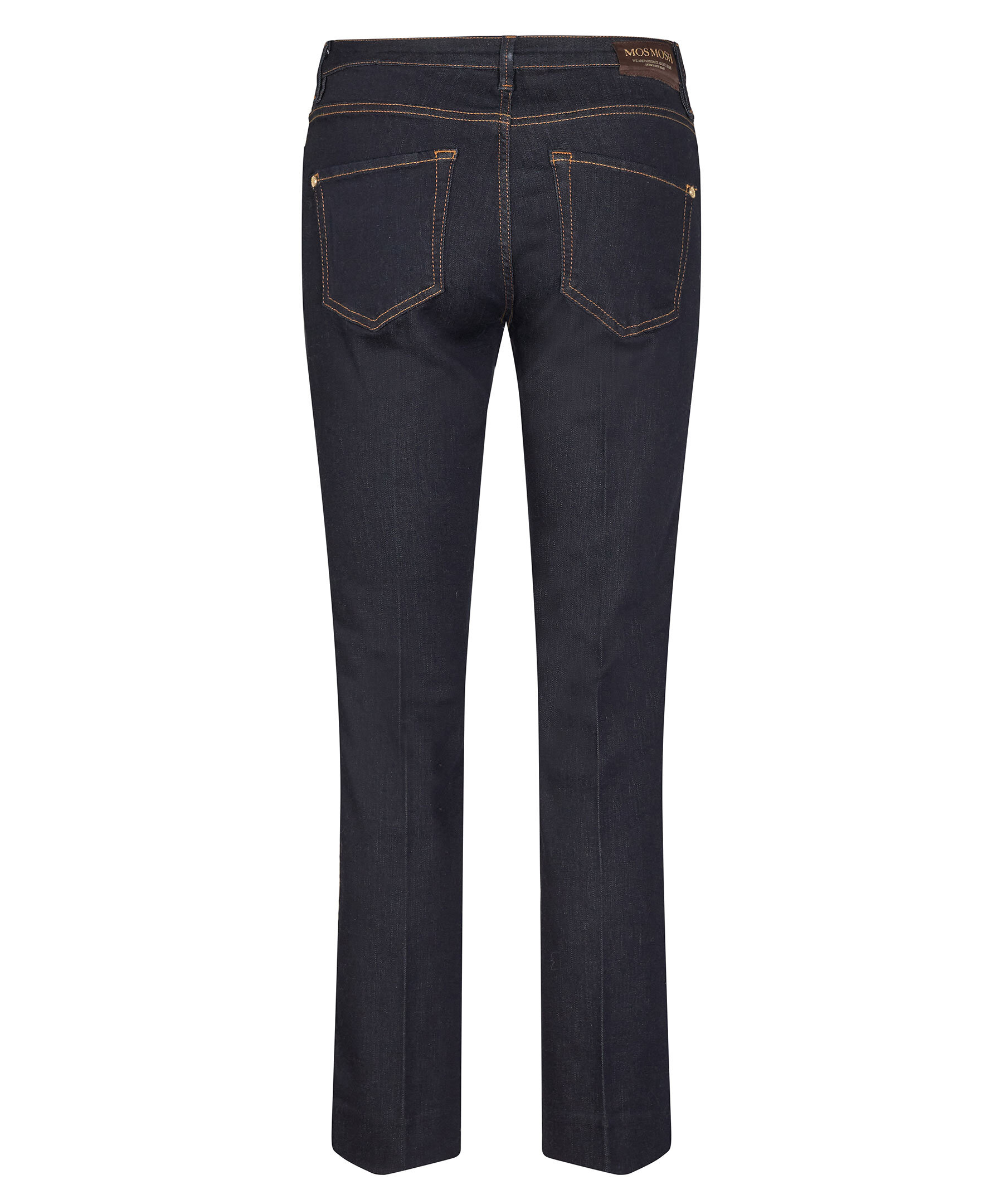 Mörkblå jeans från Mos Mosh. Flätade detaljer vid fickorna, ankellånga och lätt utsvängd modell, hög i midjan.