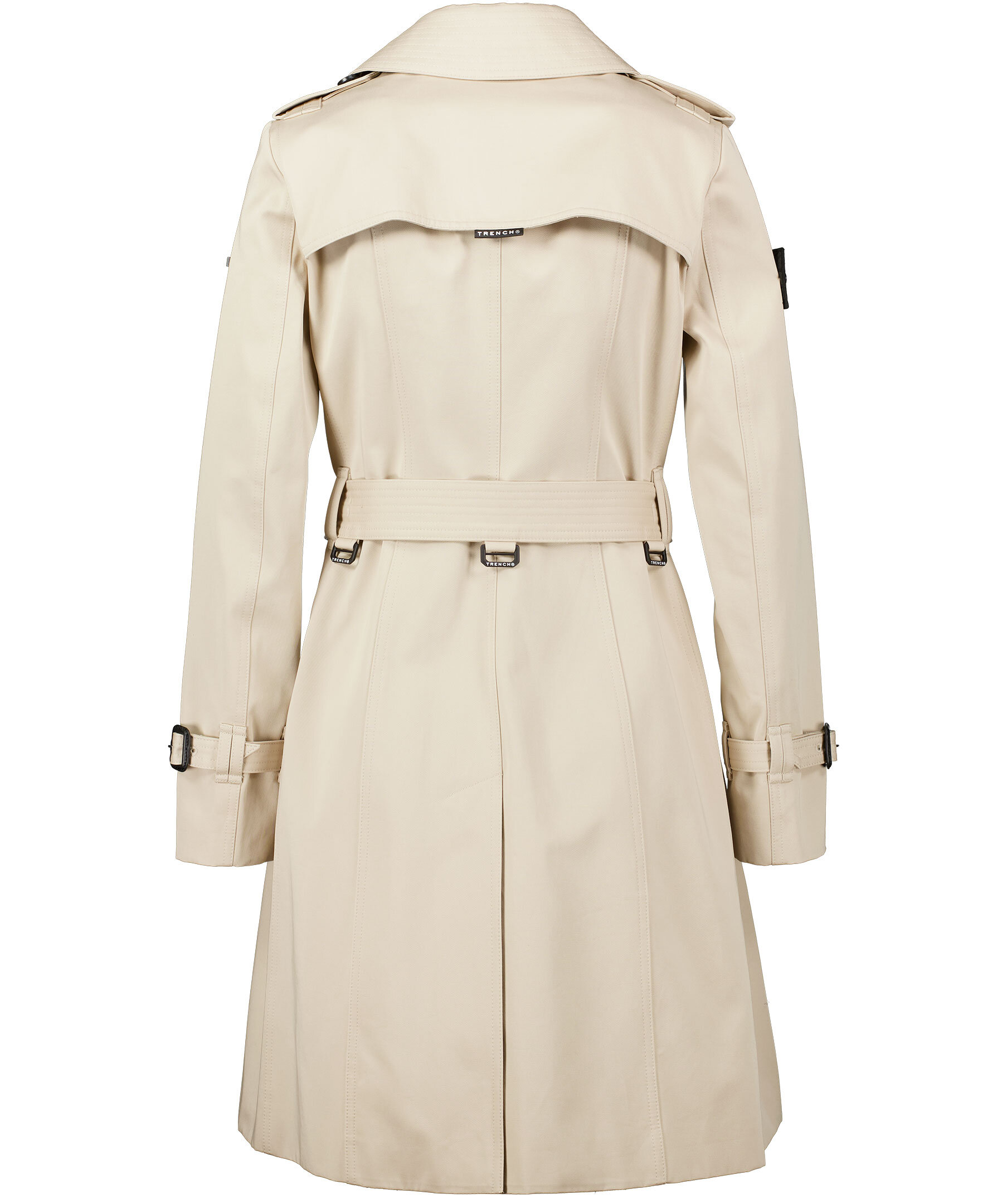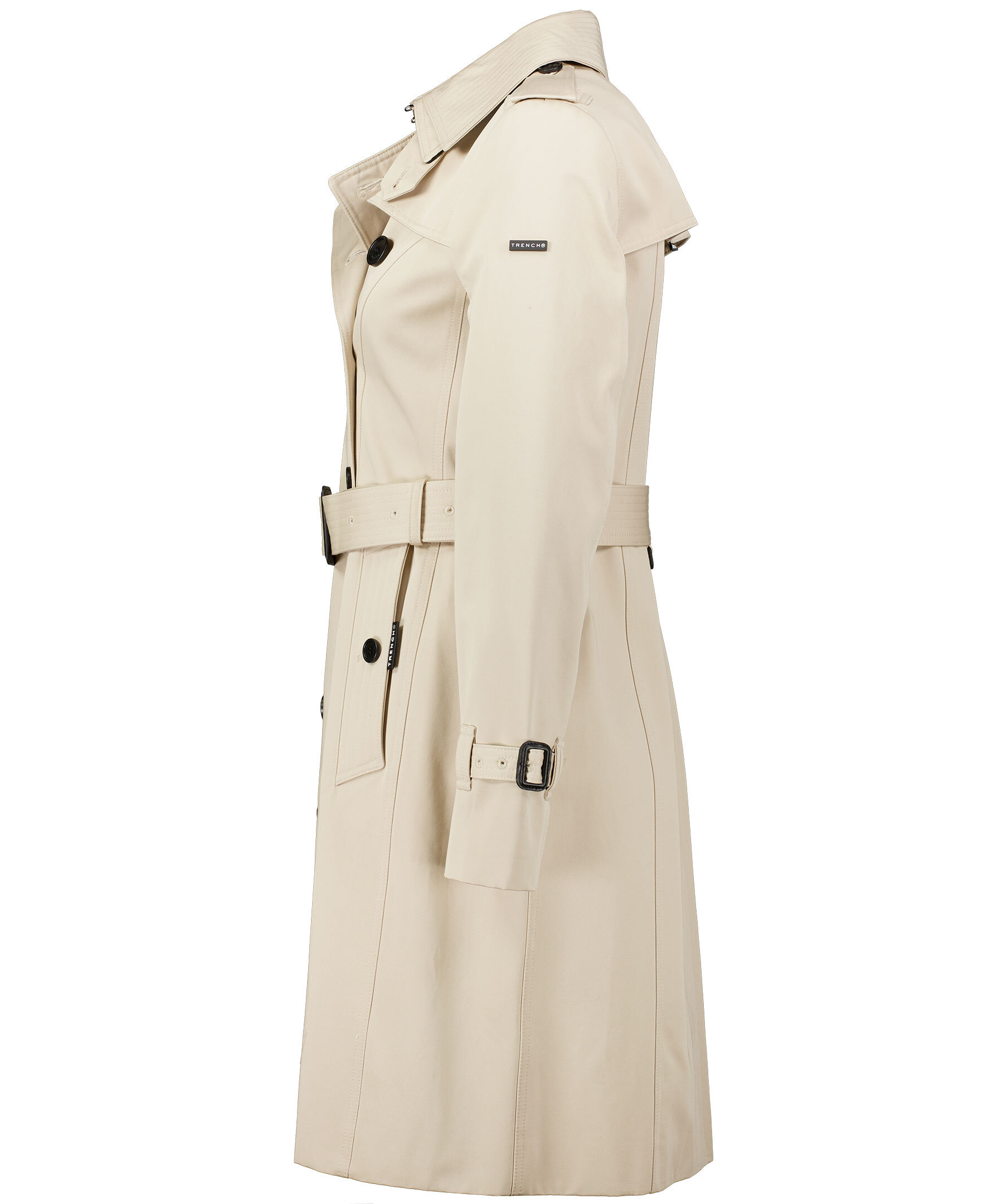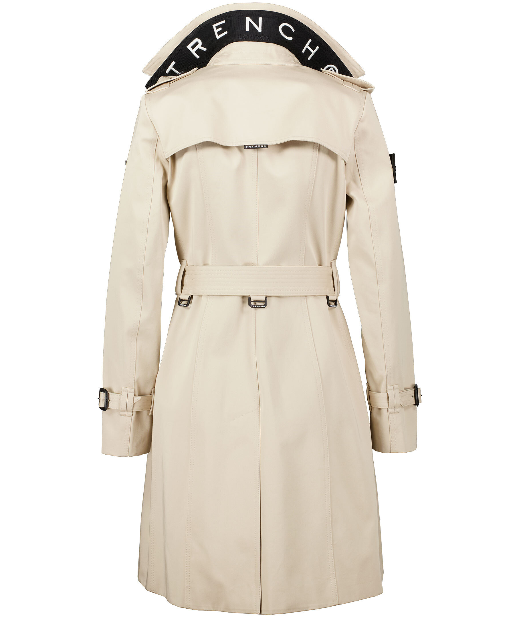 Beige, skräddarsydd trenchcoat från Trench London. Yttermaterial i 100% bomull och svart foder i satin, liten i storlek, vi rekommenderar att man går upp en storlek i denna kappa. Fin figursydd passform, ikonisk dubbelknäppning fram med svarta knappar. Dubbel krage med stor, broderad logotyp i vitt med svart bakgrund när man viker upp kragen. Svart, broderat flaggmärke med logotyp i silvertråd som går att ta bort med knappar på höger ärm samt en liten svart metallbricka med vit logotyp på vänster ärm. Bälte i midjan med ett spänne i svart läder samt manschetter vid ärmslut med spänne i svart läder. Hälla och krok längst upp vid halsen i metall samt krok i nacken i metallkejda. Fickor i sidorna med knapp och en innerficka samt spännen med knapp på axlarna. Modellen är 175 cm lång och bär storlek S.