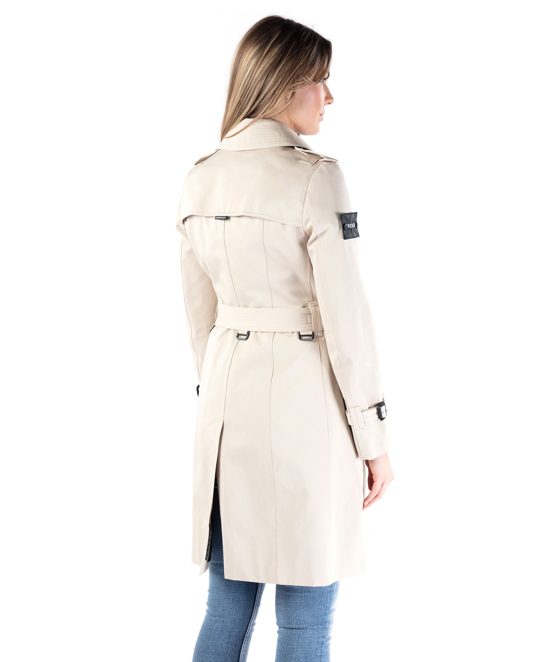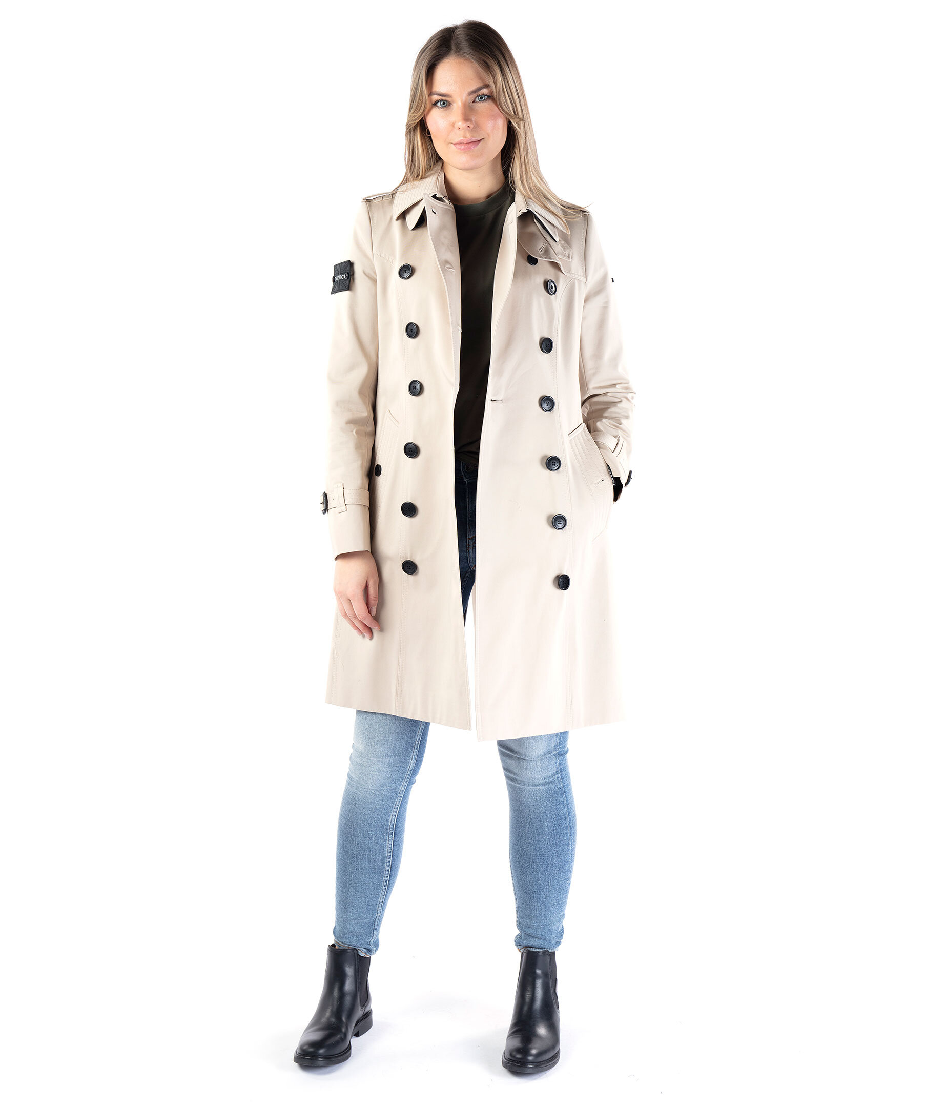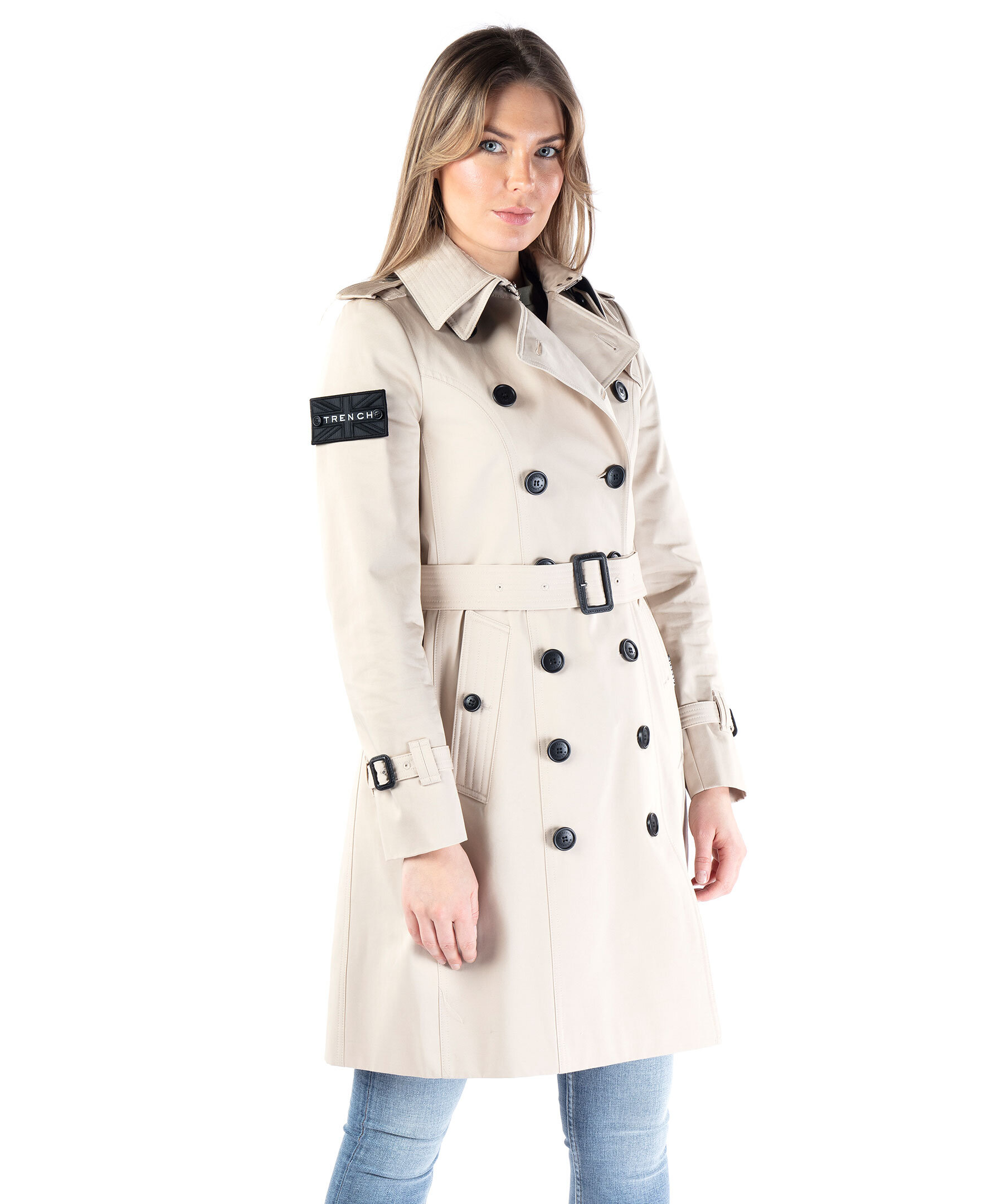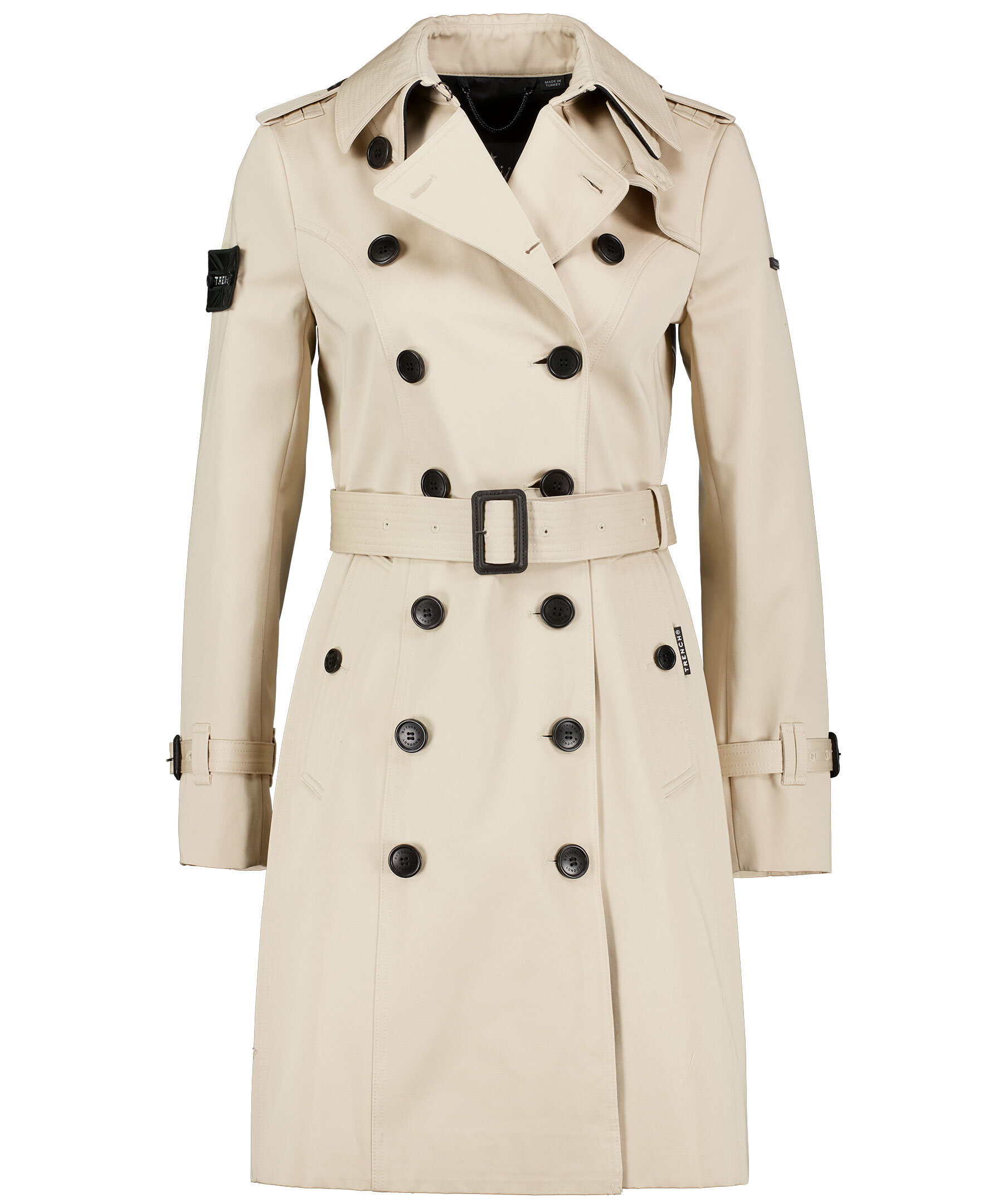 Beige, skräddarsydd trenchcoat från Trench London. Yttermaterial i 100% bomull och svart foder i satin, liten i storlek, vi rekommenderar att man går upp en storlek i denna kappa. Fin figursydd passform, ikonisk dubbelknäppning fram med svarta knappar. Dubbel krage med stor, broderad logotyp i vitt med svart bakgrund när man viker upp kragen. Svart, broderat flaggmärke med logotyp i silvertråd som går att ta bort med knappar på höger ärm samt en liten svart metallbricka med vit logotyp på vänster ärm. Bälte i midjan med ett spänne i svart läder samt manschetter vid ärmslut med spänne i svart läder. Hälla och krok längst upp vid halsen i metall samt krok i nacken i metallkejda. Fickor i sidorna med knapp och en innerficka samt spännen med knapp på axlarna. Modellen är 175 cm lång och bär storlek S.