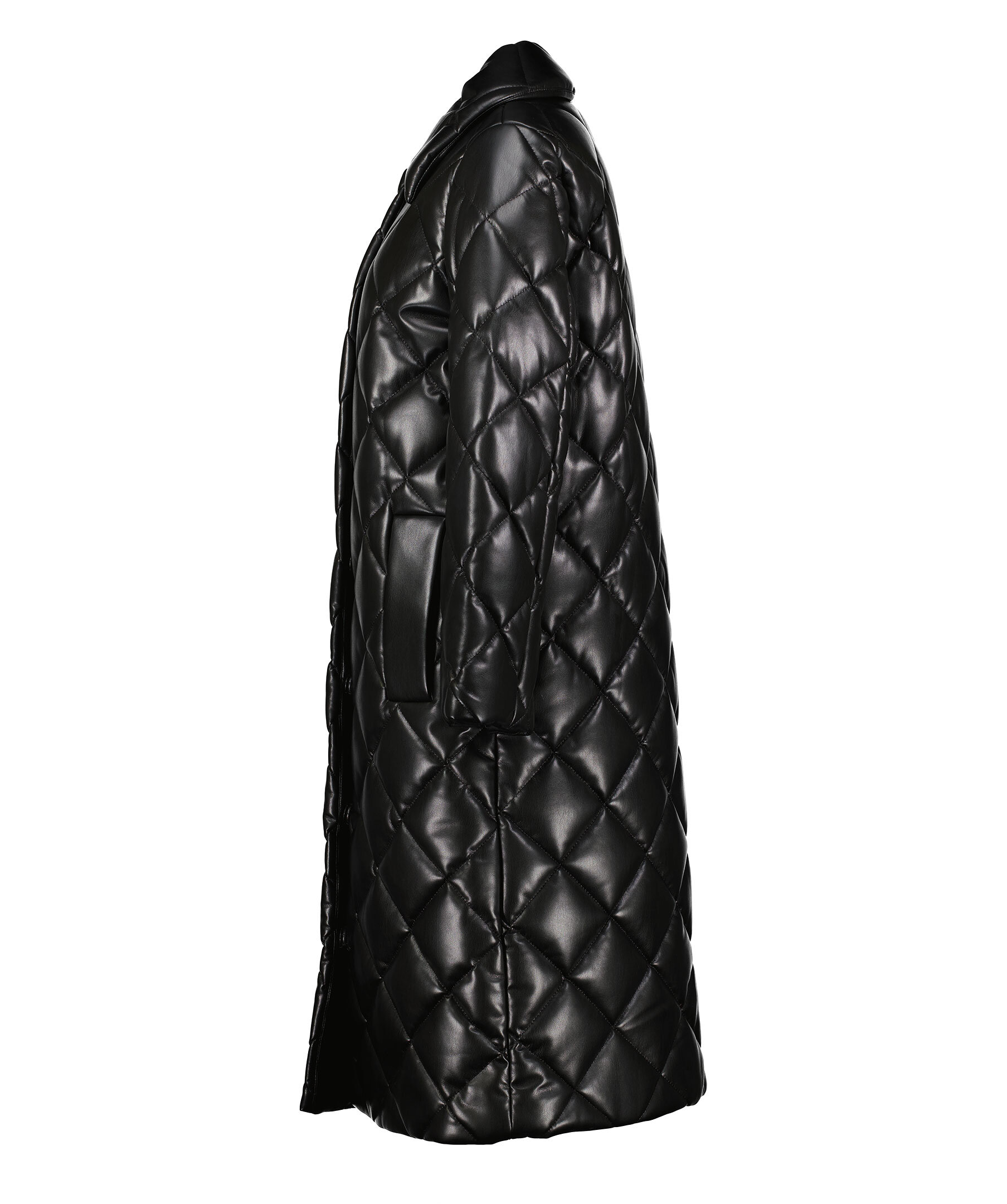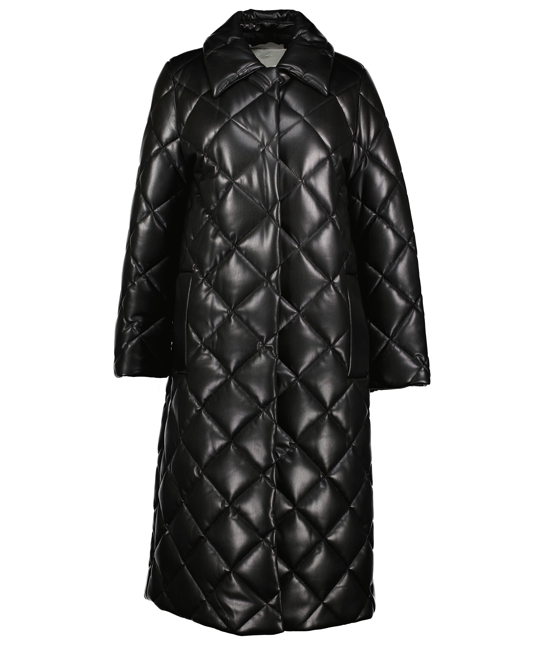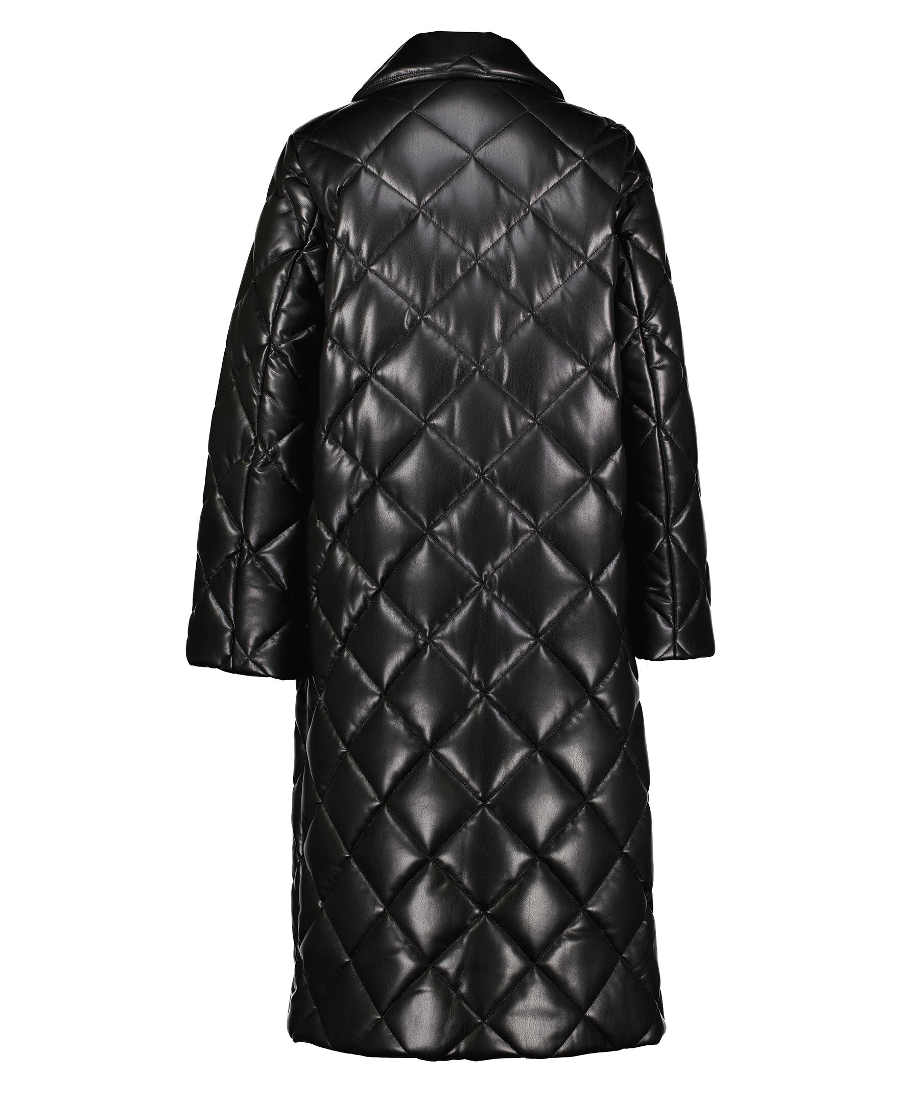 Svart quiltad kappa i läderimitation från Stand Studio. I oversized passform. Stängs framtill med dolda tryckknappar. Spetsig krage och fickor i sidan. Modellen är 178cm lång och har på sig storlek 36.