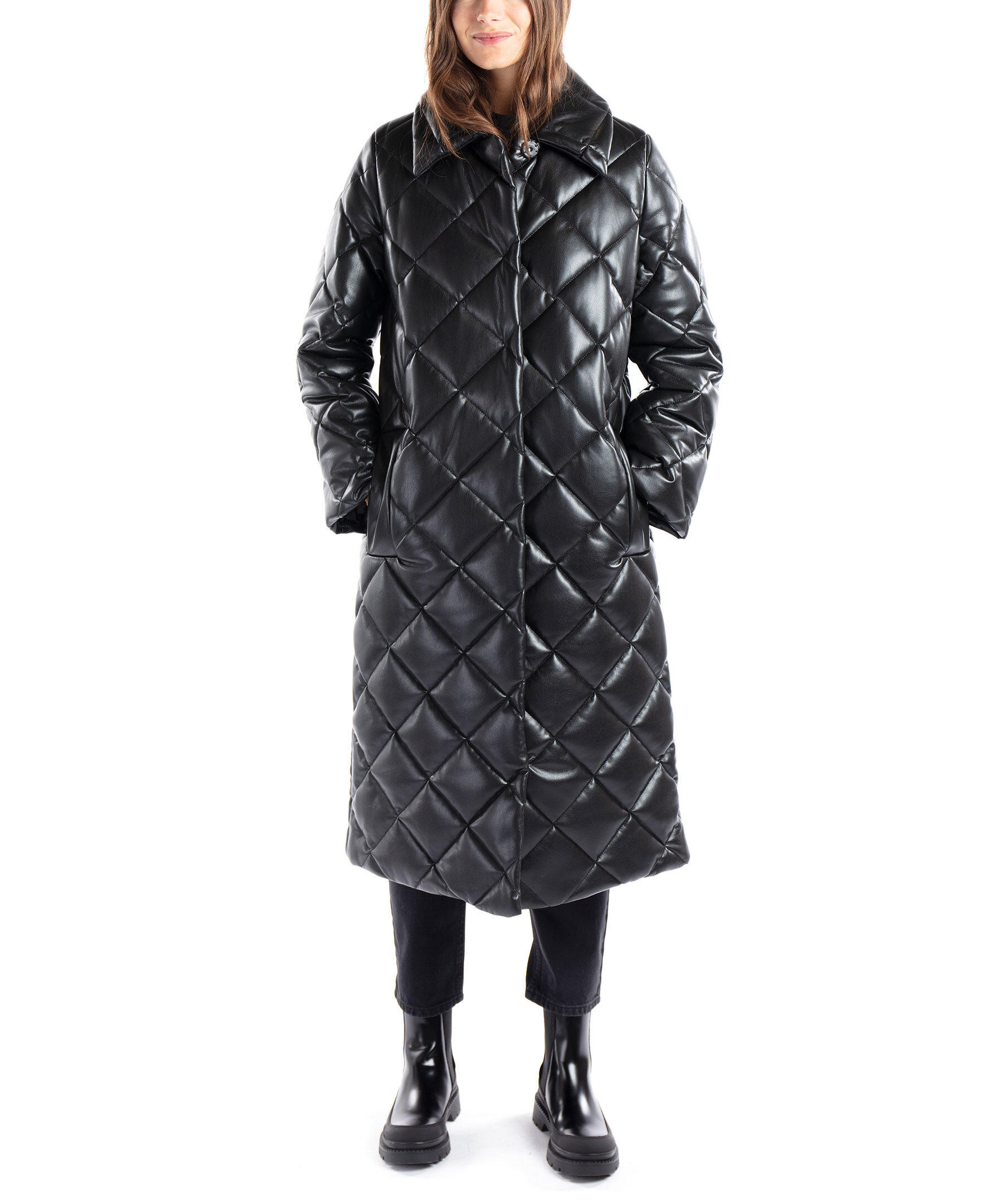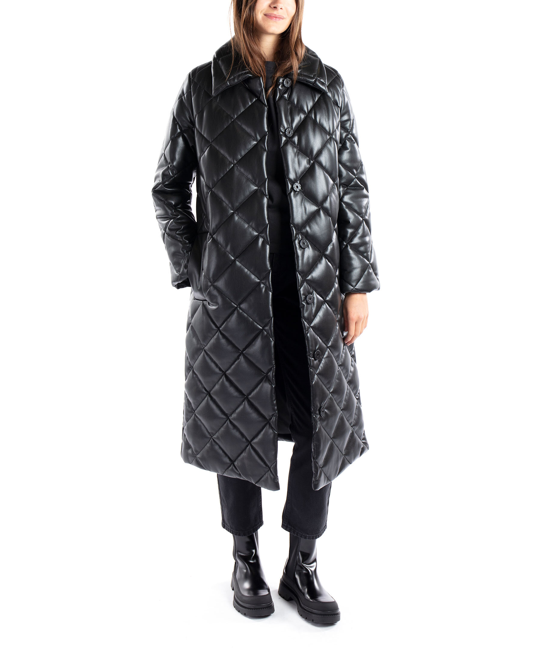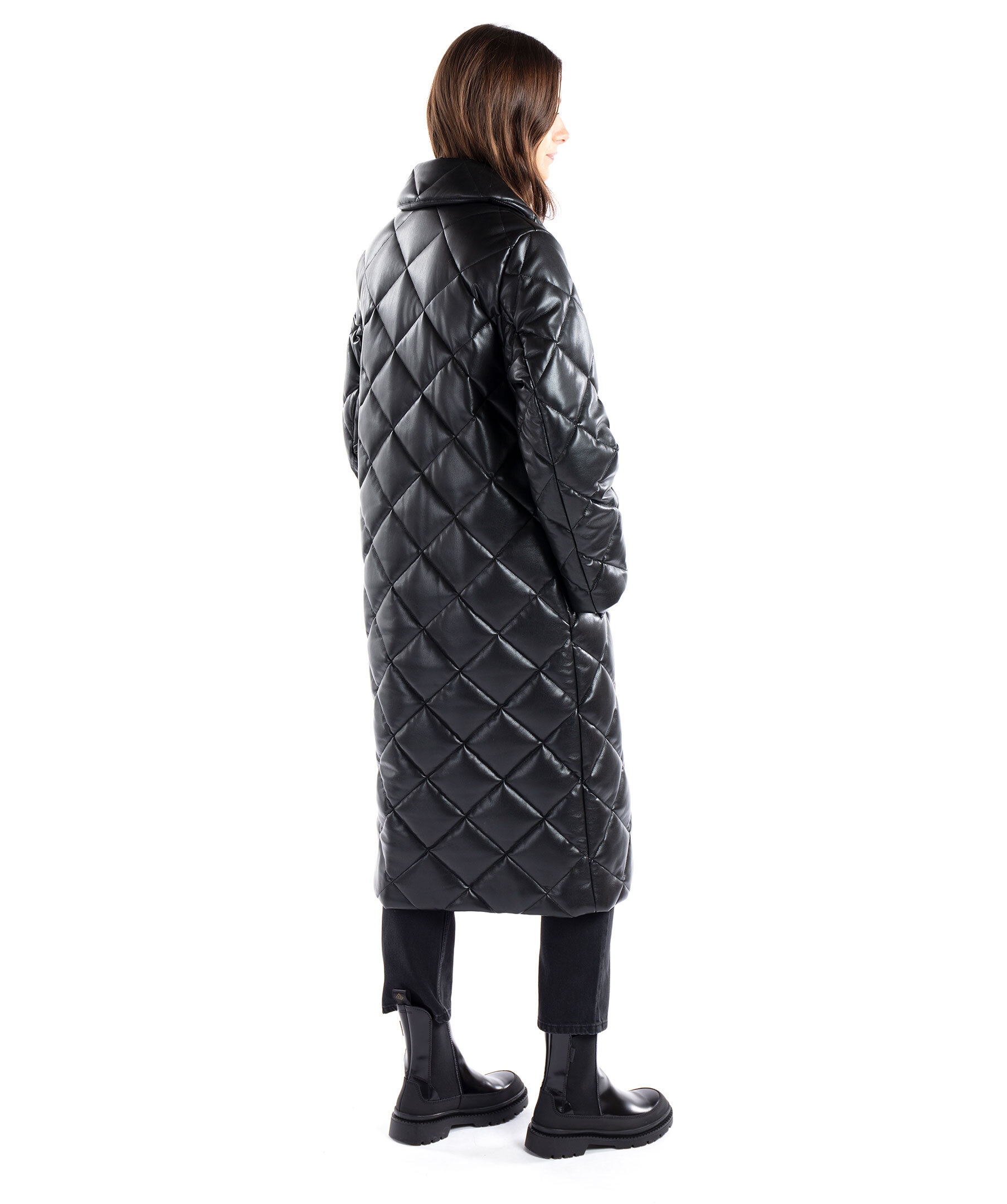 Svart quiltad kappa i läderimitation från Stand Studio. I oversized passform. Stängs framtill med dolda tryckknappar. Spetsig krage och fickor i sidan. Modellen är 178cm lång och har på sig storlek 36.