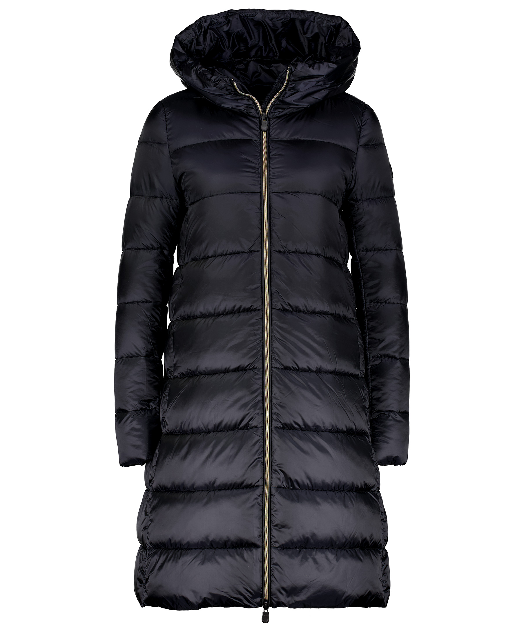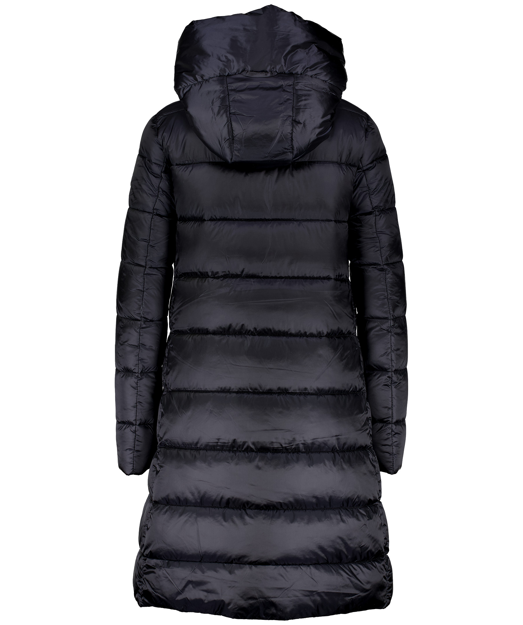 Svart, lång quiltad kappa med polyester fyllning från Save The Duck. Jackan är gjord i 100% nylon, har två framfickor med dragkedja, luva och hög krage. Stängs med tvåvägs dragkedja. Kappan har vattenavvisande, andningsaktiv och vindavvisande egenskaper. Slutar strax under knät. Passar kalla höstdagar och svala vintrar.