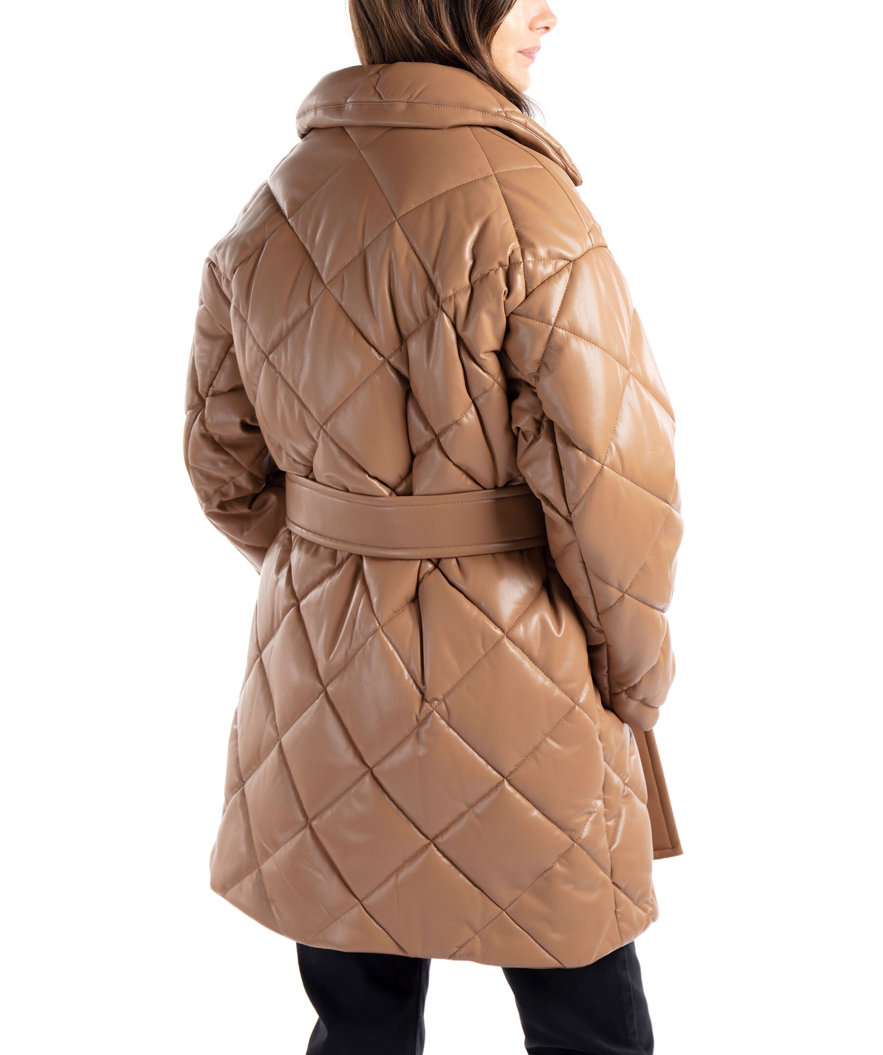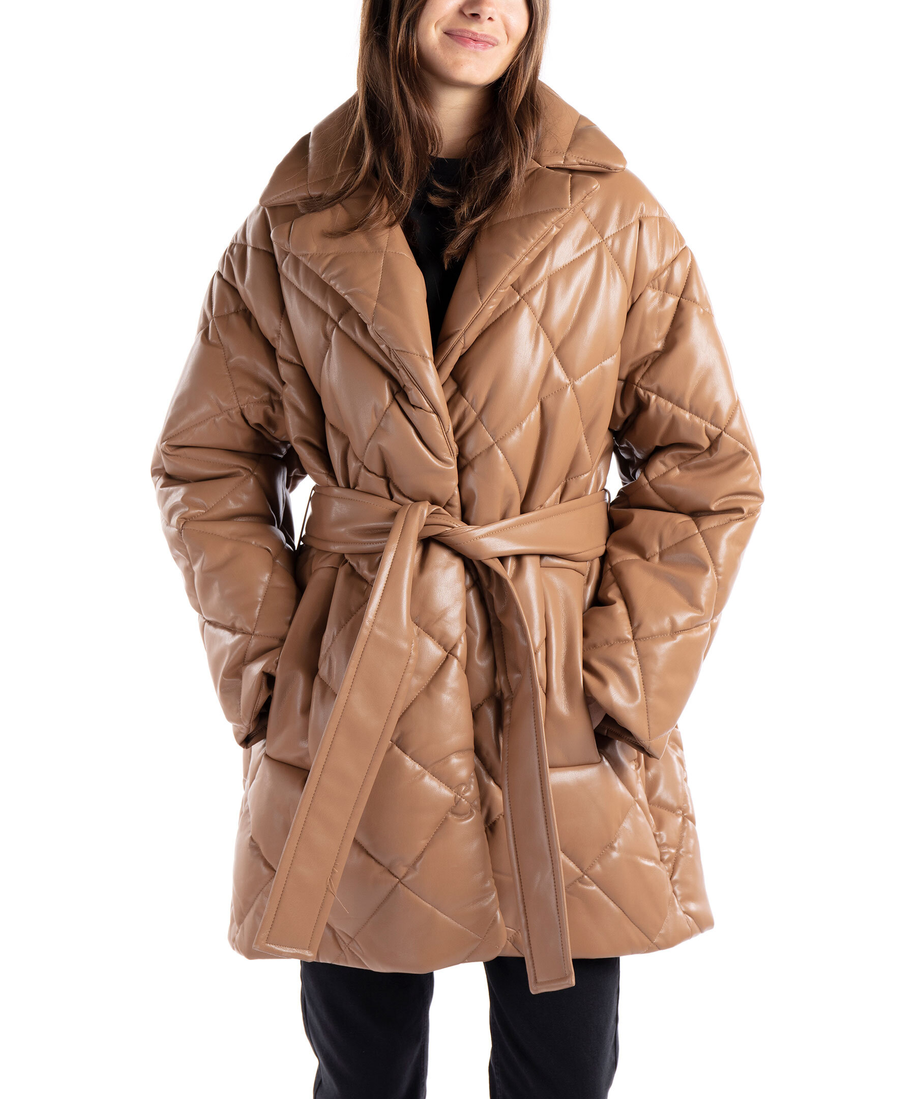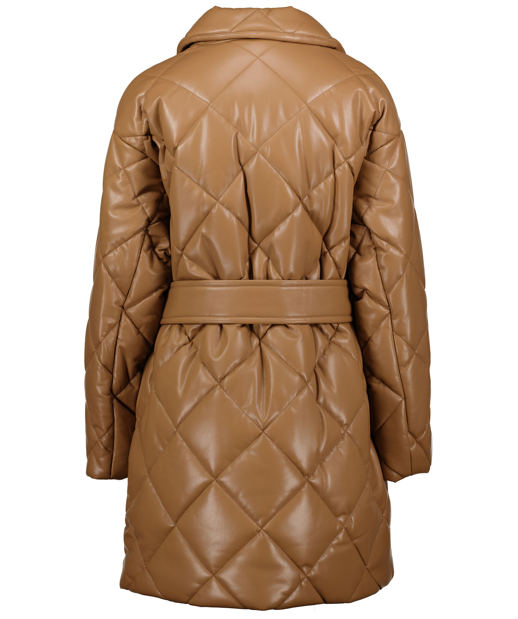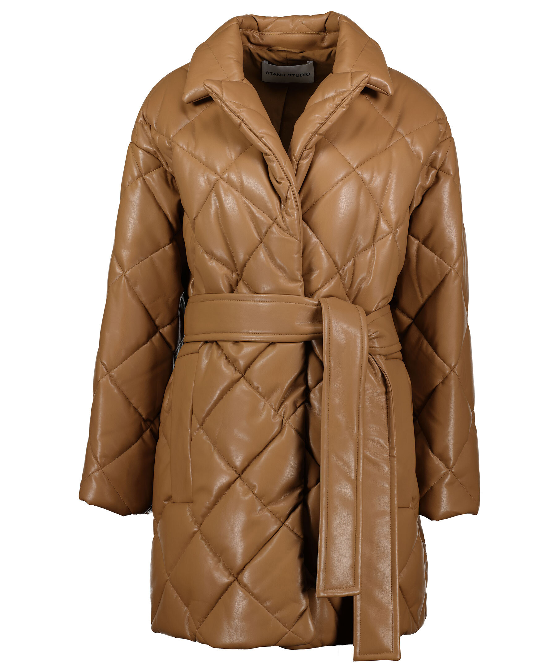 Beige quiltad jacka med oversized fit i konstläder från Stand Studio. Jackan stängs med dolda tryckknappar. Stora slag och avtagbart bälte i midjan. Två fickor framtill. Modellen är 178cm lång och har på sig storlek 36.