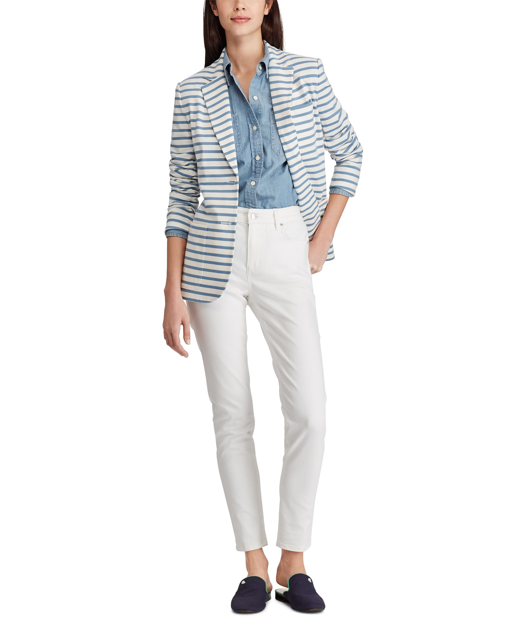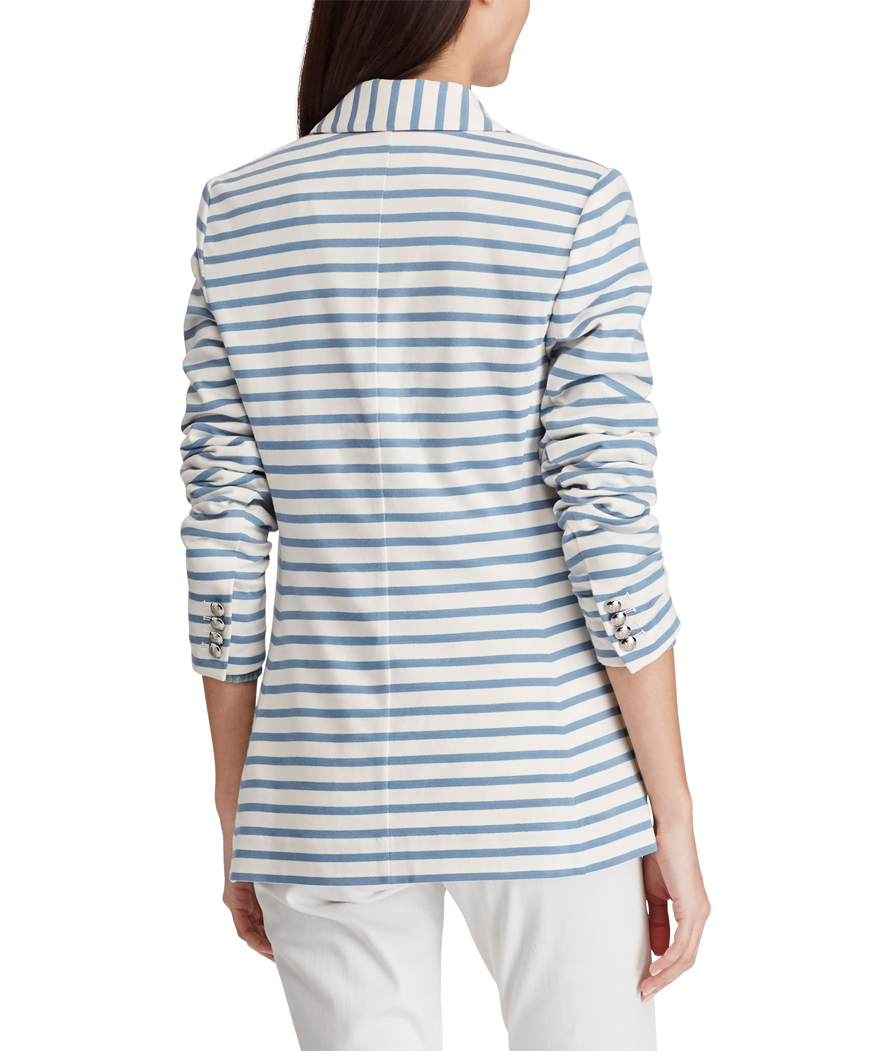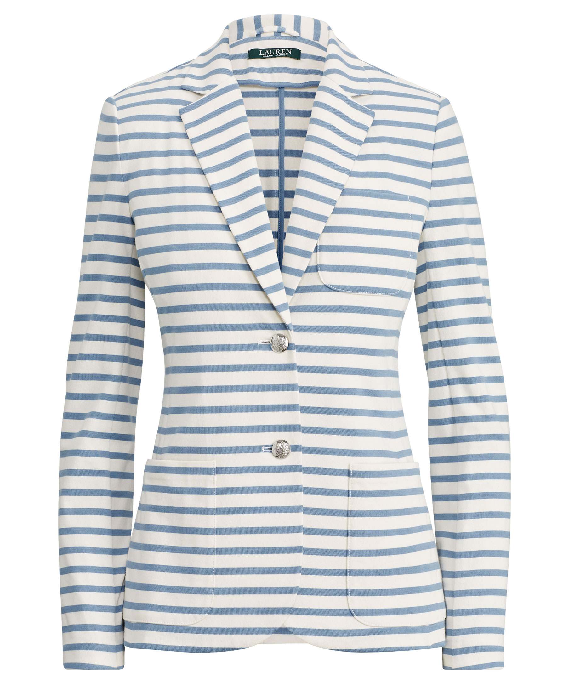 Randig blazer från Lauren Ralph Lauren. Rak passform, Långärmad med fyra silverfärgade manschetter. Kavajen stängs med två knappar. Två framfickor i midjan samt en bröstficka. Gjord i 100% Bomull