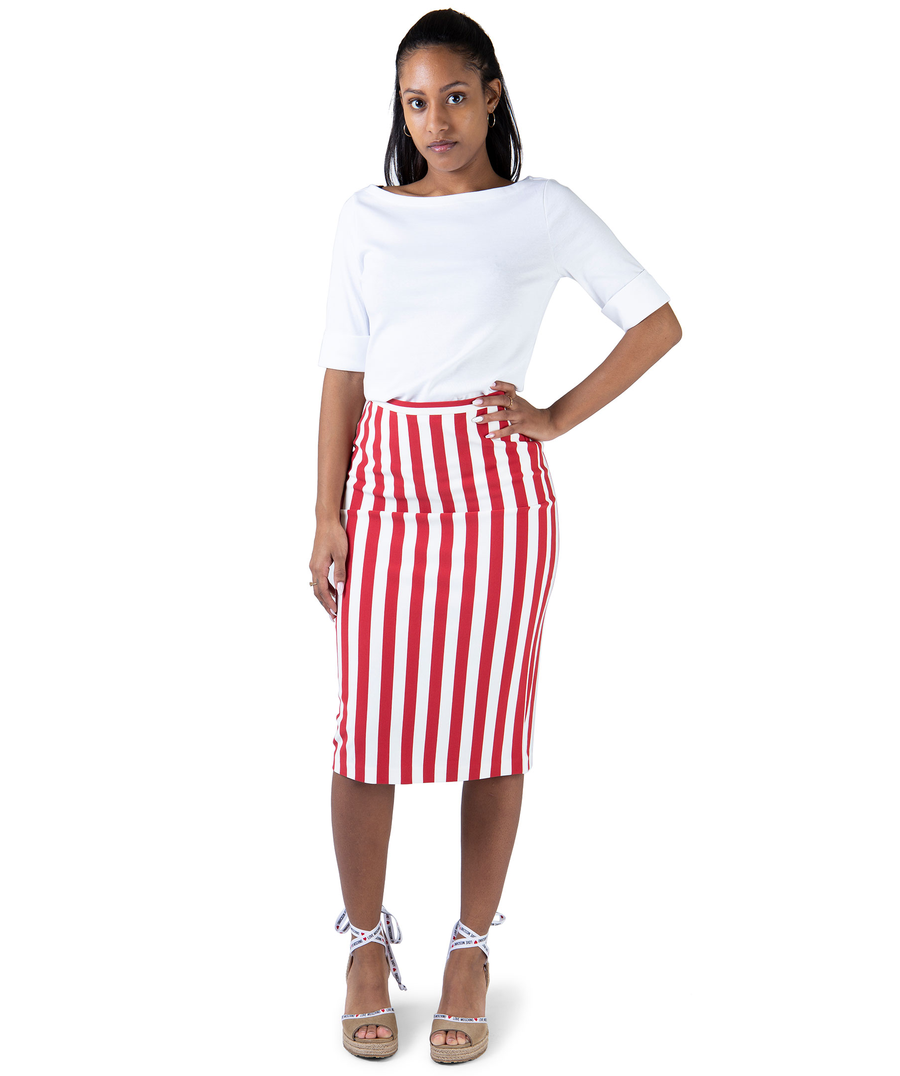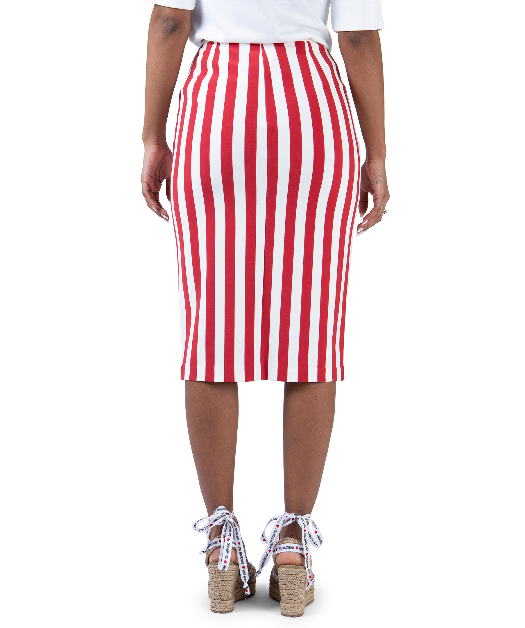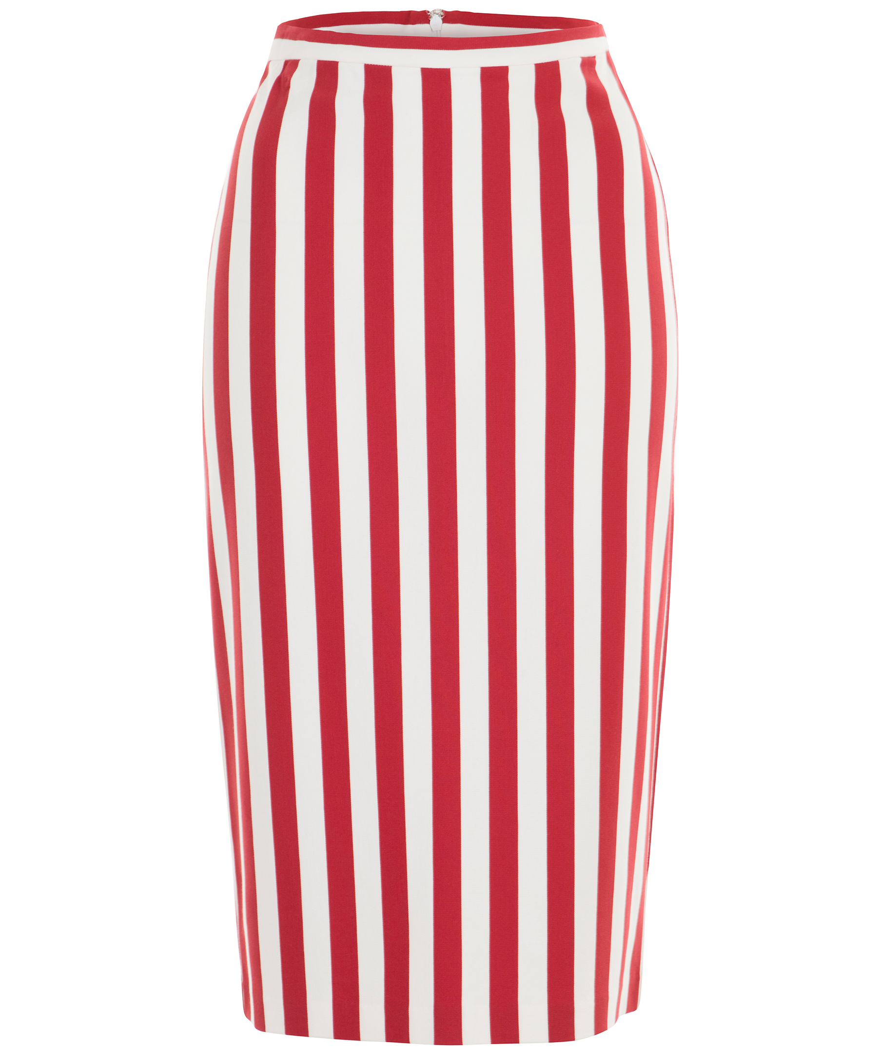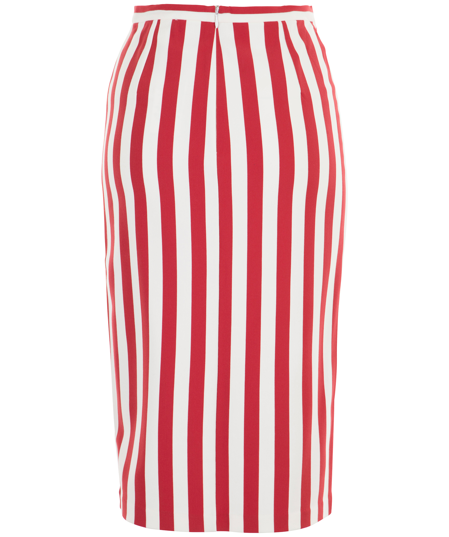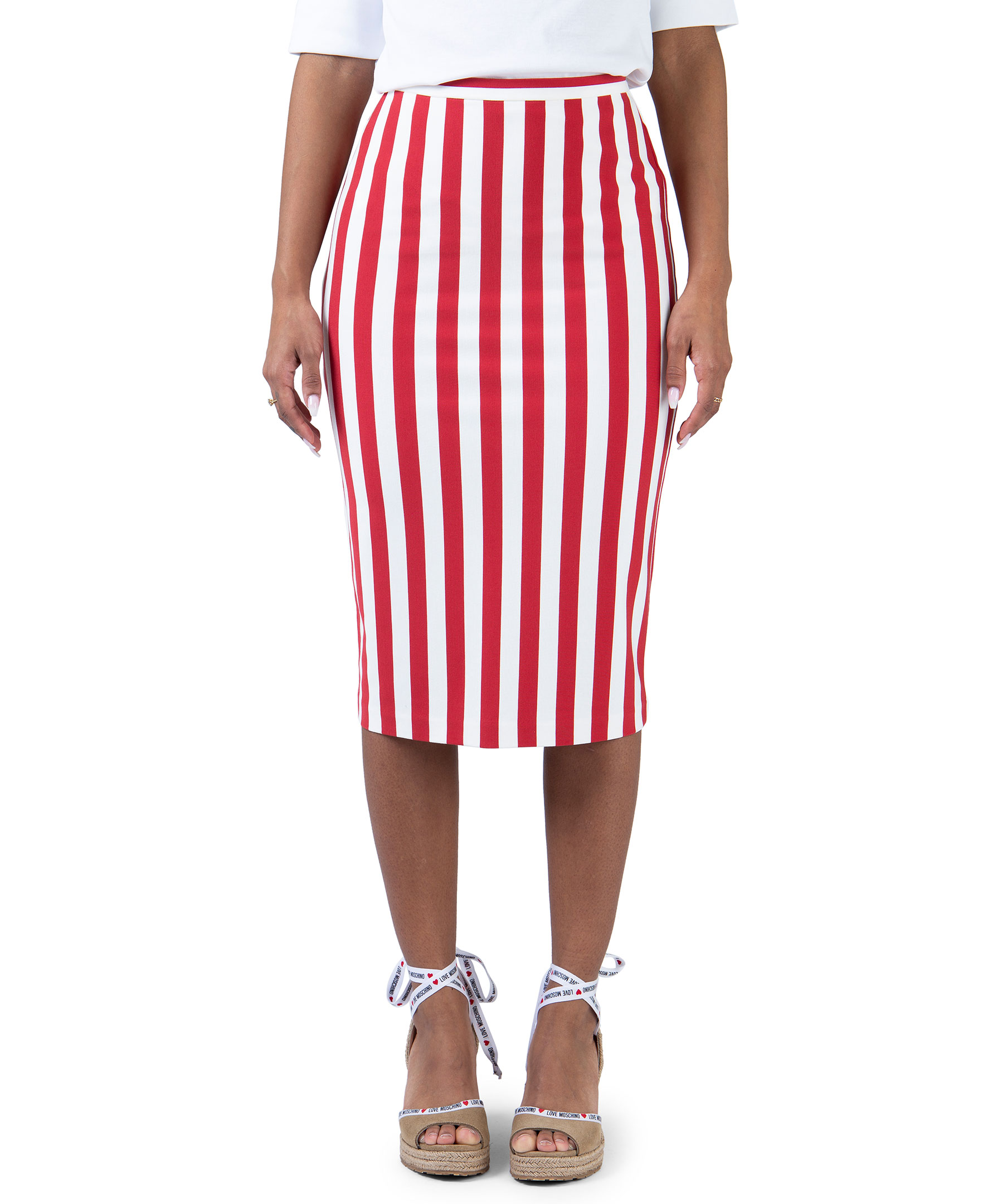Snygg pennkjol i ett randigt mönster från Max Mara Studio. Kjolen är i en midi-längd och stängs med dold dragkedja baktill. Modellen är 164 cm lång och bär storlek S.