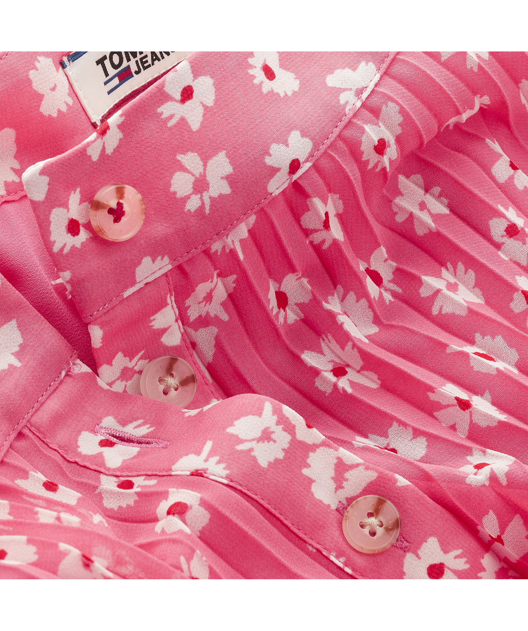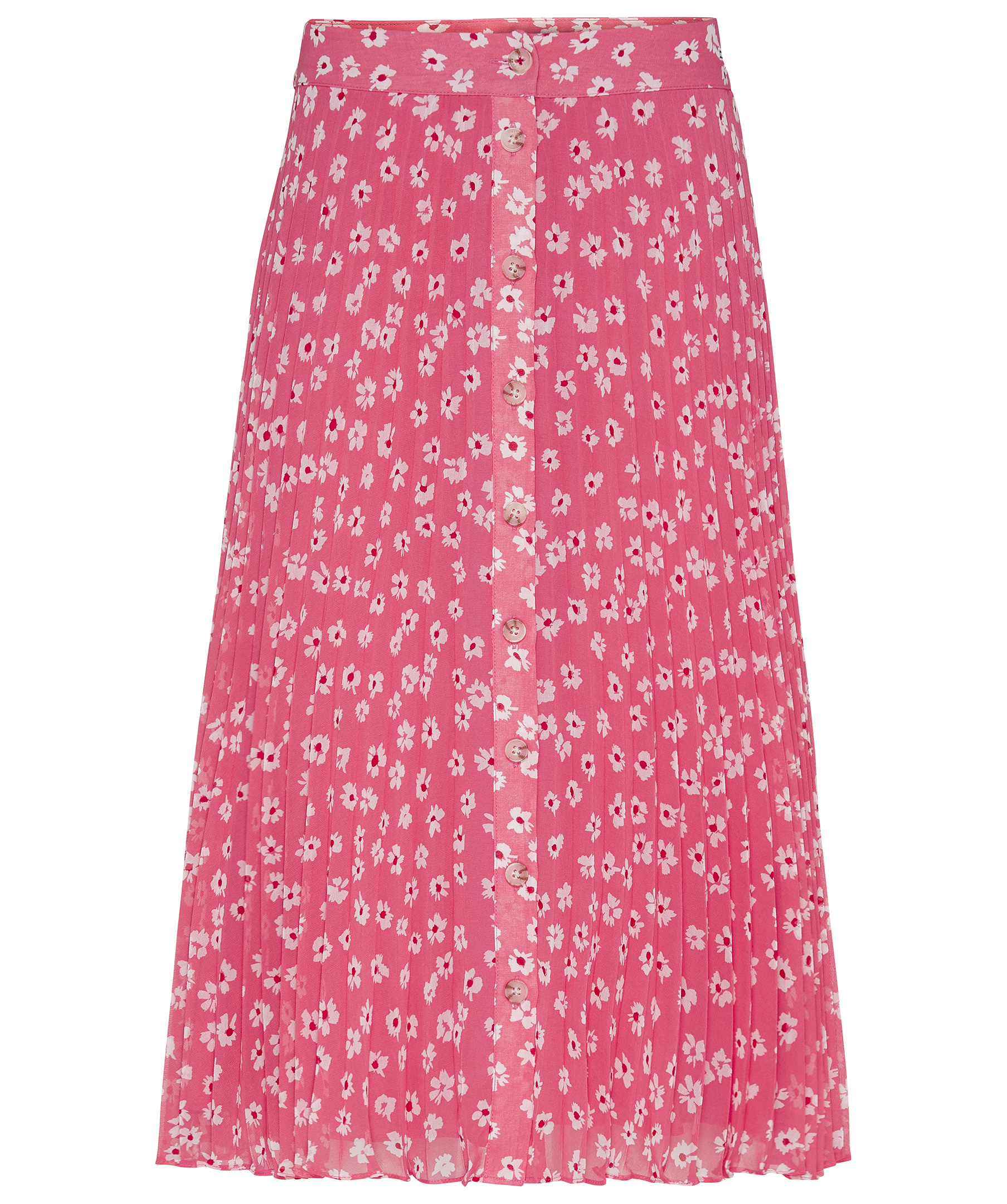 Neonrosa, blommönstrad kjol i midilängd från Tommy Hilfiger. Markerad midja, knappar hela vägen fram och har en tunn underkjol. Liten broderad logotyp på vänster sida. Tillverkad i 100% polyester.