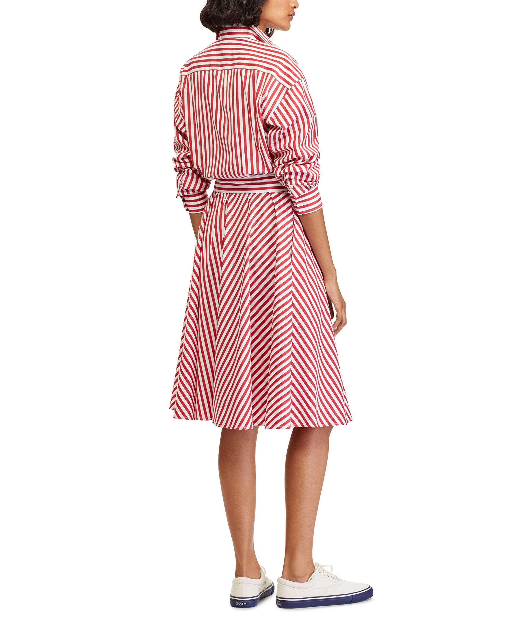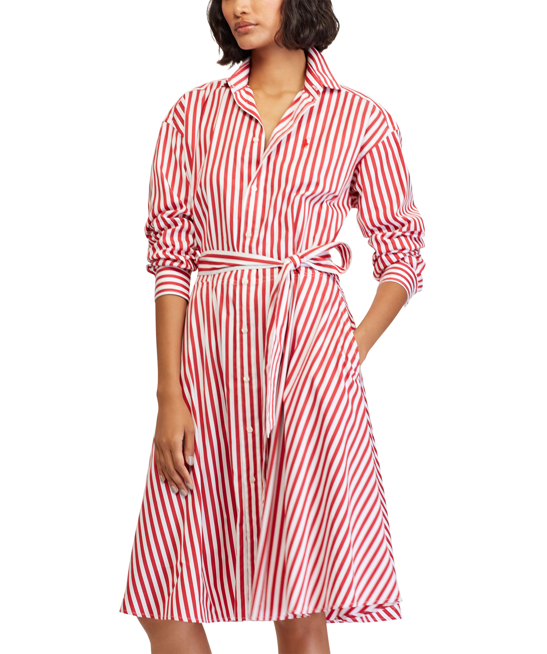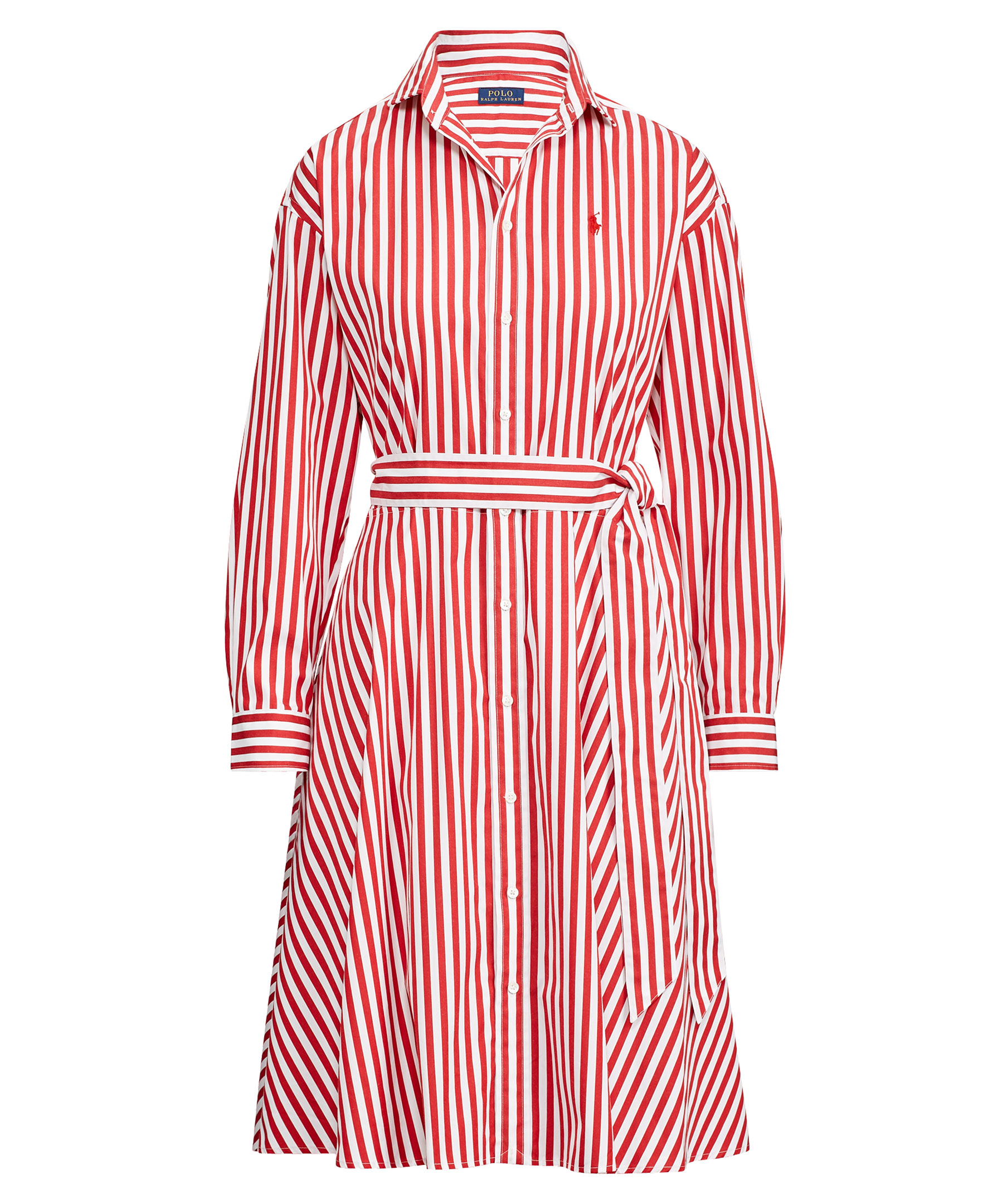 Randig klänning i vitt och rött från Polo Ralph Lauren. Klassisk krage, knyts i midjan och har praktiska fickor på klänningens sidor. Stängs med knappar längst mitten av klänningen. Tillverkad i skönt bomull.