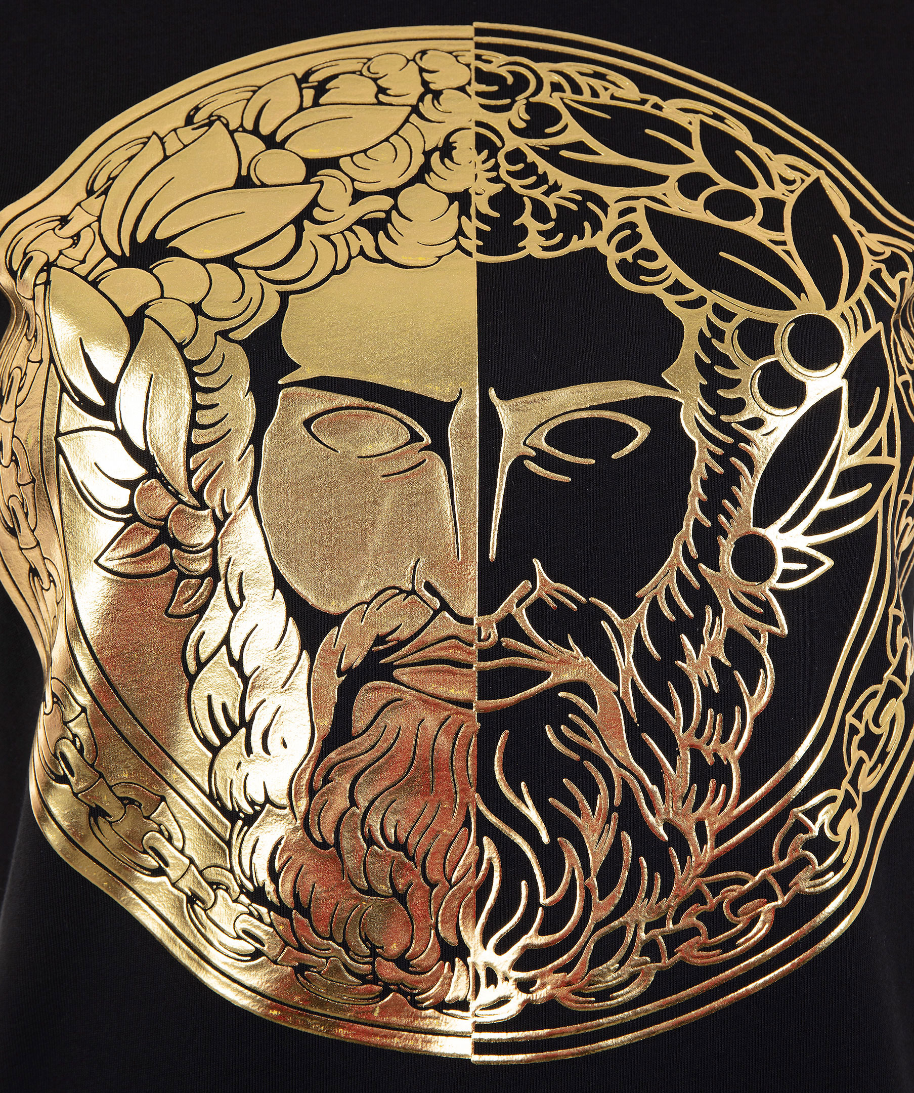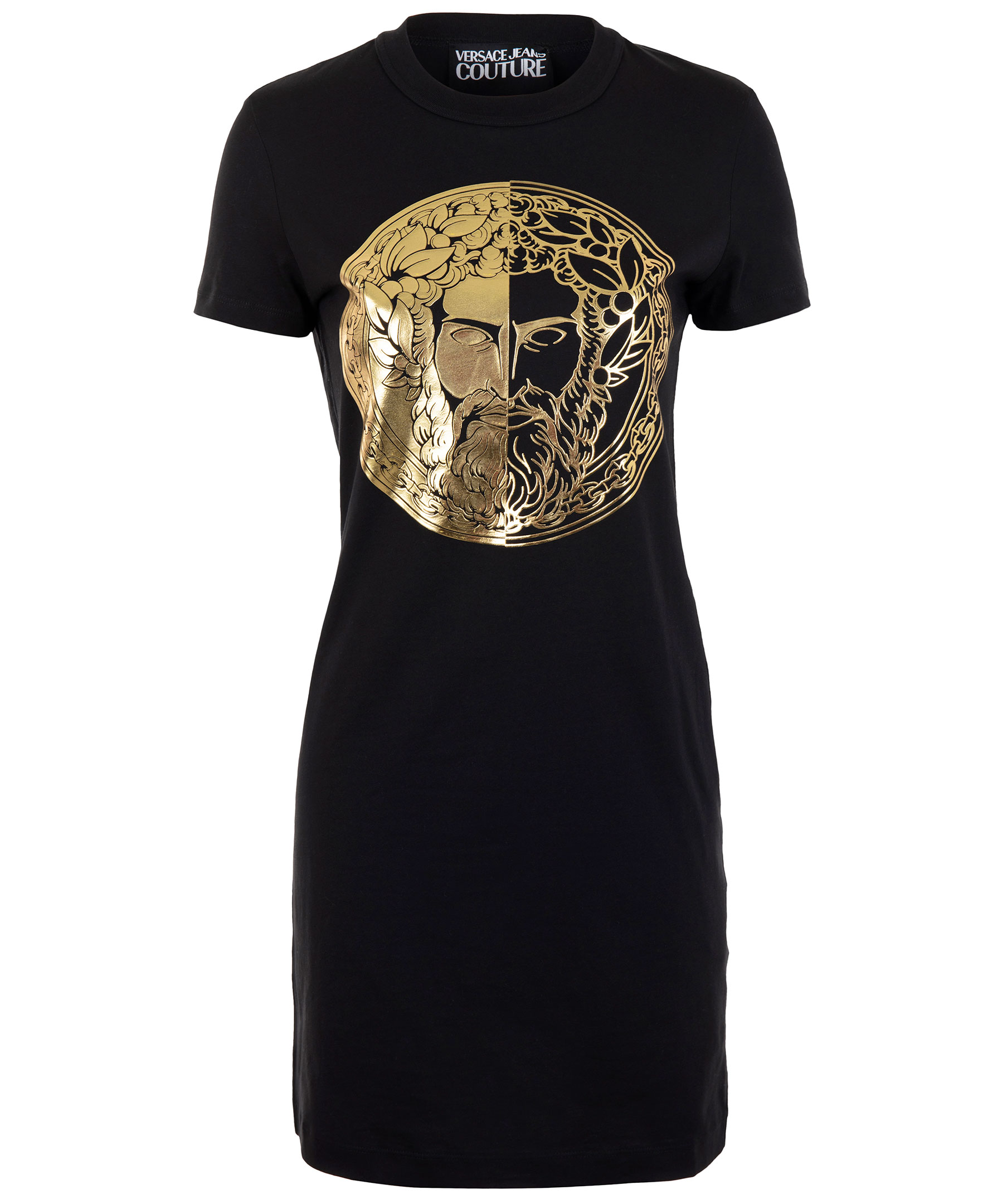 Svart t-shirtklänning från Versace Jeans Couture. Stort guldfärgat, runt tryck på bröstet. Rundad halsringning. Tillverkad i bomull. Modellen är 174 cm lång och bär storlek S.