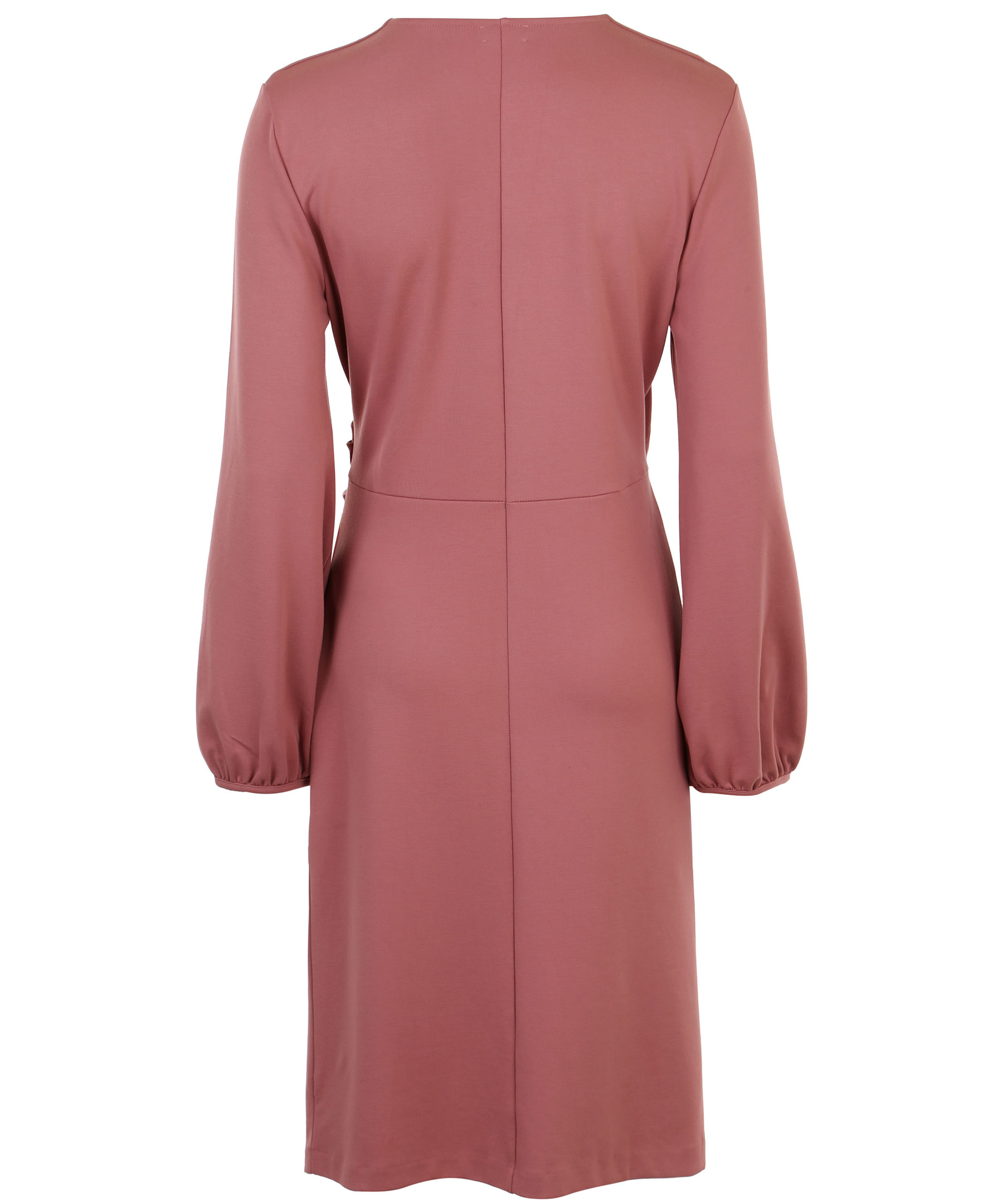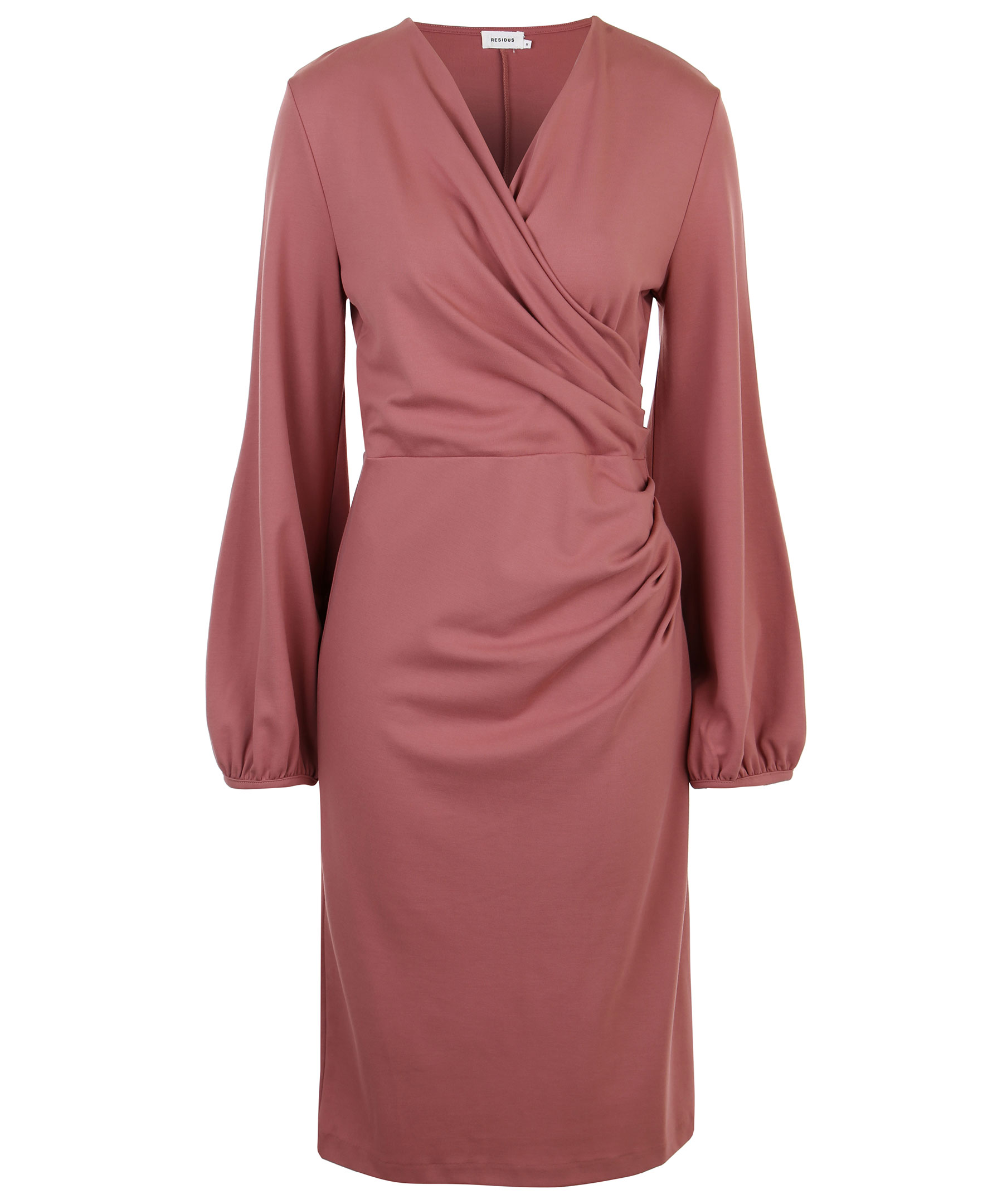 Rosa klänning från Residus i omlott-modell. Långa ärmar, v-ringning, drapering framtill.