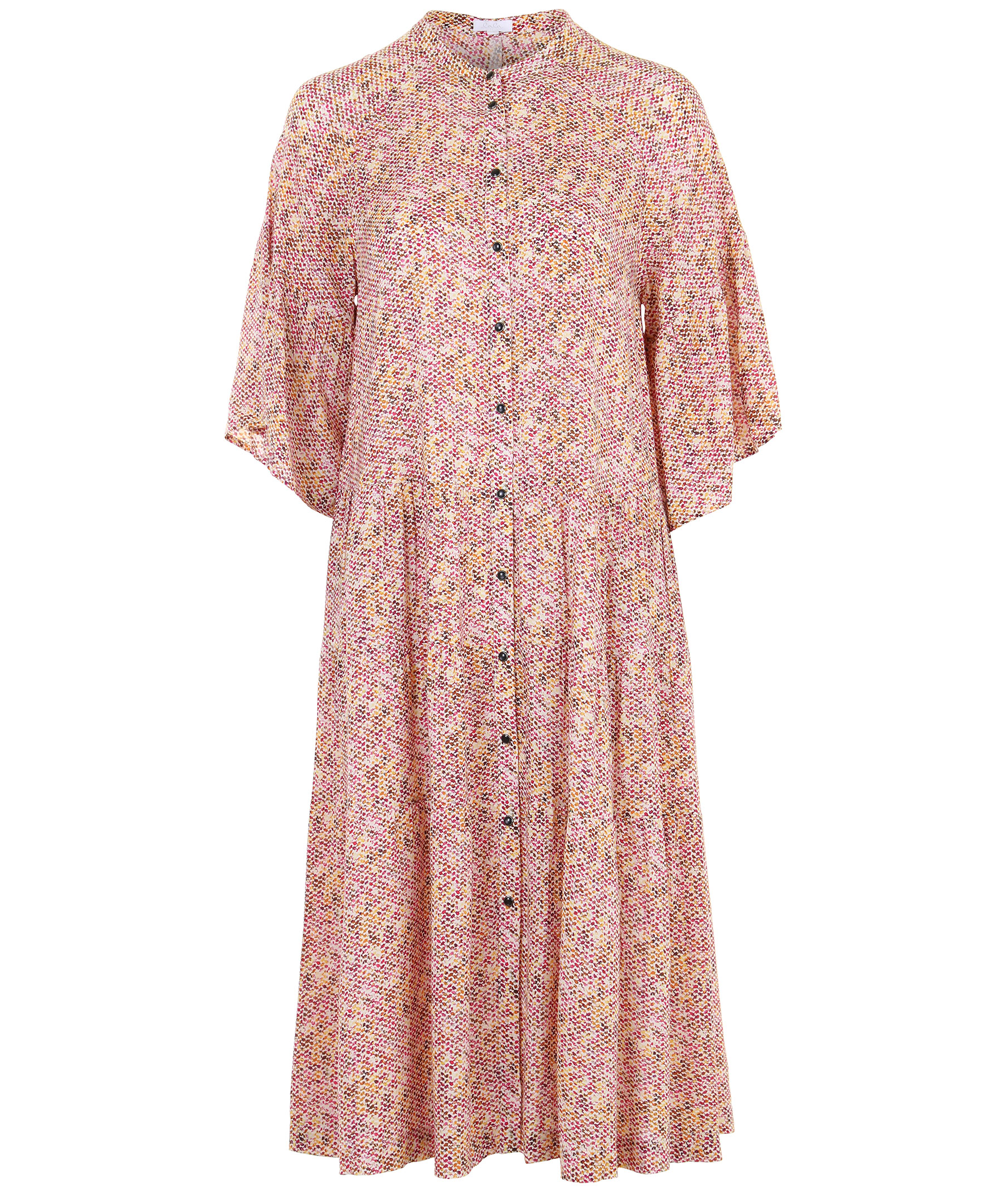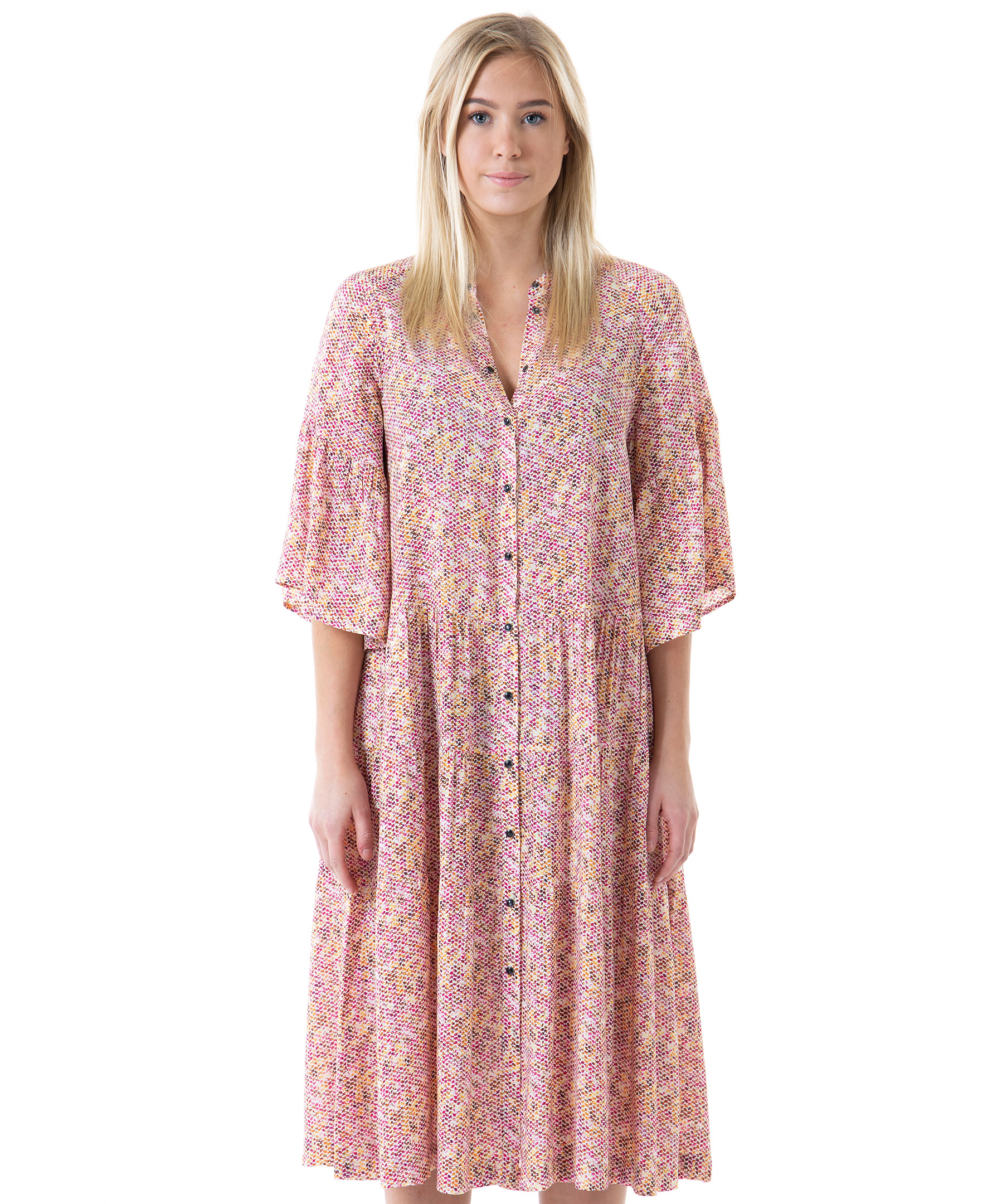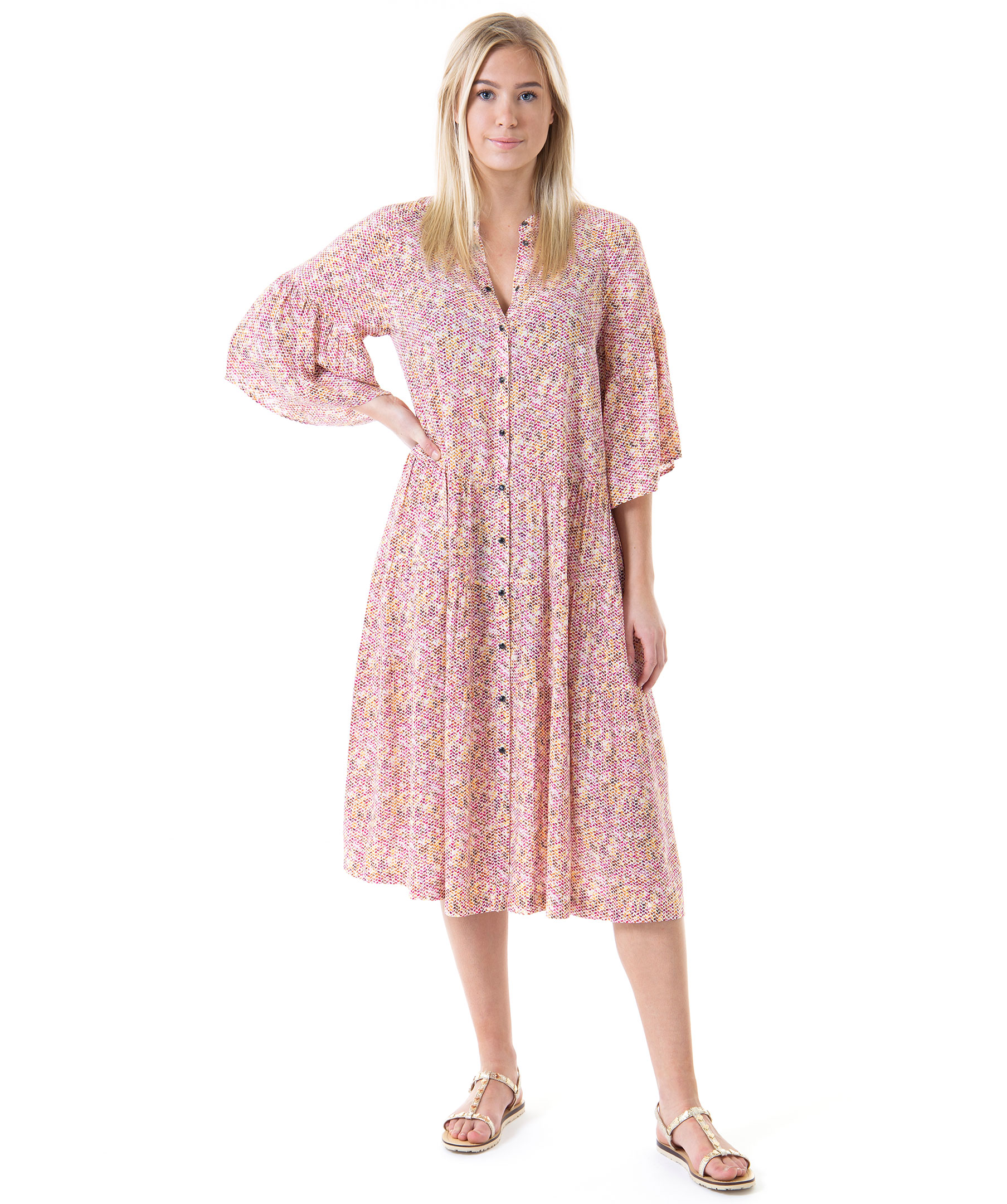 Somrig skjortklänning från La La Berlin med trekvartsärmar med en lätt volang. Avslappnad passform och stängs med tryckknappar längst plaggets mitt. För bästa passform rekommenderas de att gå ner en storlek från din vanliga. Modellen är 171 cm lång och bär storlek S.