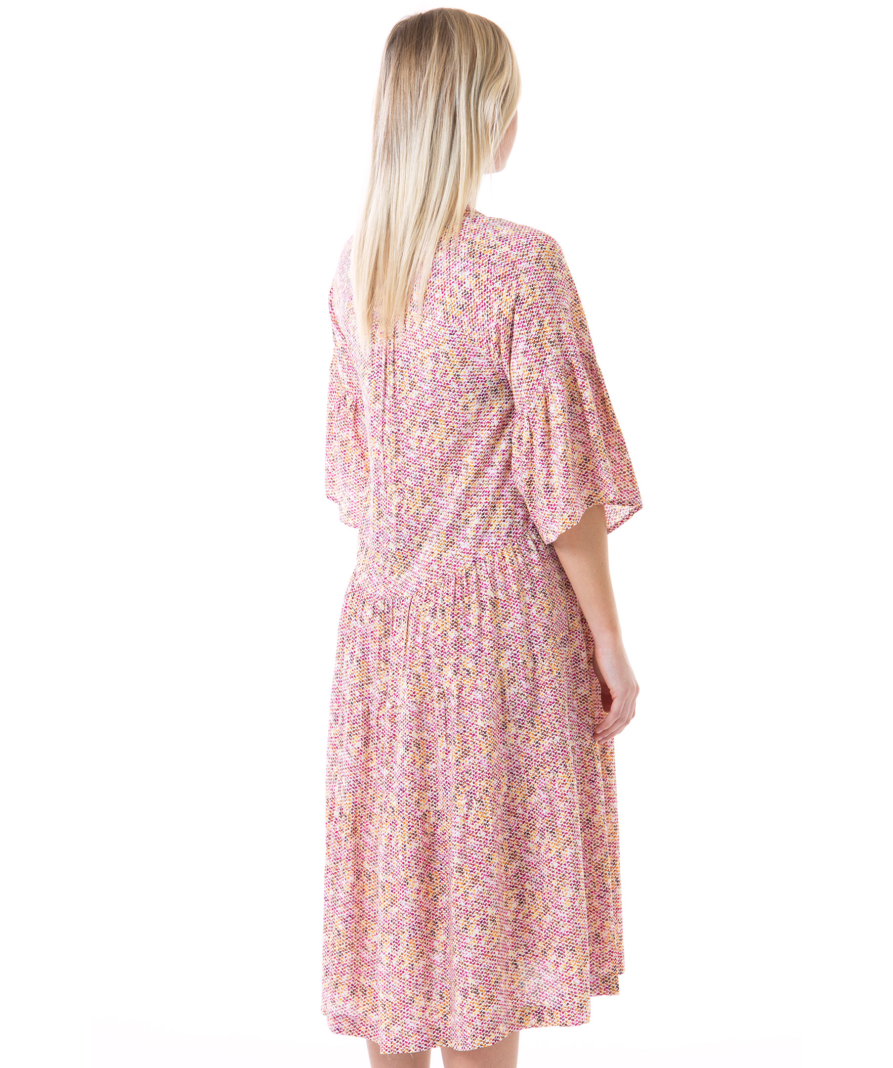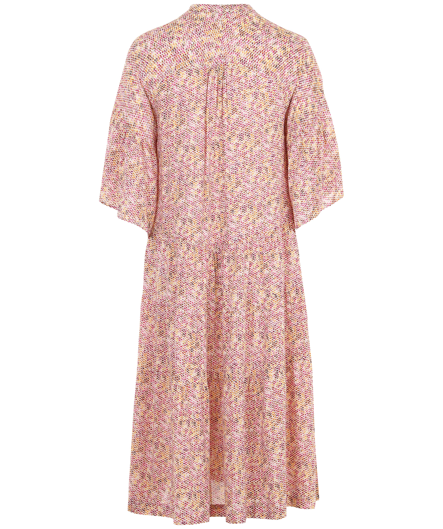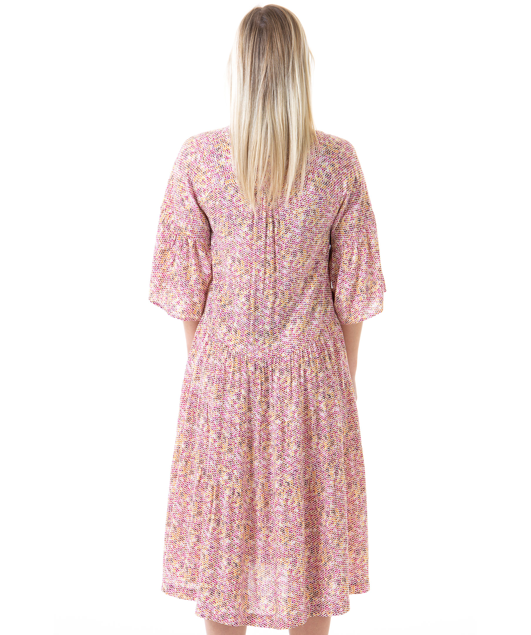 Somrig skjortklänning från La La Berlin med trekvartsärmar med en lätt volang. Avslappnad passform och stängs med tryckknappar längst plaggets mitt. För bästa passform rekommenderas de att gå ner en storlek från din vanliga. Modellen är 171 cm lång och bär storlek S.