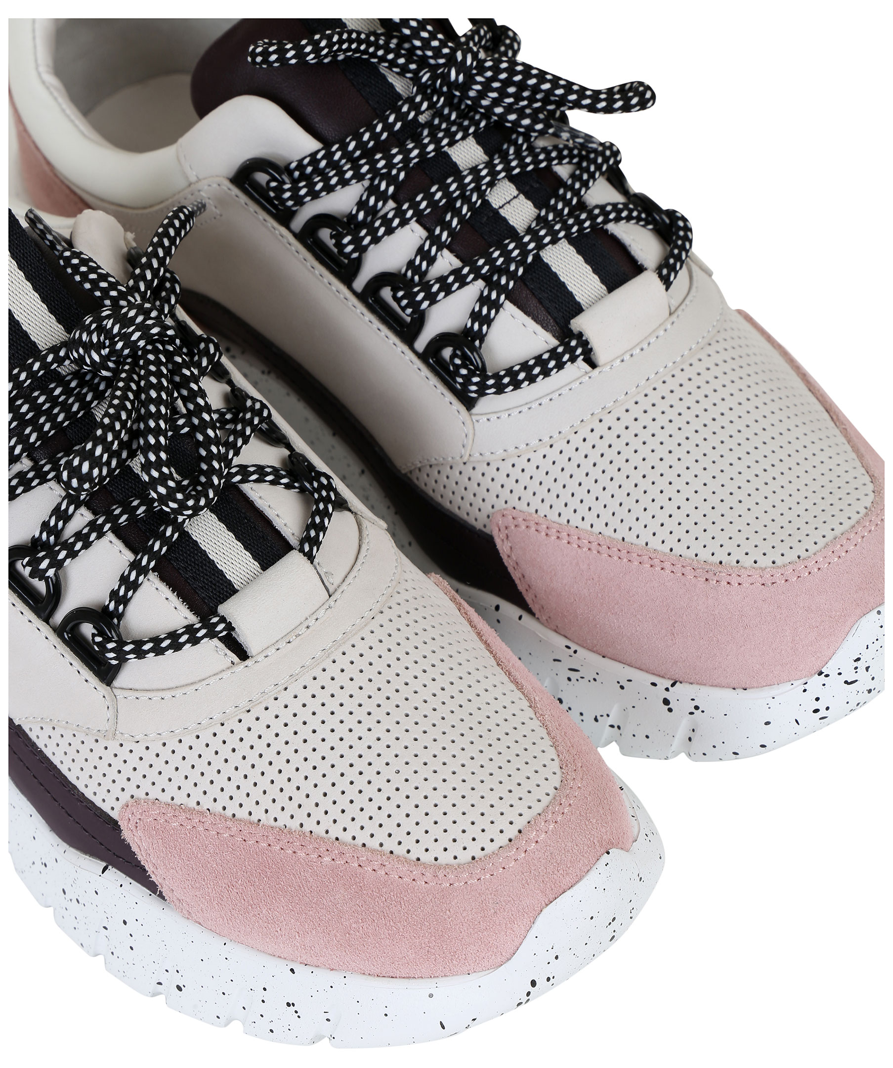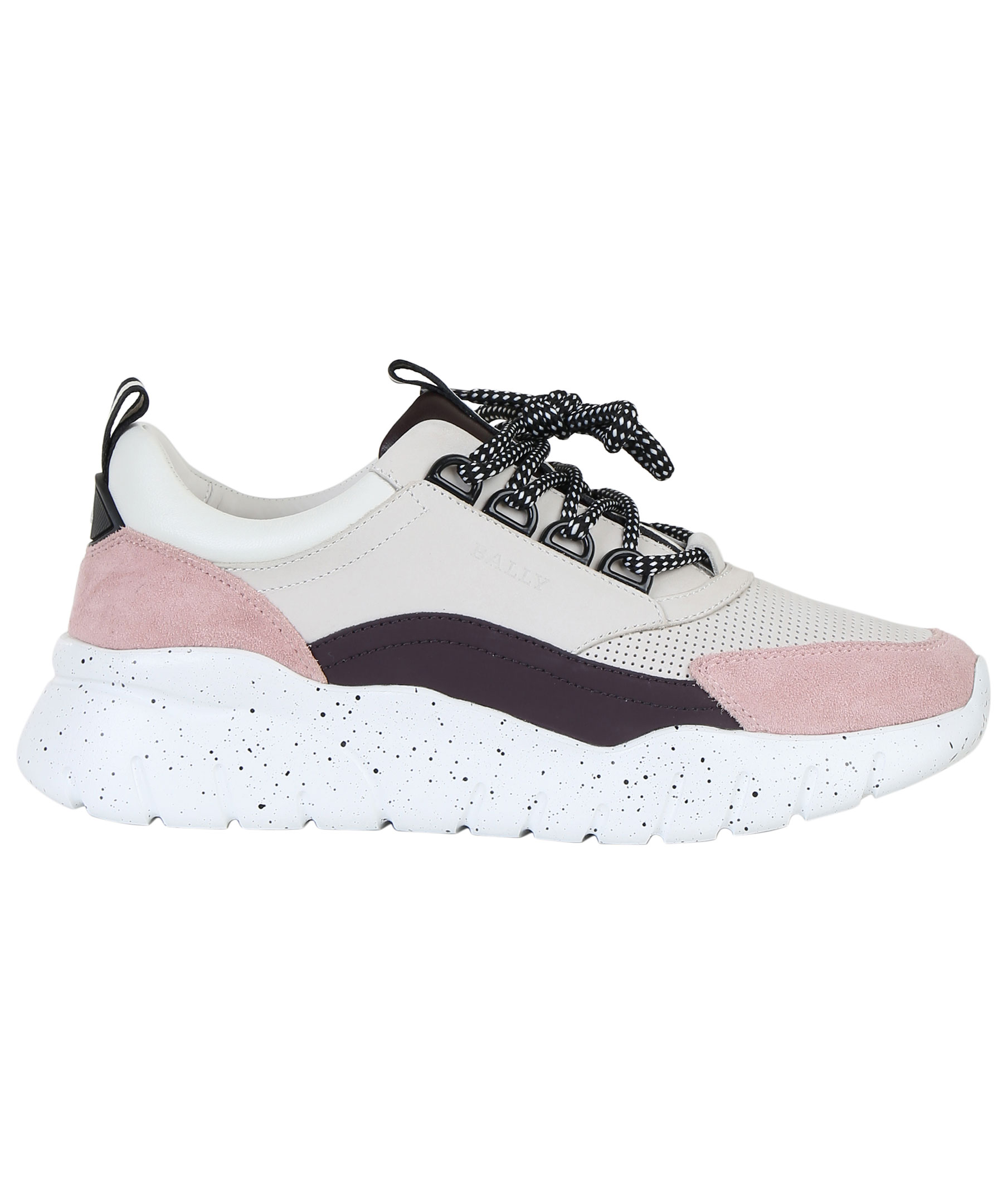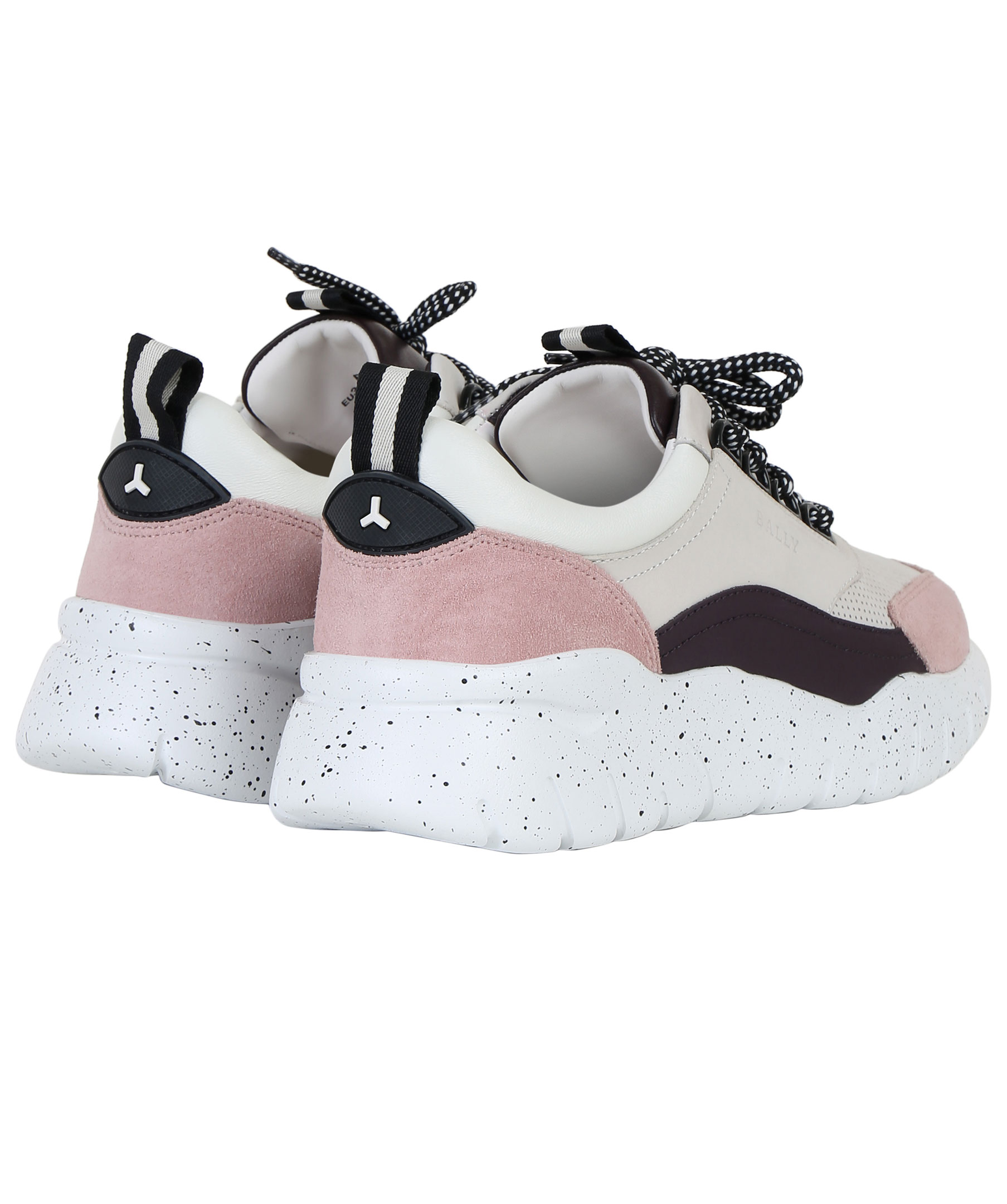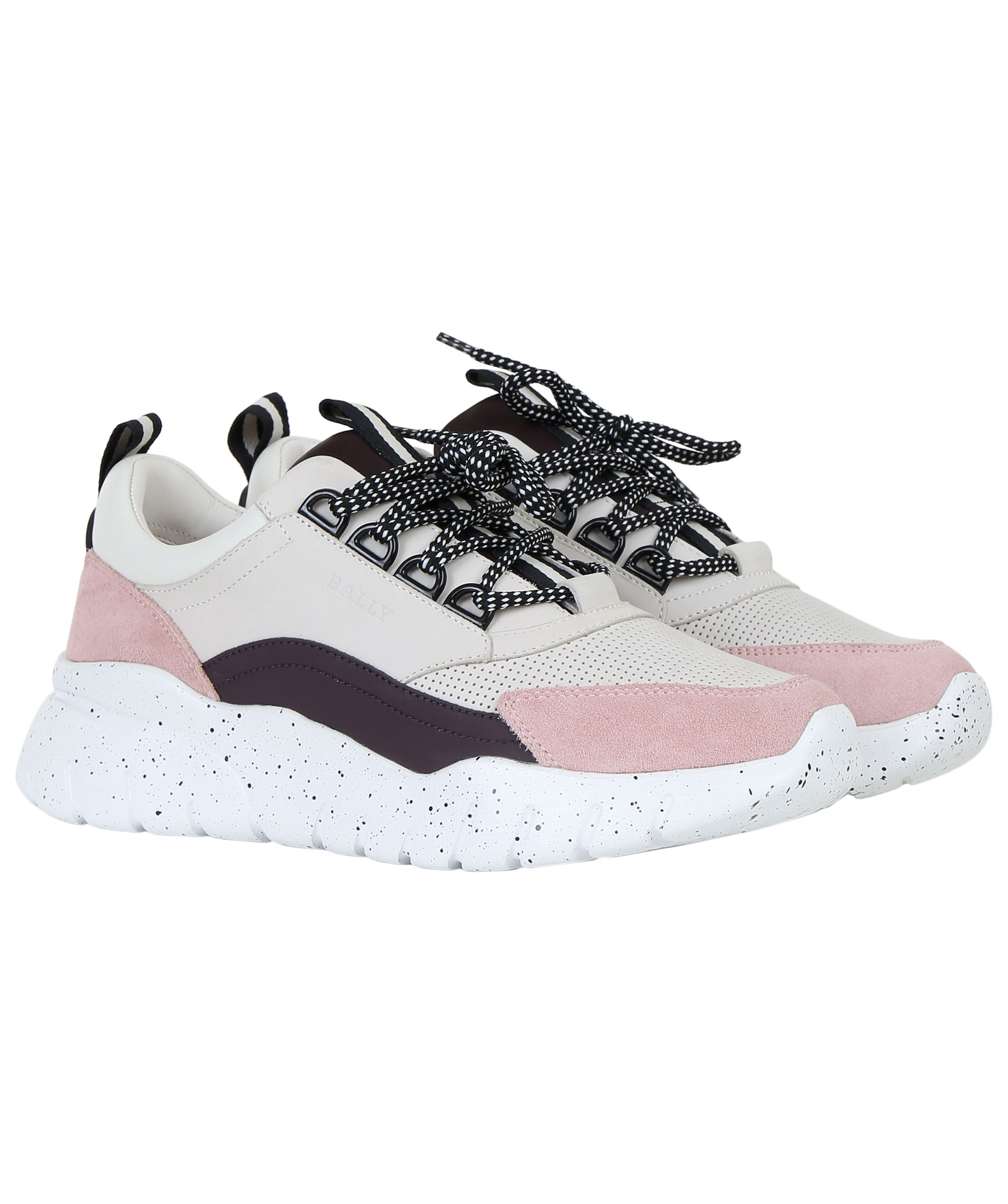 Flerfärgade sneakers från Bally i skinn. Skorna är dekorerade med rosa och beigea mockadetaljer, mörklila skinndetaljer och en sula med småfläckigt granitmönster. Svartvitt snörning.