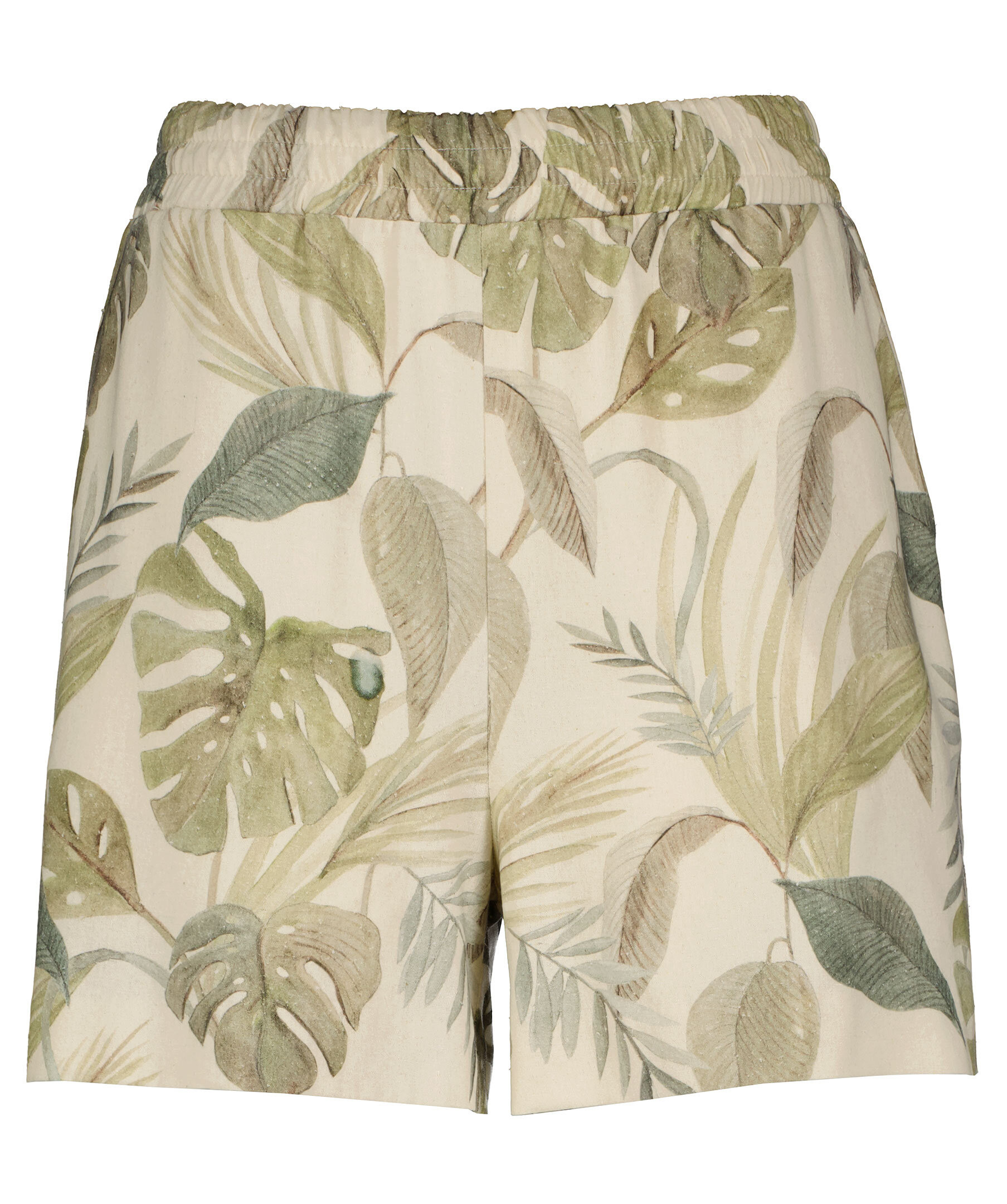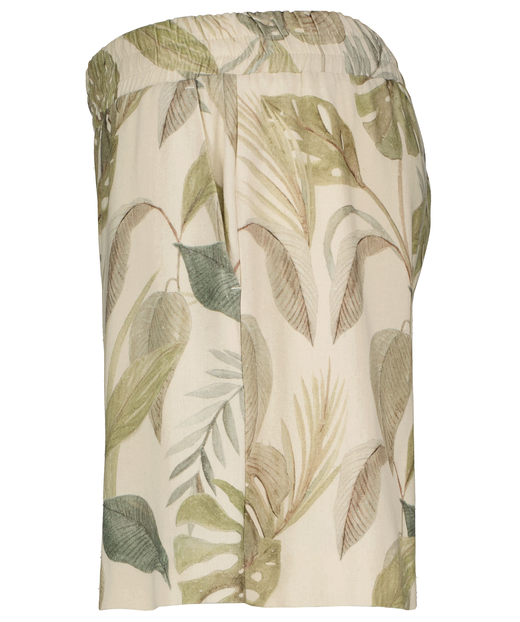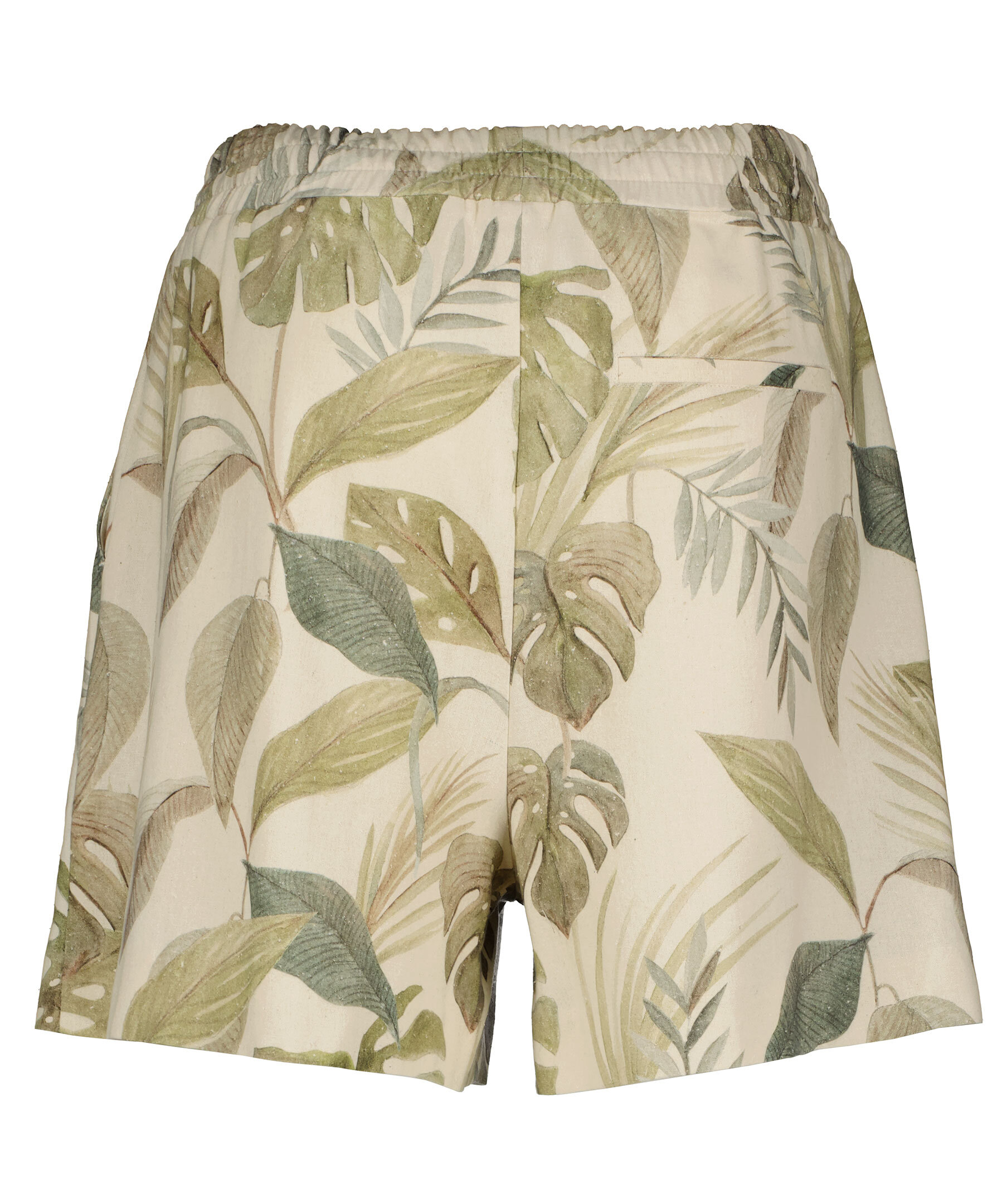 Mönstrade, avslappnade shorts i överbliven silke från Residus. Rynkad mudd i midjan, öppna fickor i sidorna och en rak bakficka på höger sida. Ljusbeige bas och gröna blad i olika varianter.