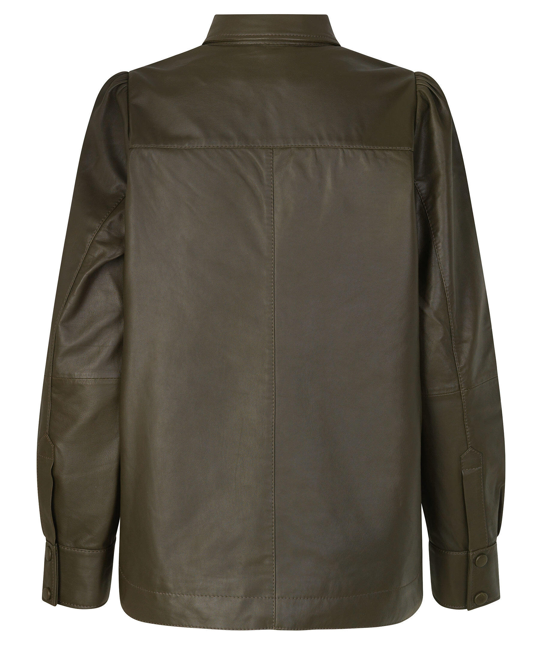 Grön skjorta i lammskinn från Second Female med puffärm och manschetter. Stängs med läderklädda tryckknappar. Baksidan är rundad nedtill.