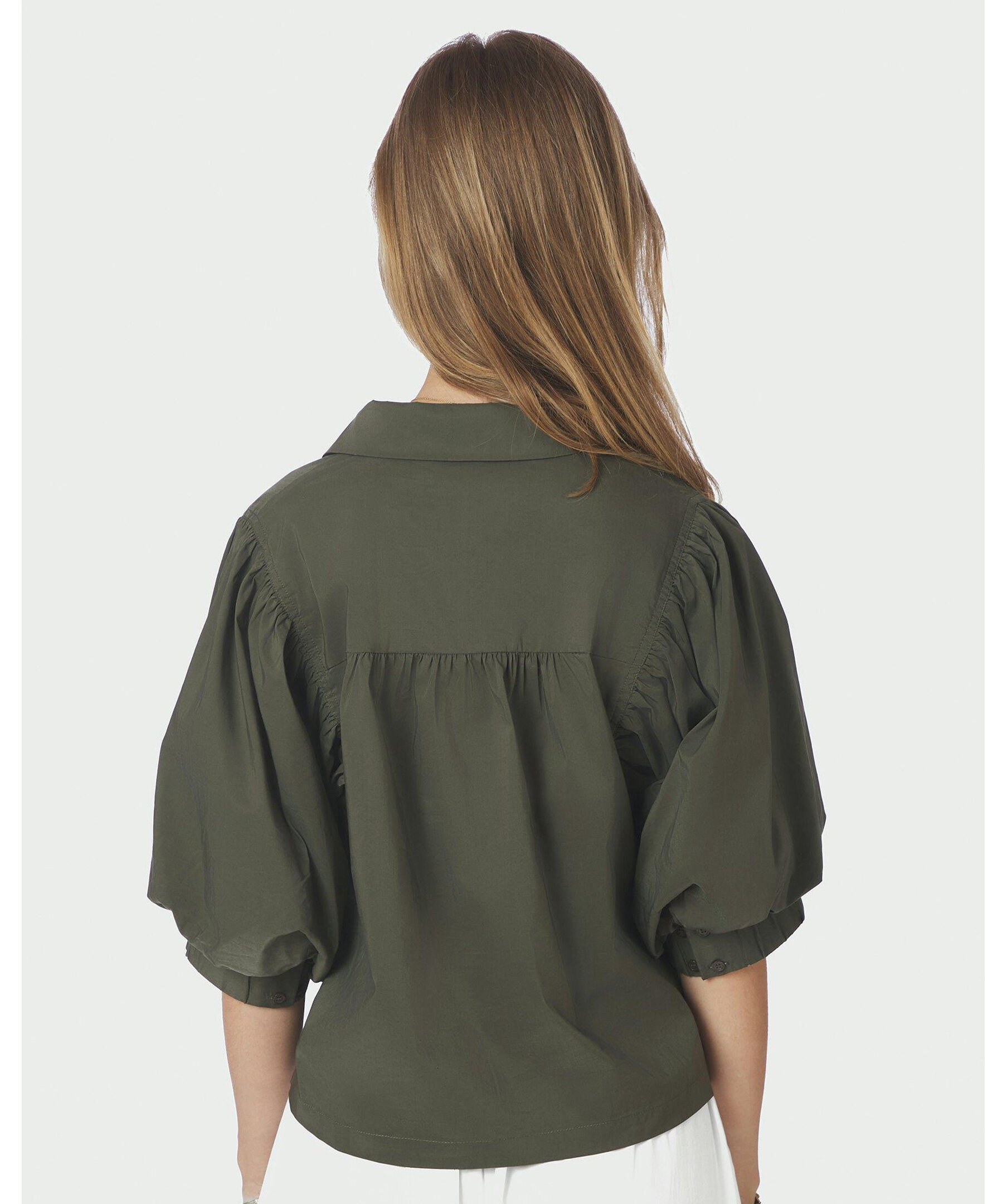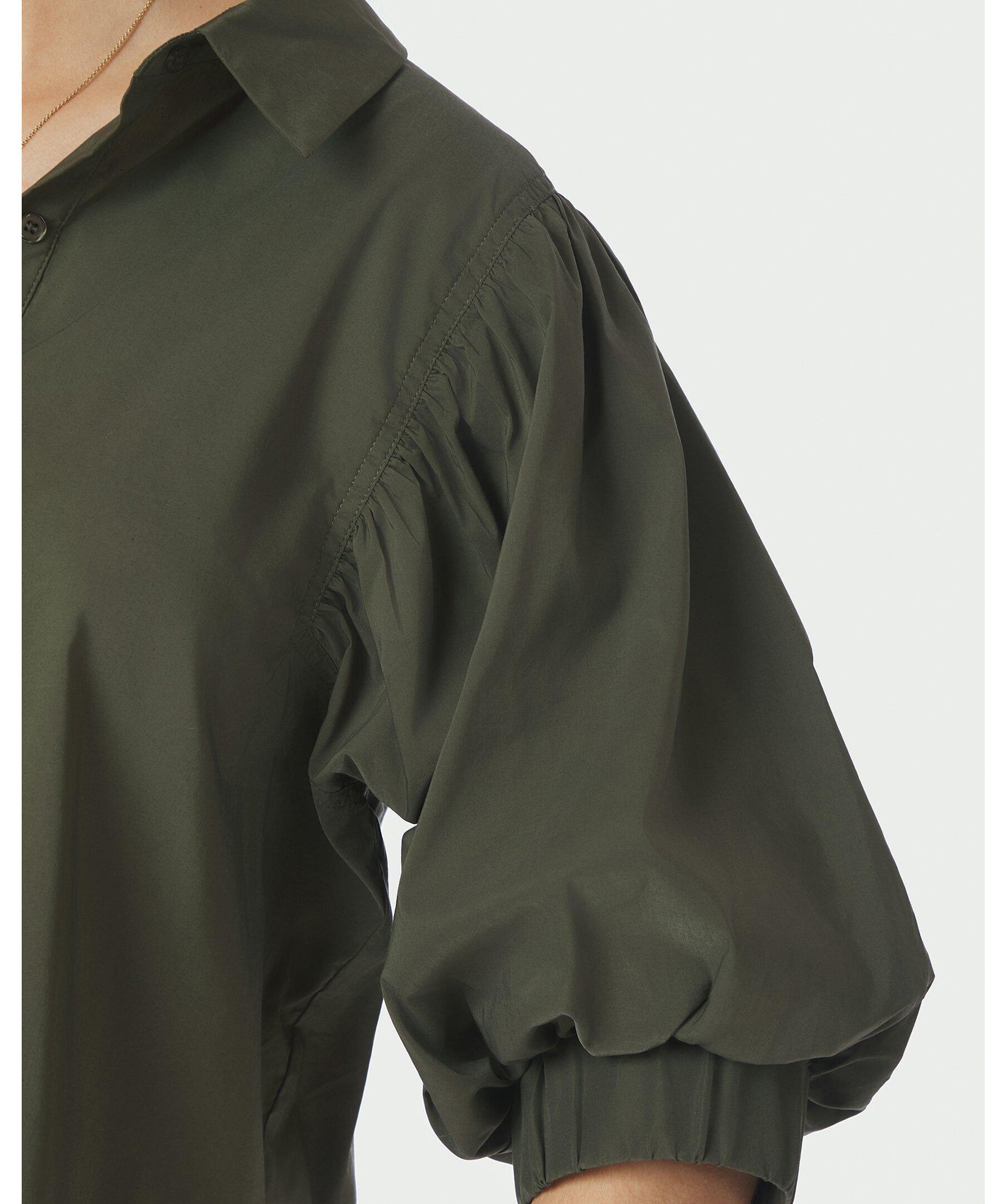 Mörkgrön skjorta med korta puffärmar och knappar fram. Modellen är 176 cm lång och bär storlek 36.