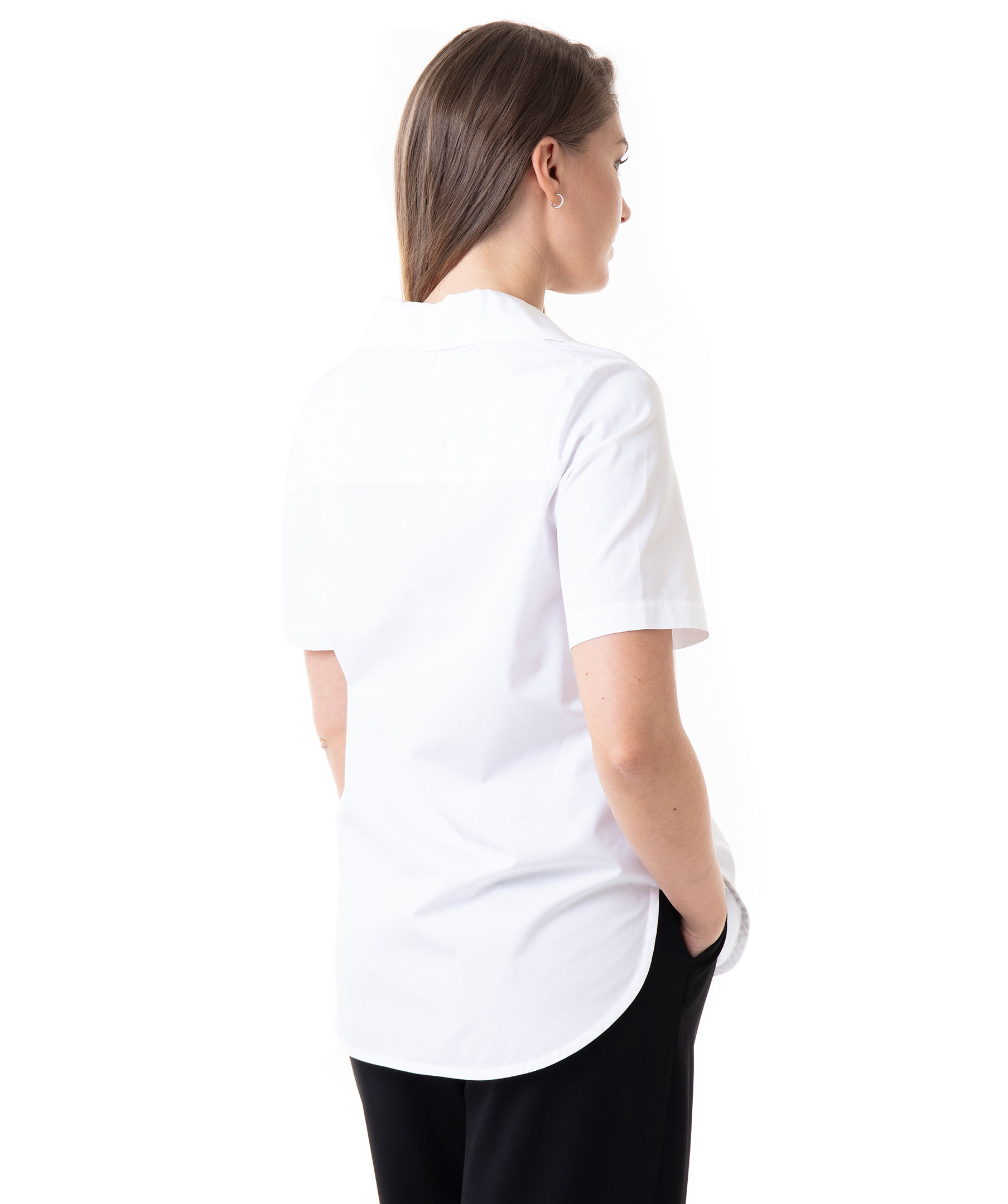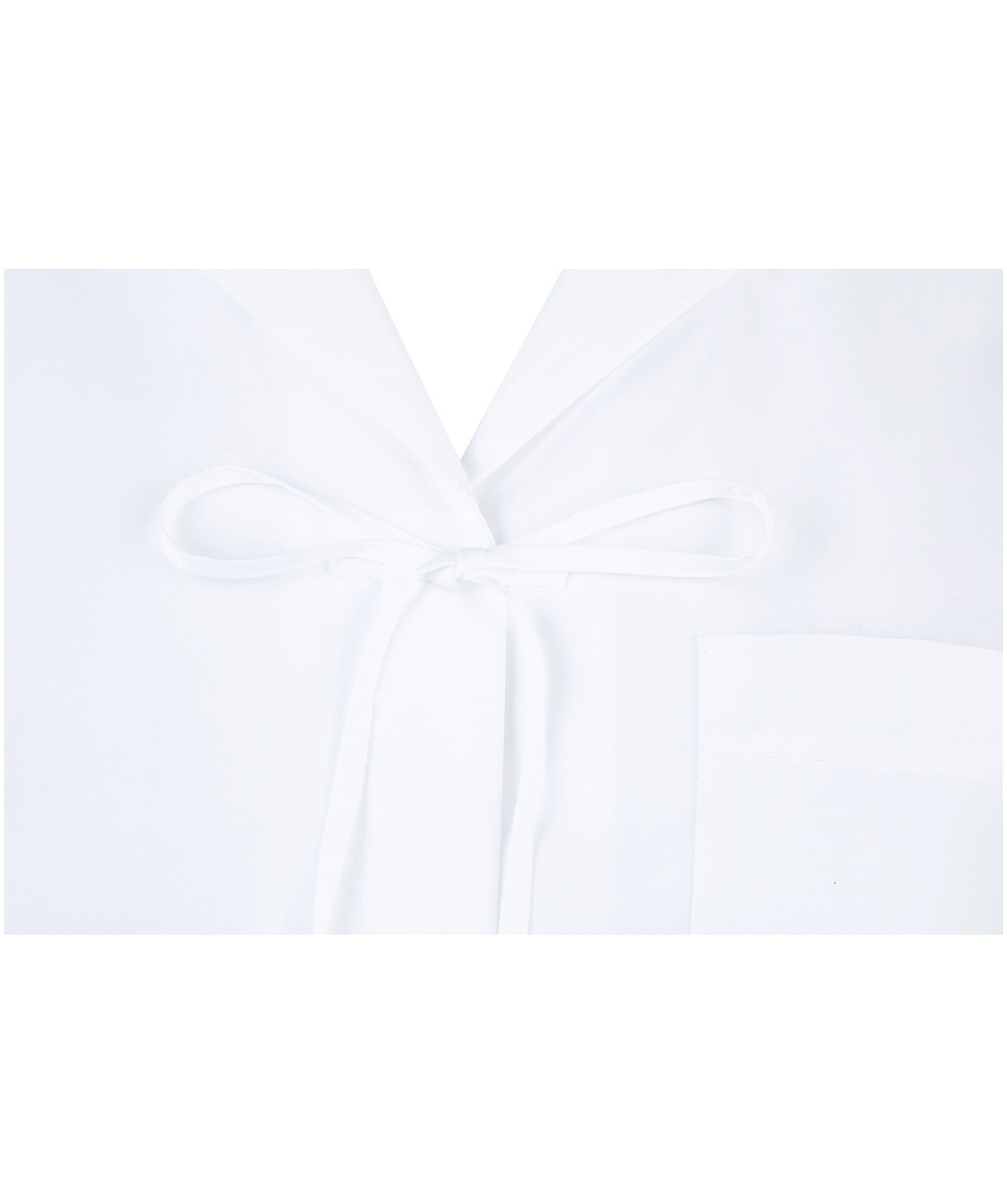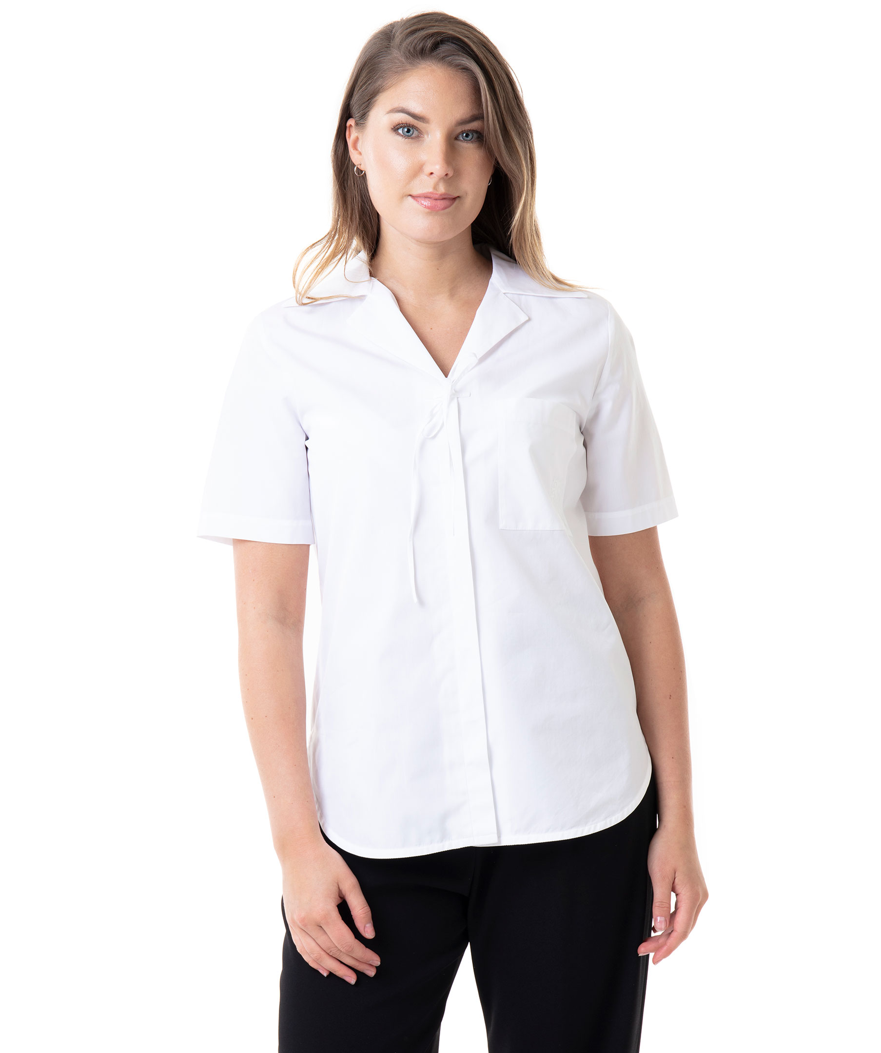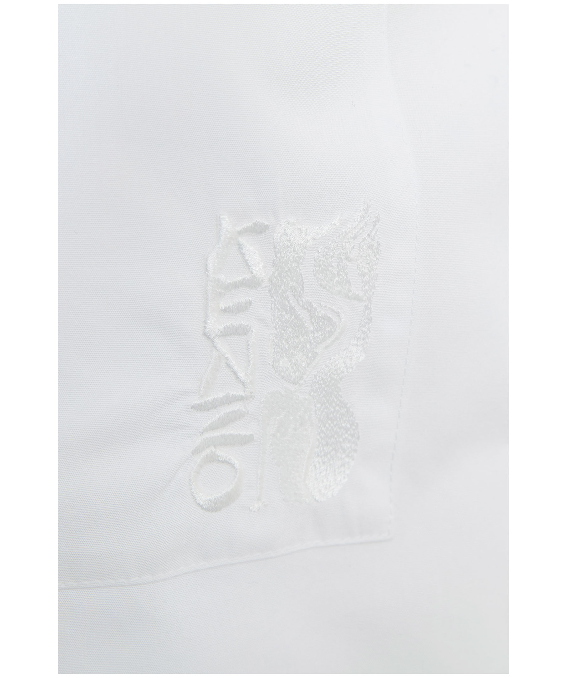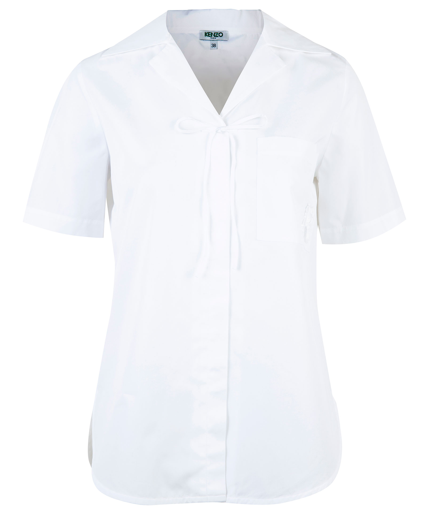Vit, kortärmad skjorta från Kenzo. Vid modell med dold knäppning och tunn rosett upptill. Ficka på bröstet med broderad logotyp och sjöjungfru i samma färg som skjortan. Skjortan har en fin bred krage och det går upp på sidorna längst ner. Modellen är 175 cm lång och bär storlek C38.