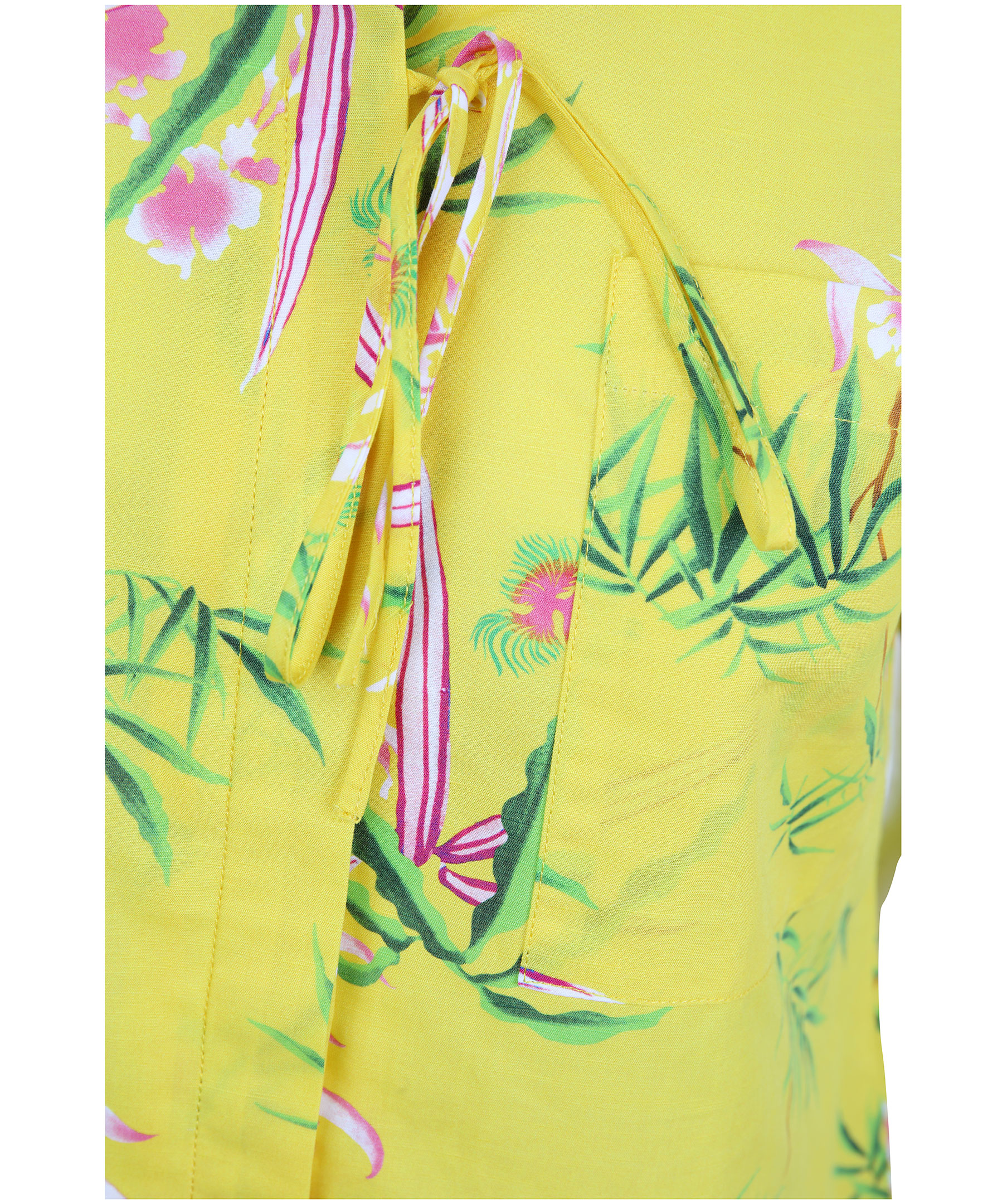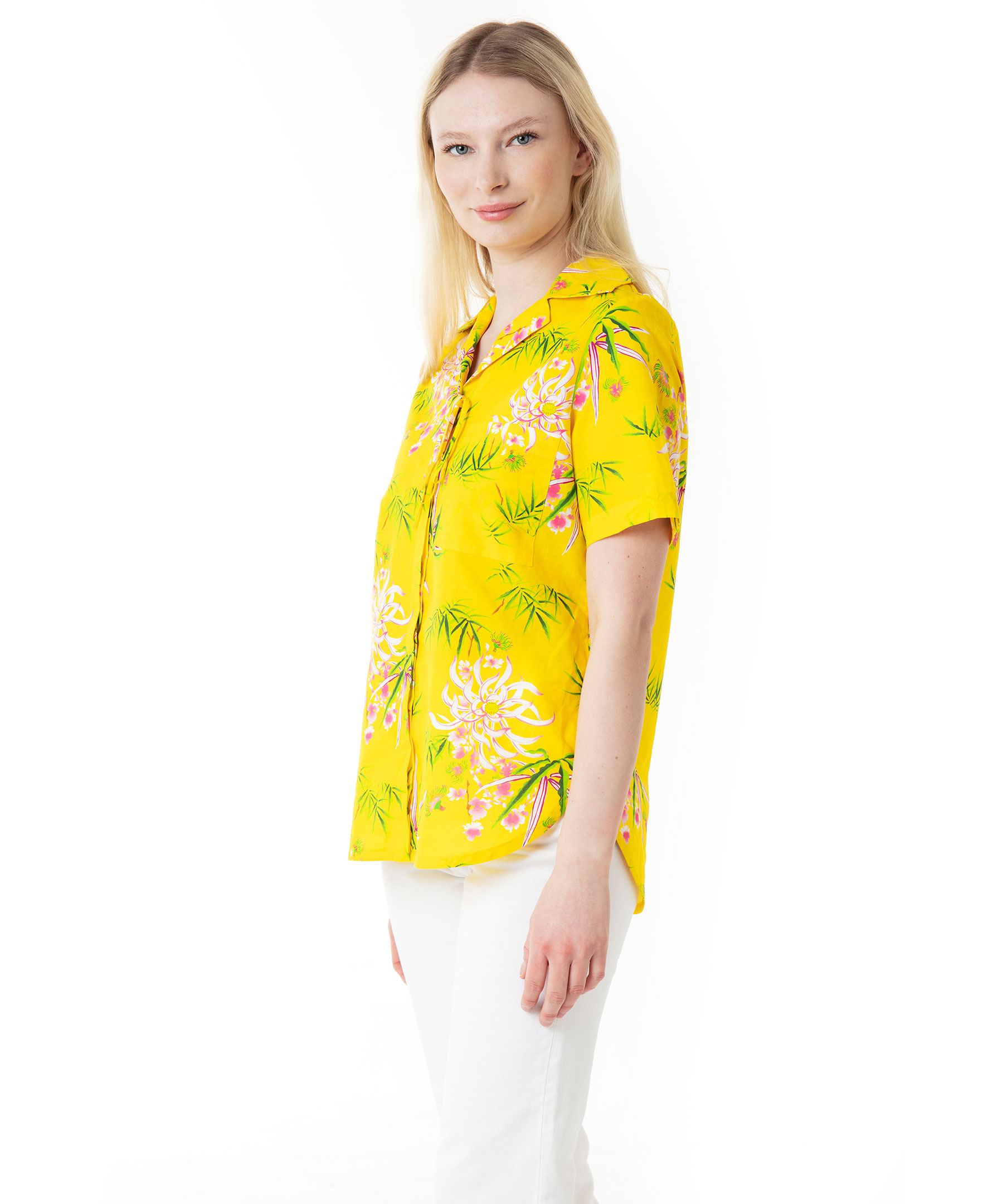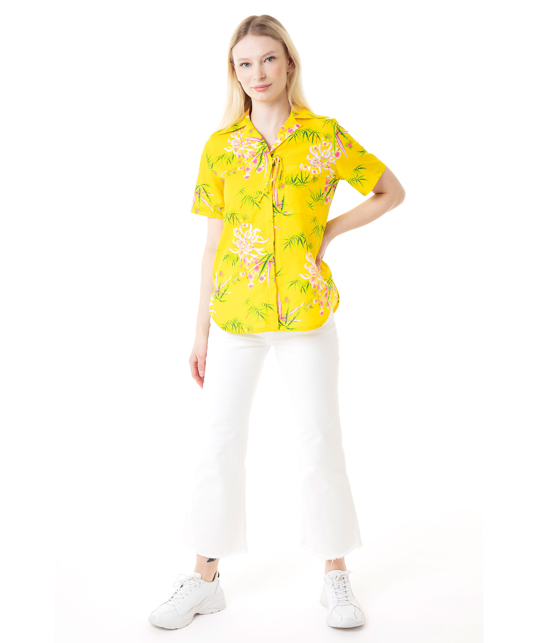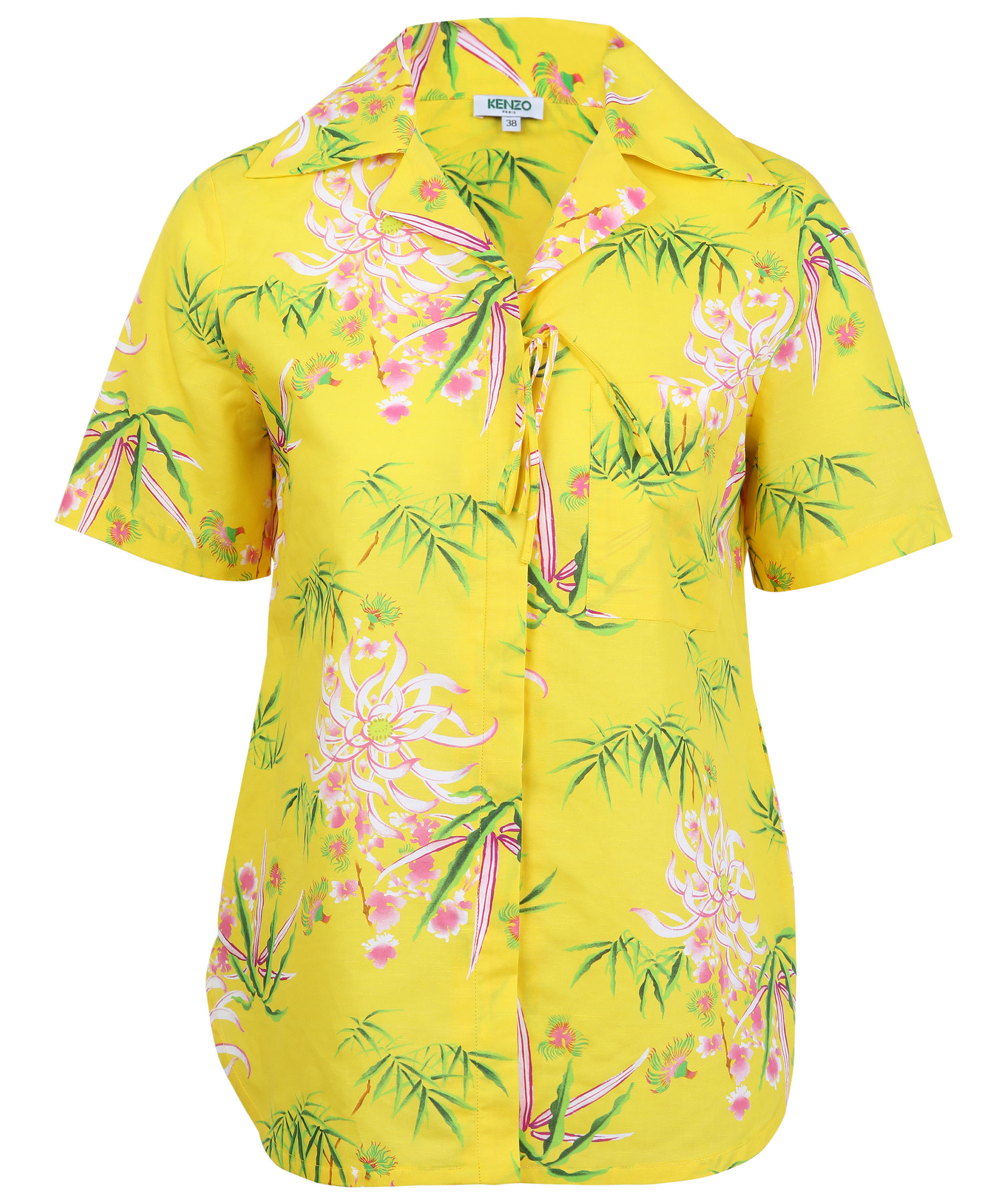 Gul, mönstrad och kortärmad skjorta från Kenzo. Vid modell med dold knäppning och tunn rosett upptill. Ficka på bröstet. Skjortan har en fin bred krage och det går upp på sidorna längst ner. Tillverkad i bommul och linneblandning. Modellen är 174 cm lång och bär storlek 38.