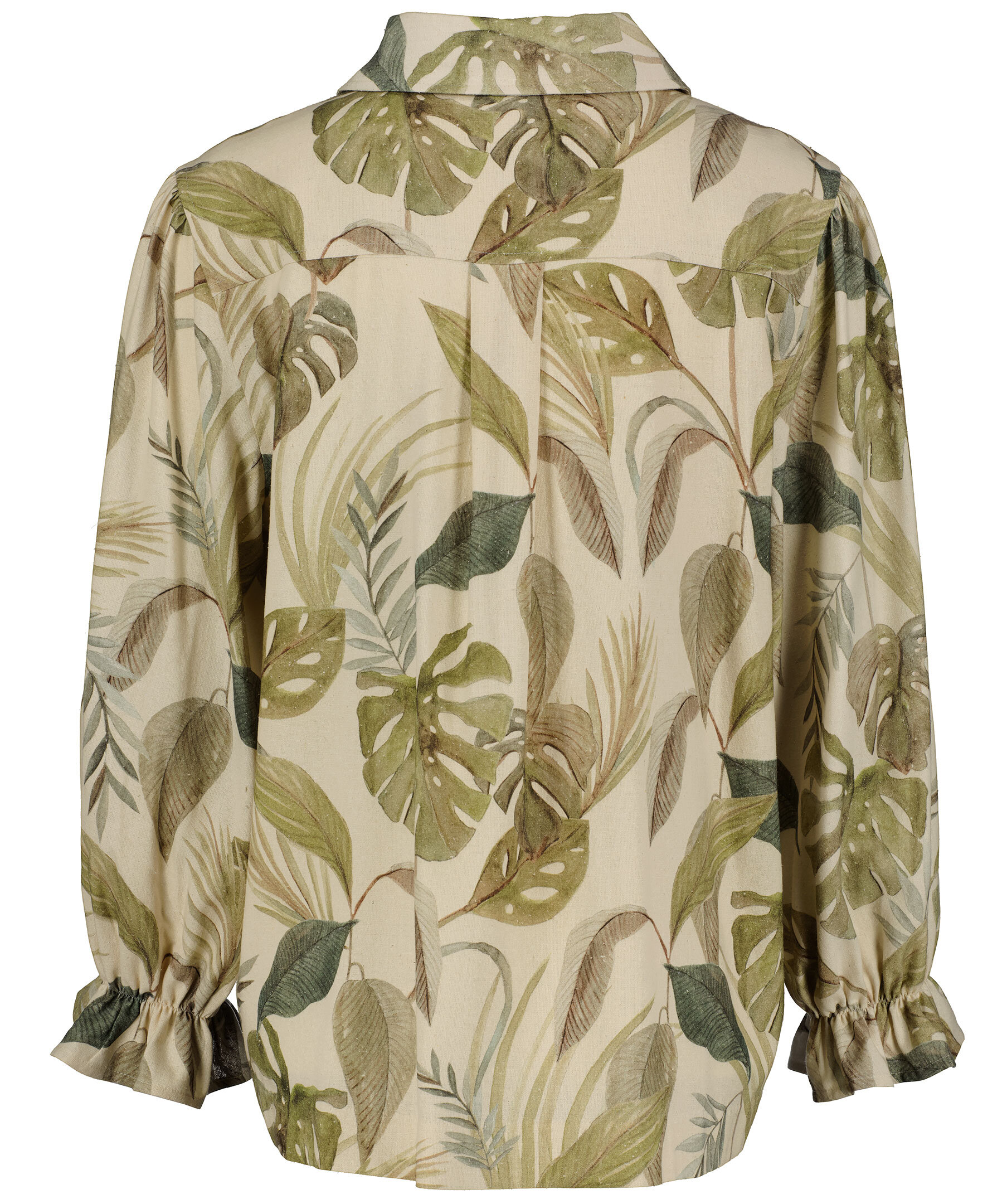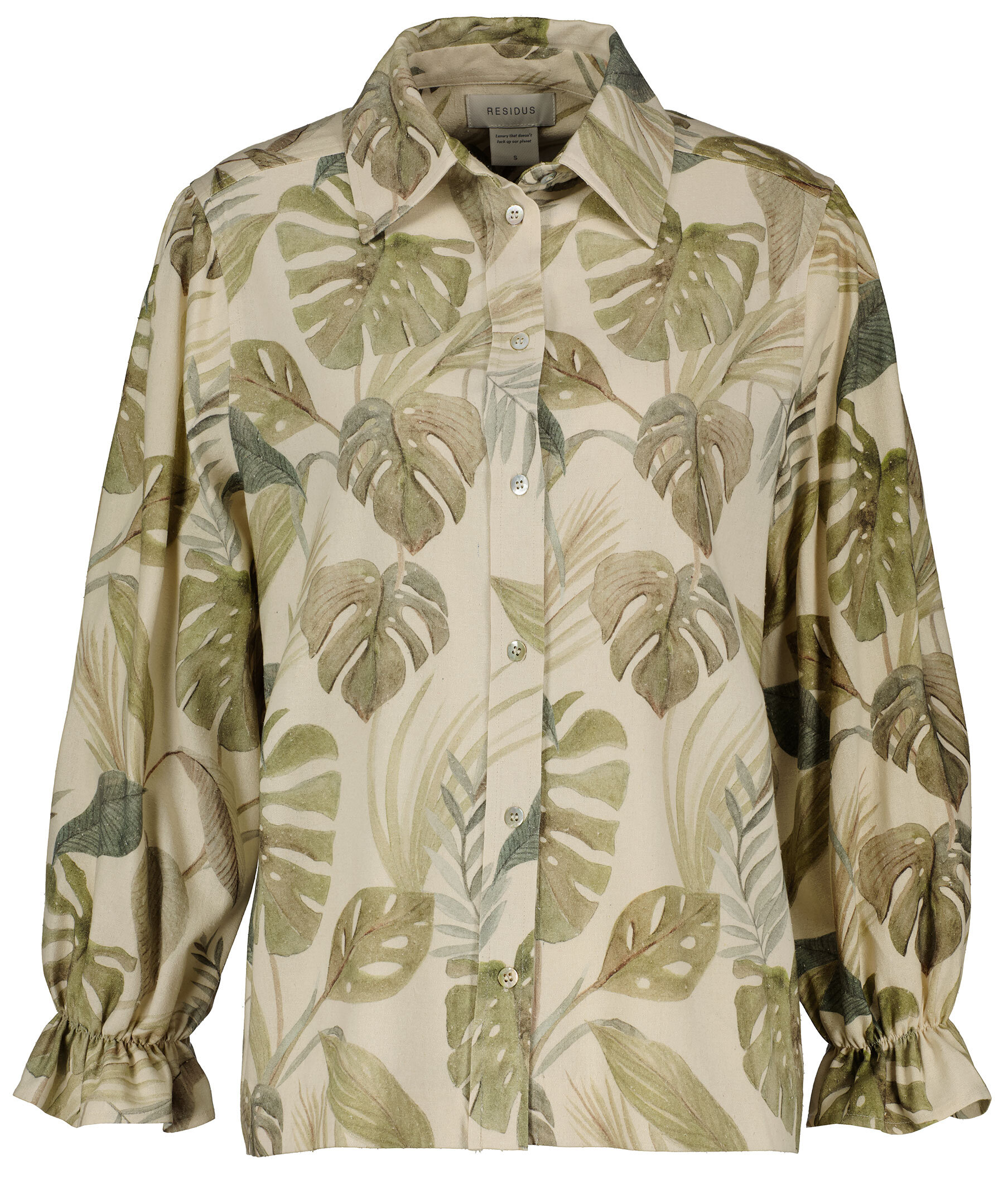 Mönstrad, avslappnad skjorta i överbliven silke från Residus. Spetsig krage, pärlemorknappar hela vägen fram och mudd med volang i ärmslut. Ljusbeige bas och gröna blad i olika varianter.