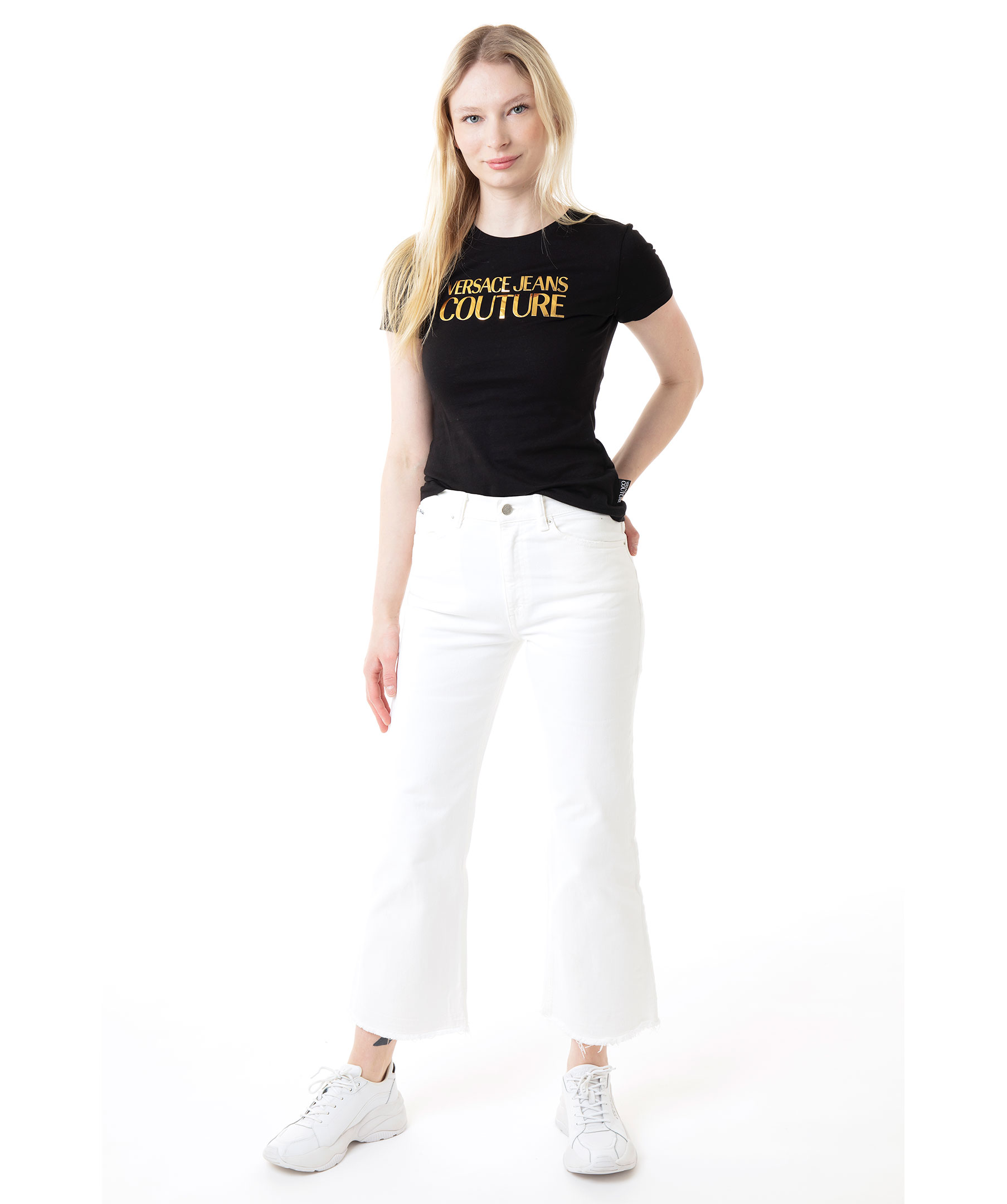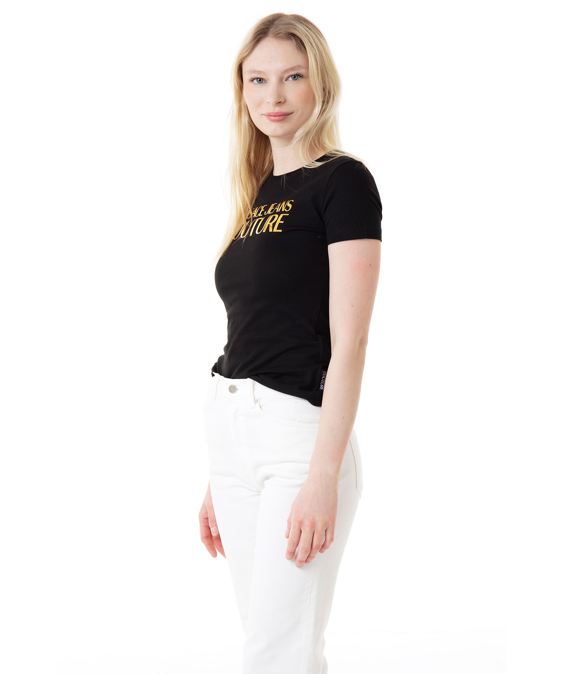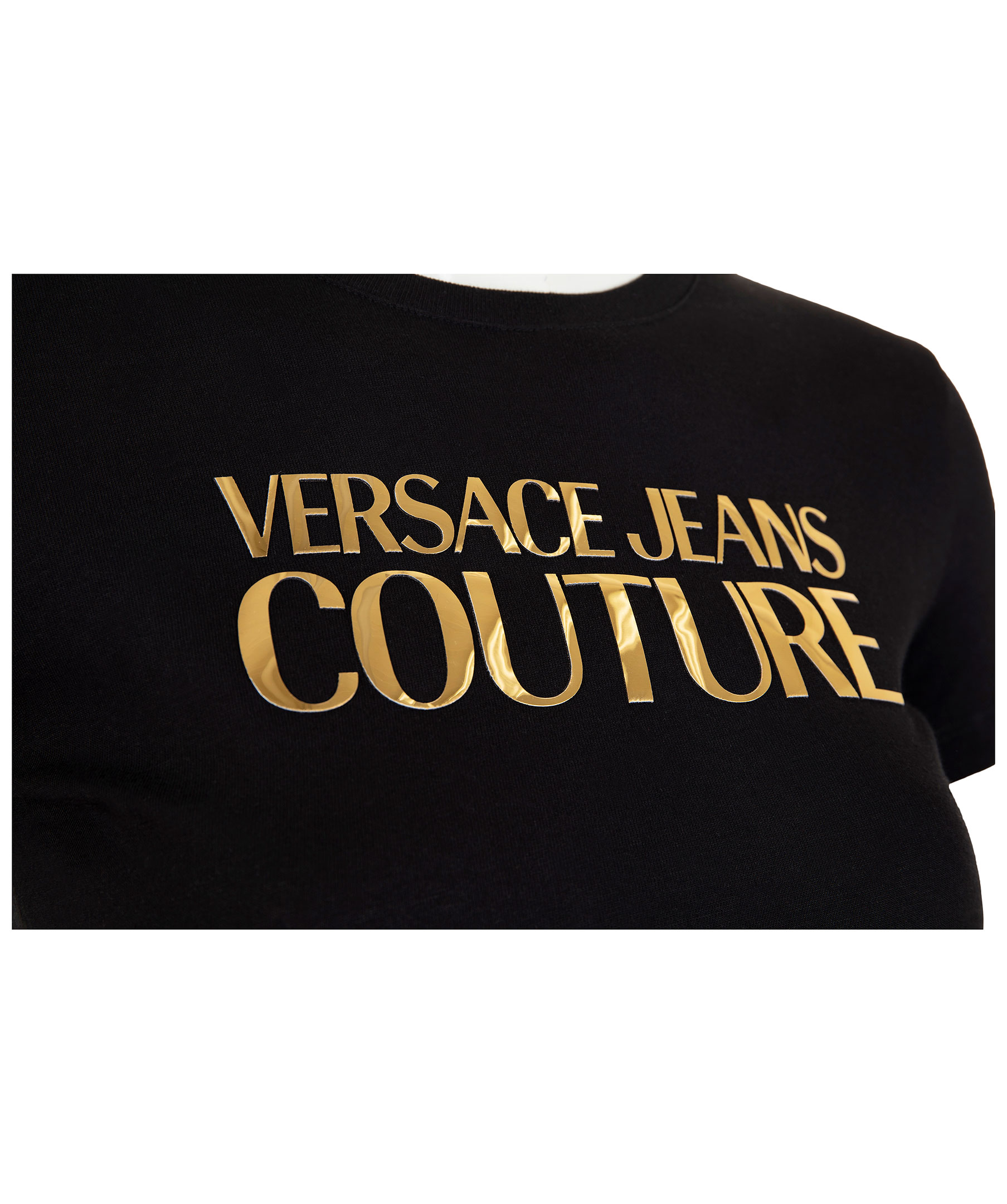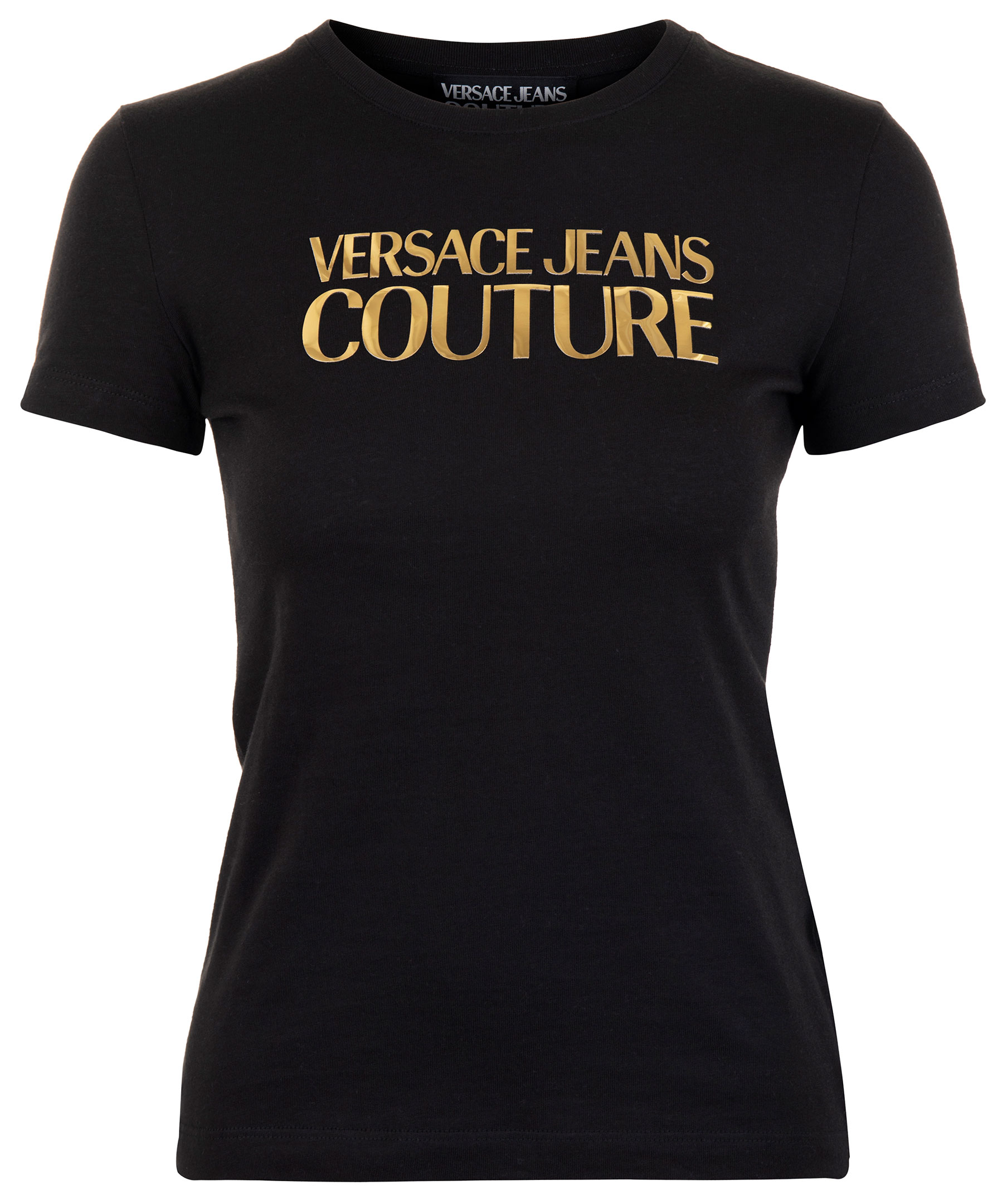 Svart t-shirt från Versace Jeans Couture. Stor guldfärgad logotyp på bröstet. Rundad halsringning. Tillverkad i bomull. Modellen är 174 cm lång och bär storlek S.