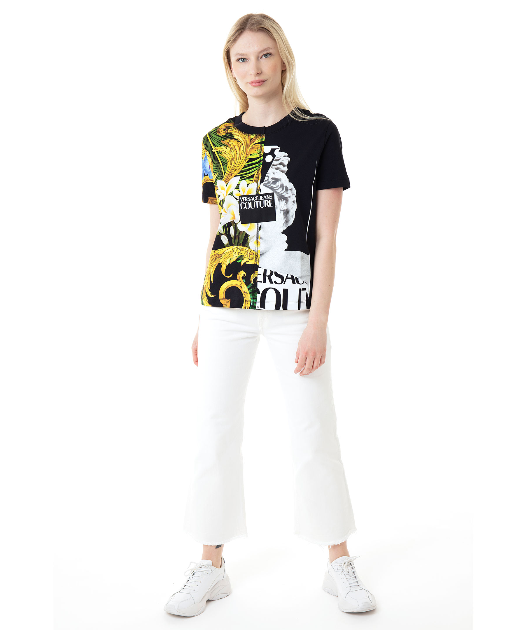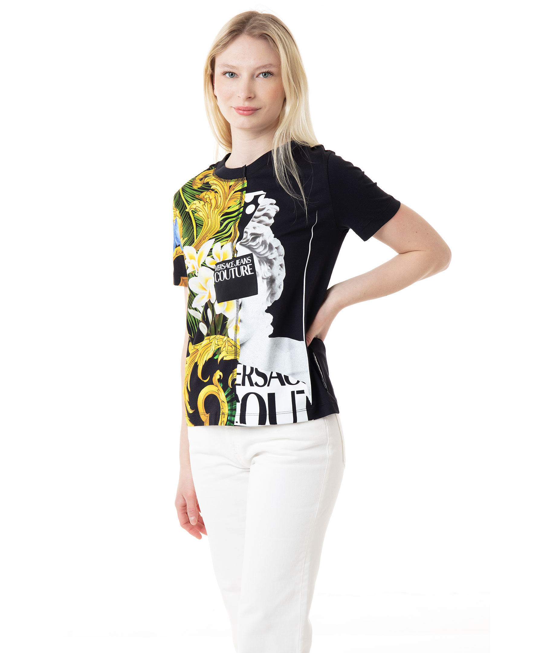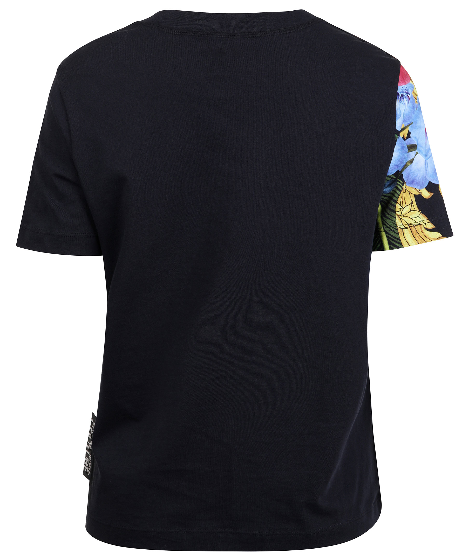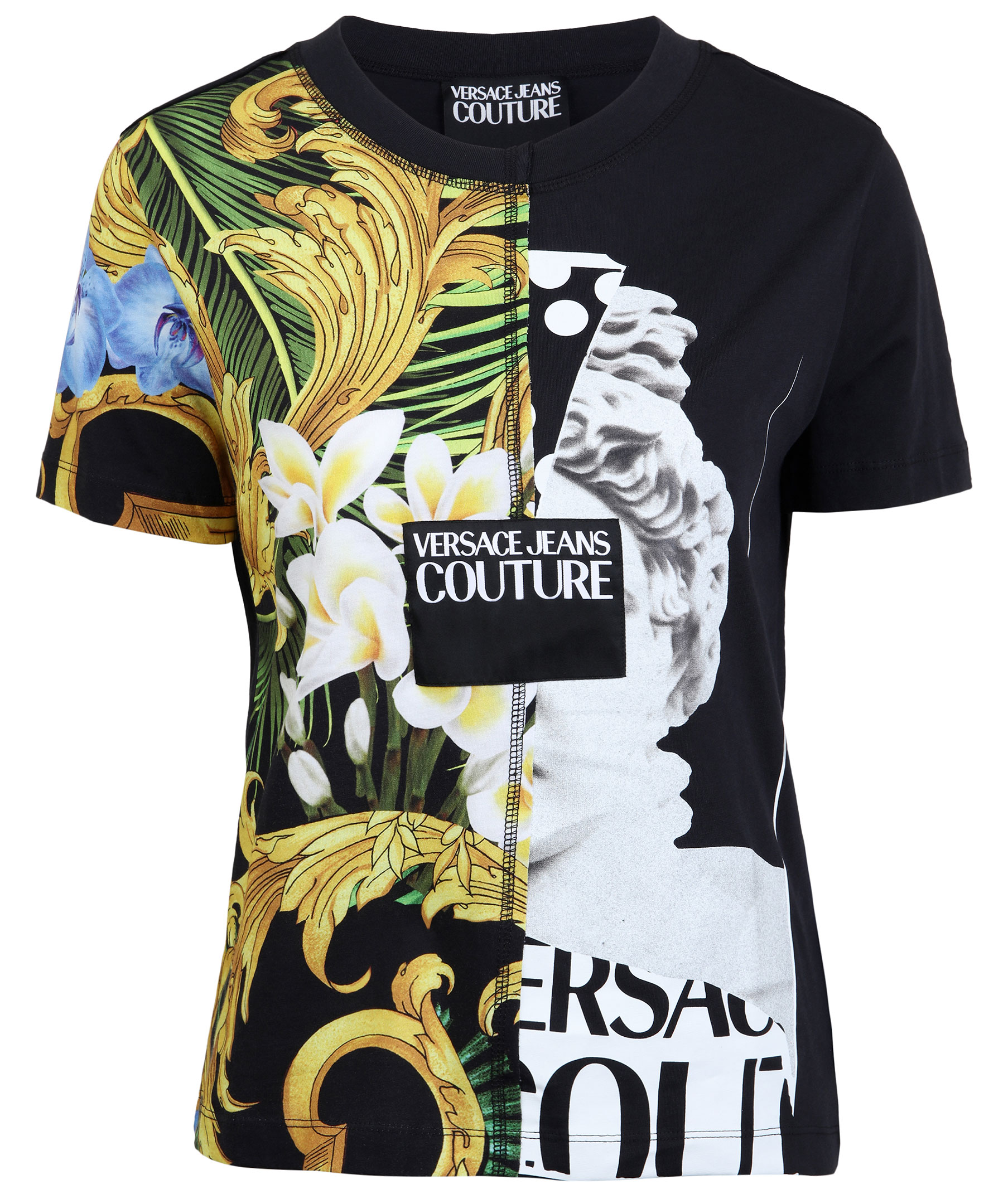 Svart, mönstrad t-shirt från Versace Jeans Couture. Rundad halsringning, tvådelad framsida med olika mönster. Stor lapp på sidan med vit logotyp. Tillverkad i 100% bomull. Modellen är 174 cm lång och bär storlek M.